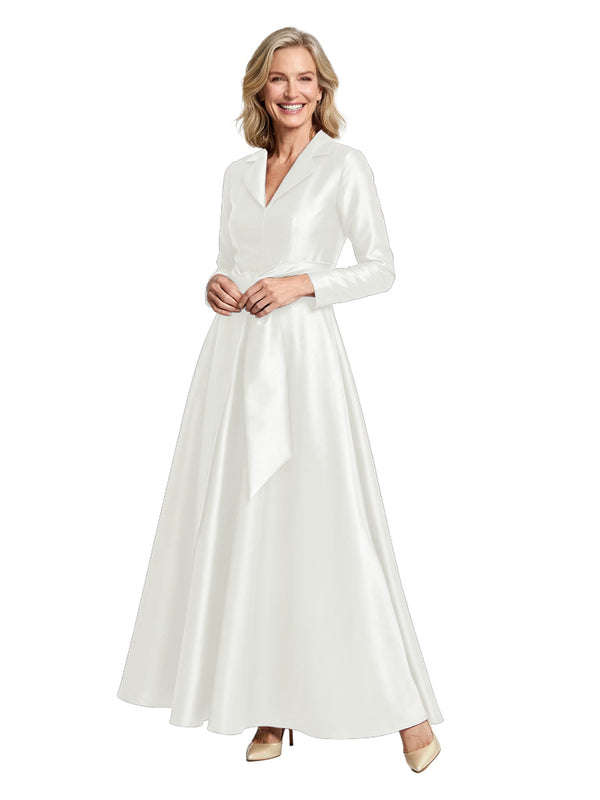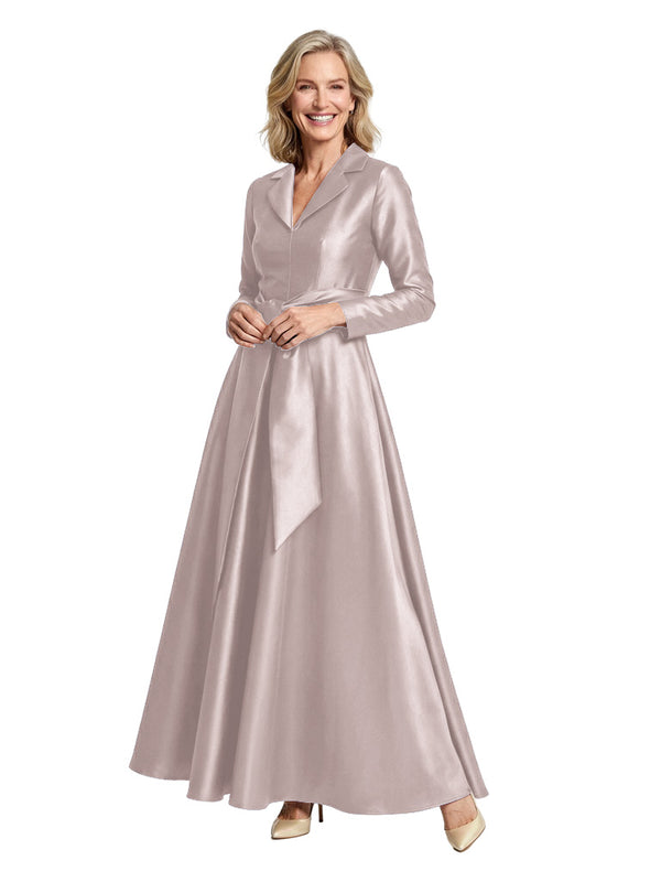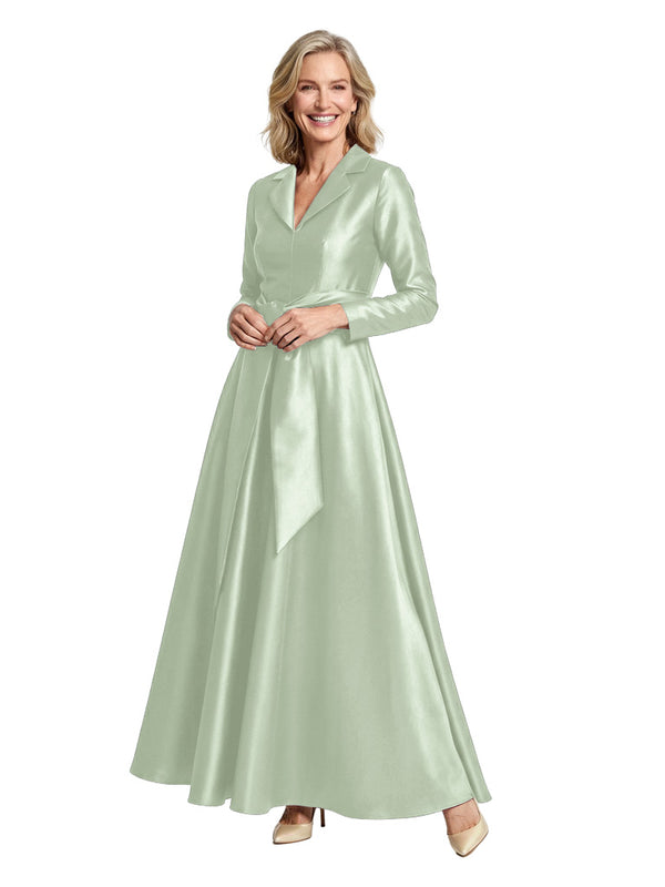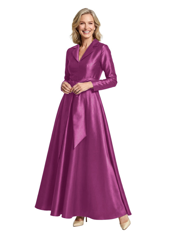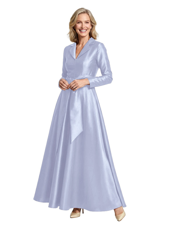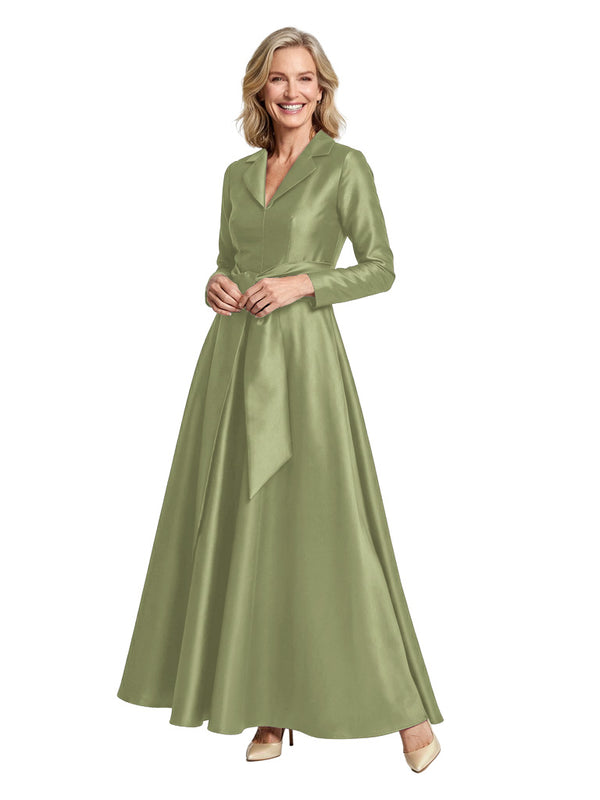 Classy V-Neck Long Sleeves Satin Mother of The Bride Dress With Sash Tie Waist