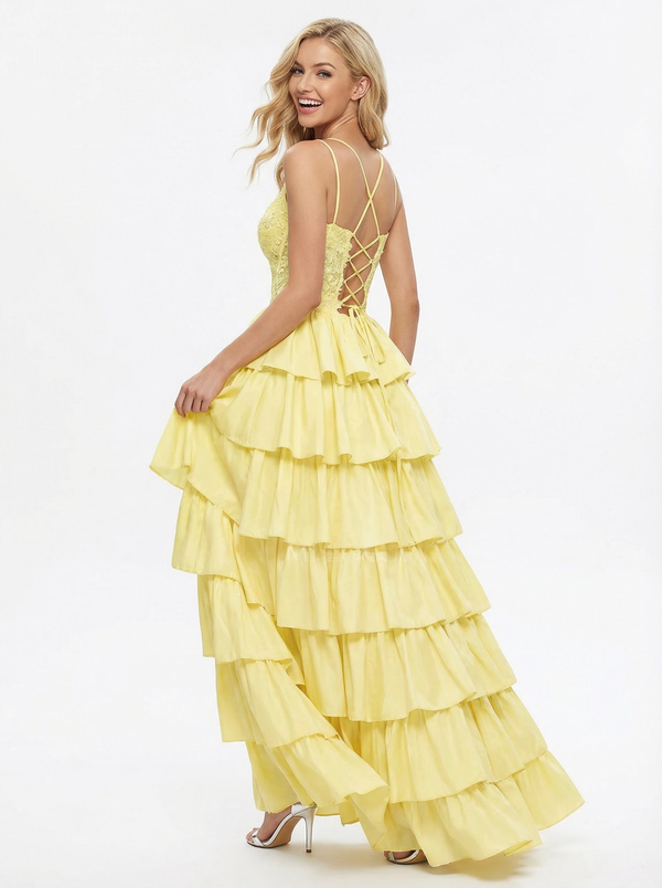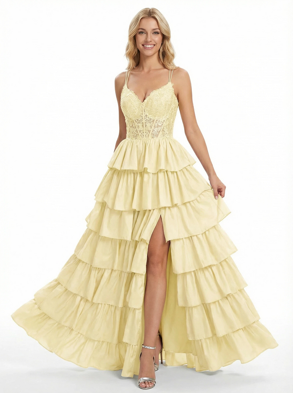 Sweet Spaghetti Straps V-neck A-line Side Slit Long Evening Prom Dresses with Ruffle - ChicSew – ChicSew