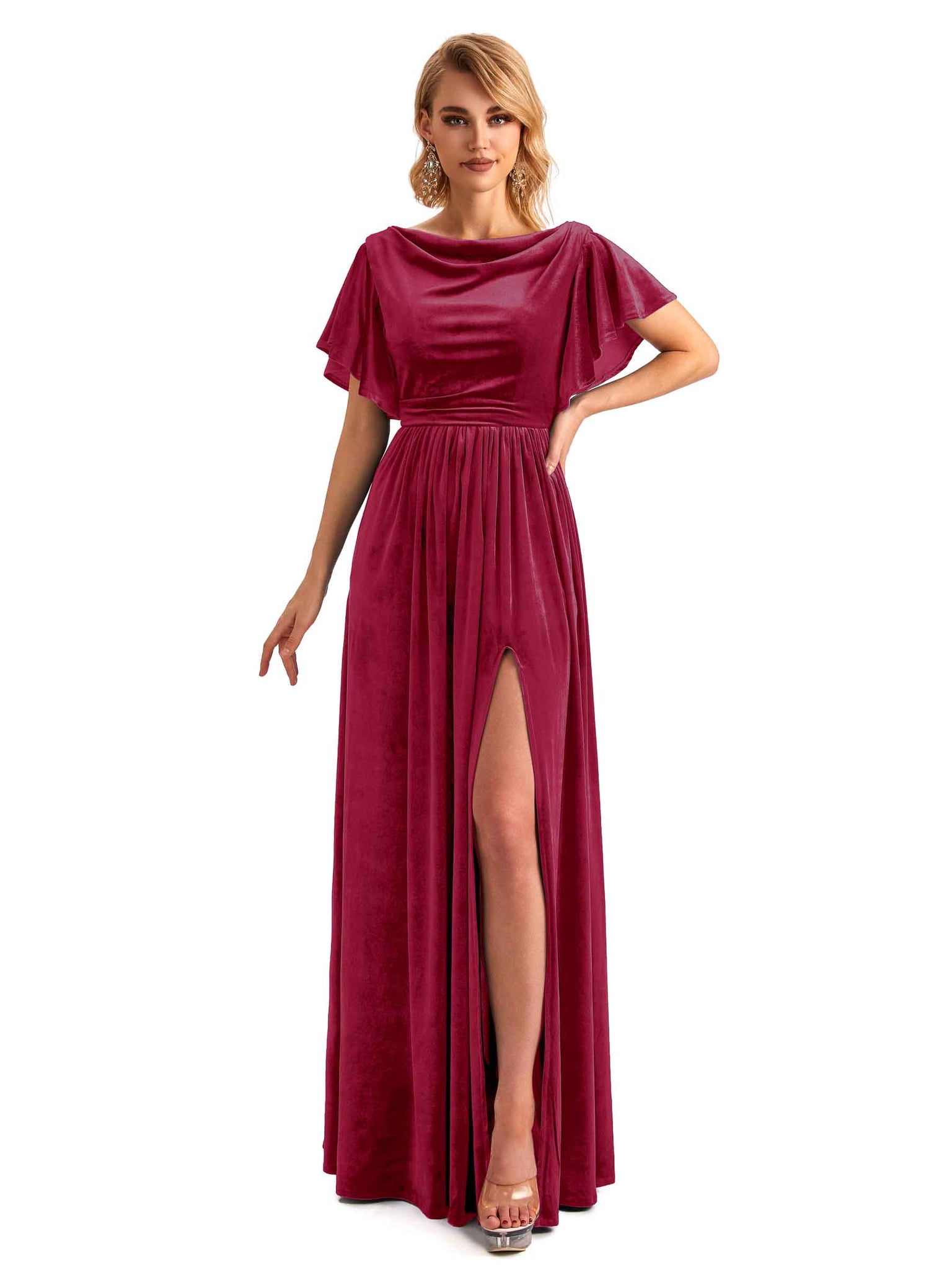 Elegant A-line Jewel Bat Sleeves Velvet Side Slit Long Bridesmaid Dresses $118.99