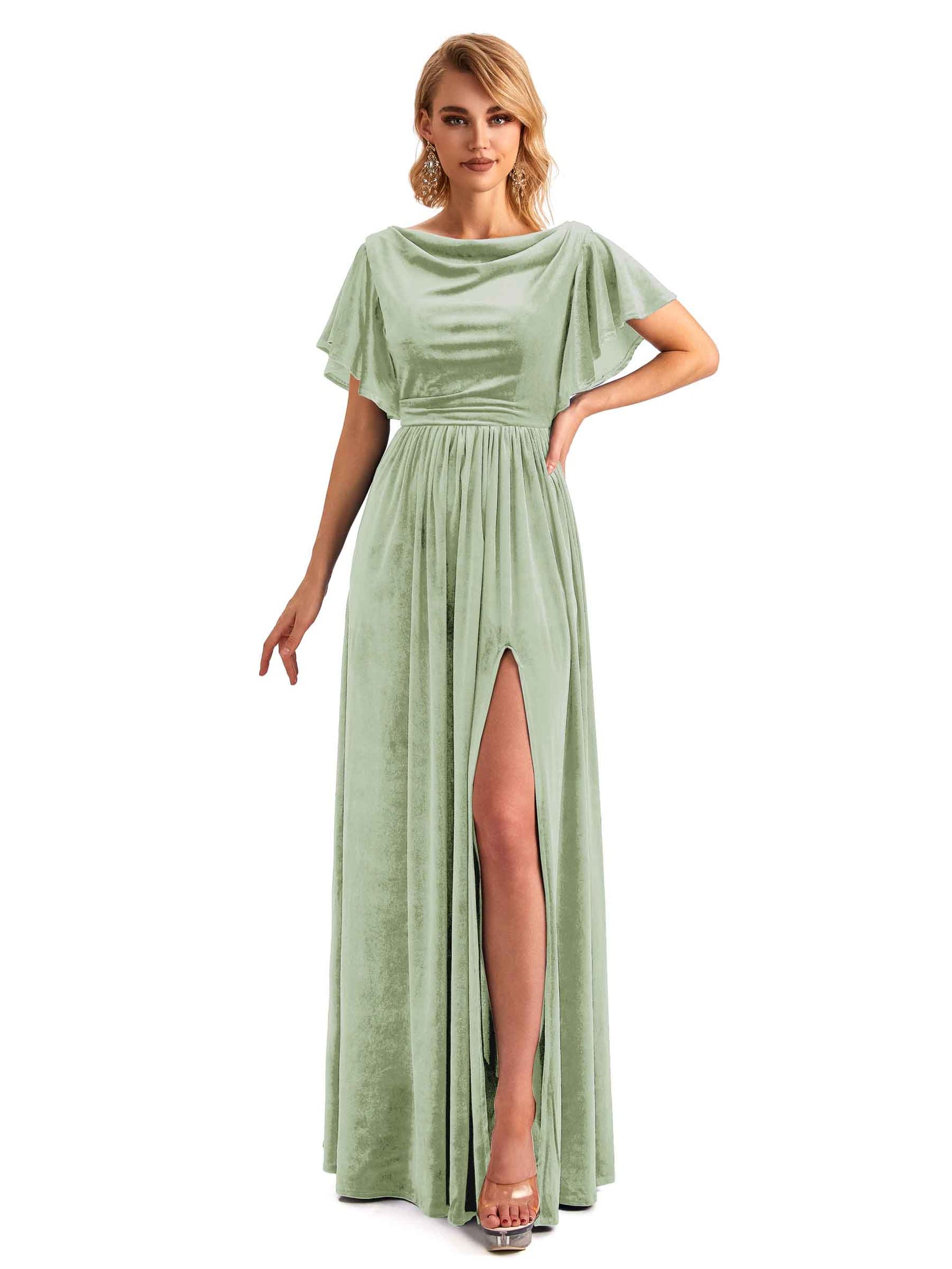 Elegant A-line Jewel Bat Sleeves Velvet Side Slit Long Bridesmaid Dresses