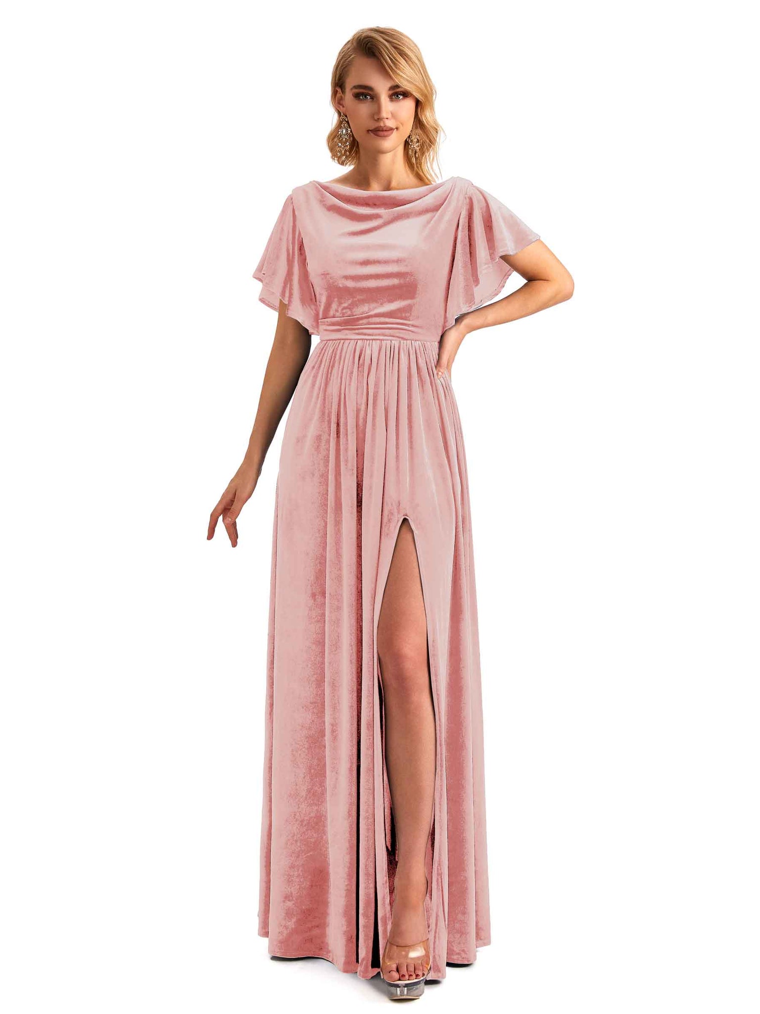 Elegant A-line Jewel Short Sleeves Velvet Side Slit Long Bridesmaid Dresses - ChicSew – ChicSew