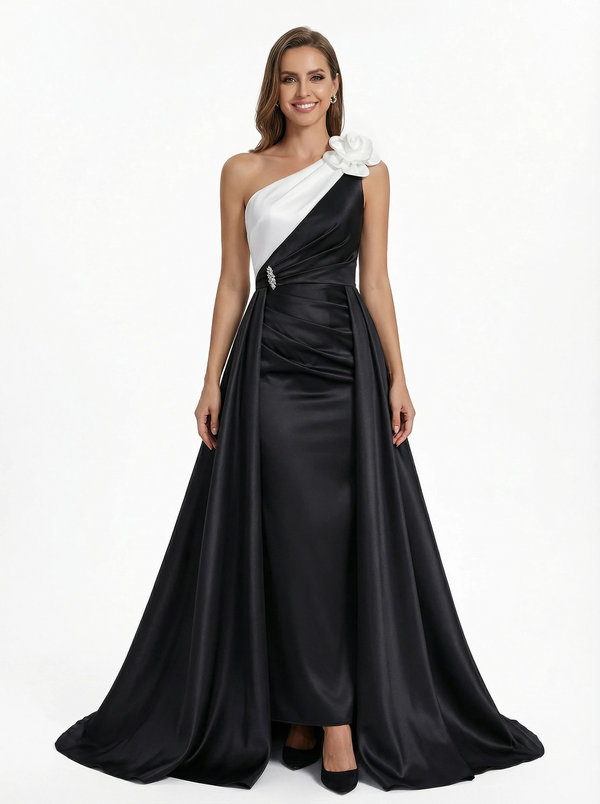 Elegant Black And White Satin One Shoulder A-Line Long Mother Of The Bride Dresses - ChicSew – ChicSew