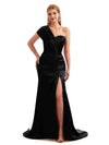 Elegant Black Long One-Shoulder Satin Bridesmaid Dresses $139.99