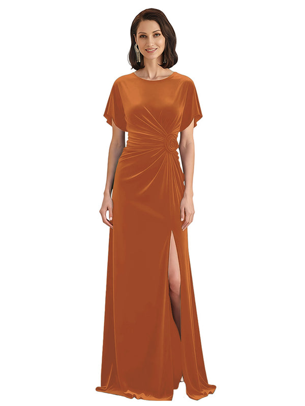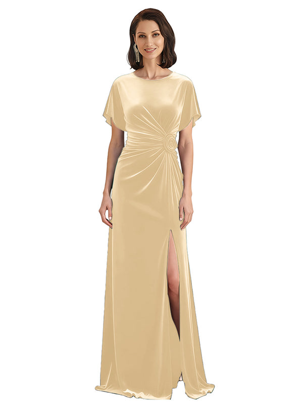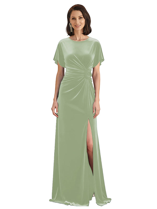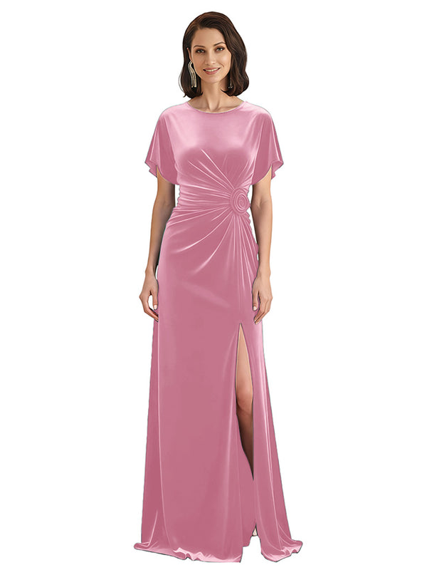 Elegant Jewel Short Sleeves Side Slit A-line Velvet Long Mother of The Dresses