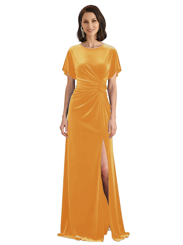 Elegant Jewel Short Sleeves Side Slit A-line Velvet Long Mother of The Dresses $139.99