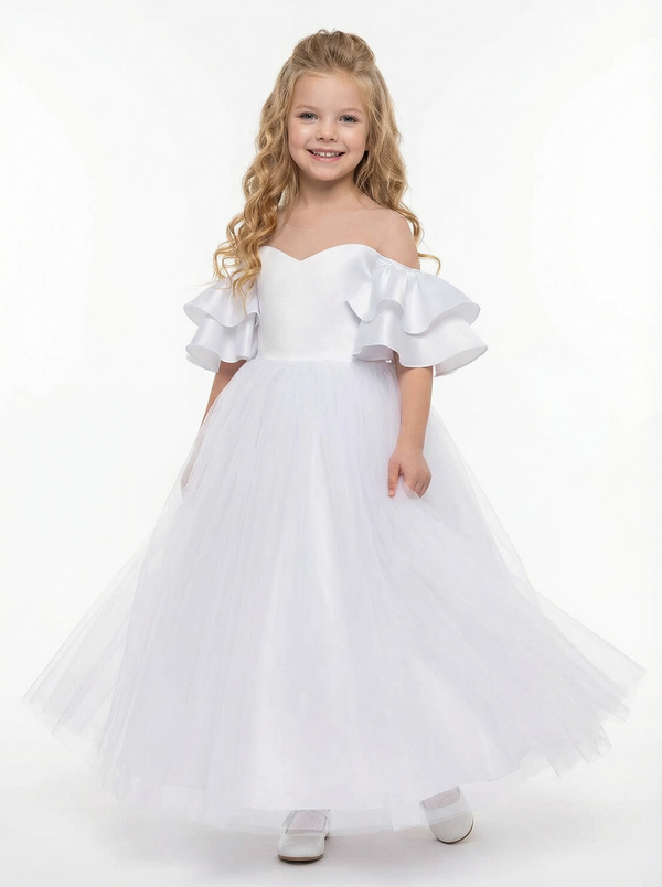 Elegant Off-Shoulder White Tulle Flower Girl Dress with Ruffled Sleeves and Full-Length Princess Skirt