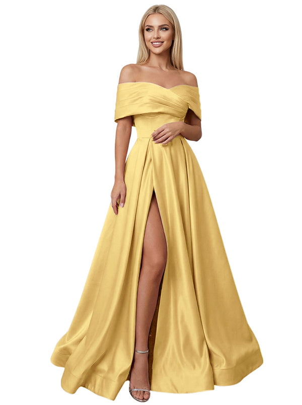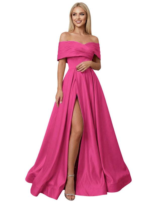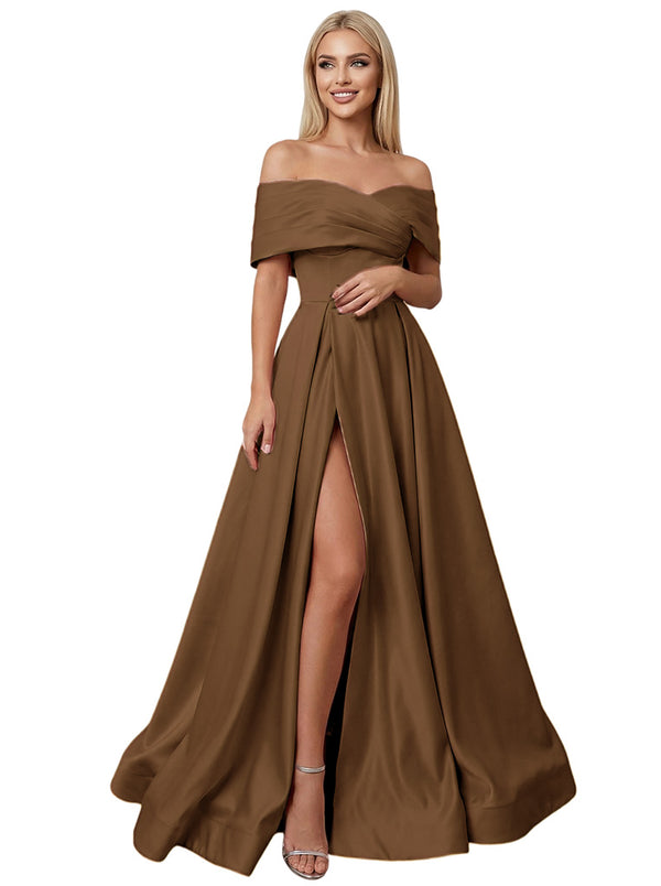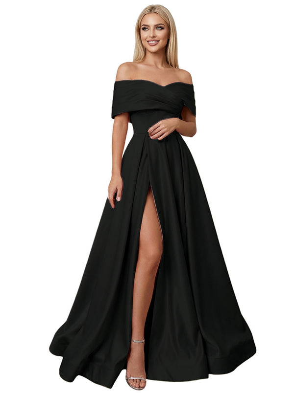 Elegant Off The Shoulder Satin A-Line Prom Gown With Side Slit - ChicSew – ChicSew