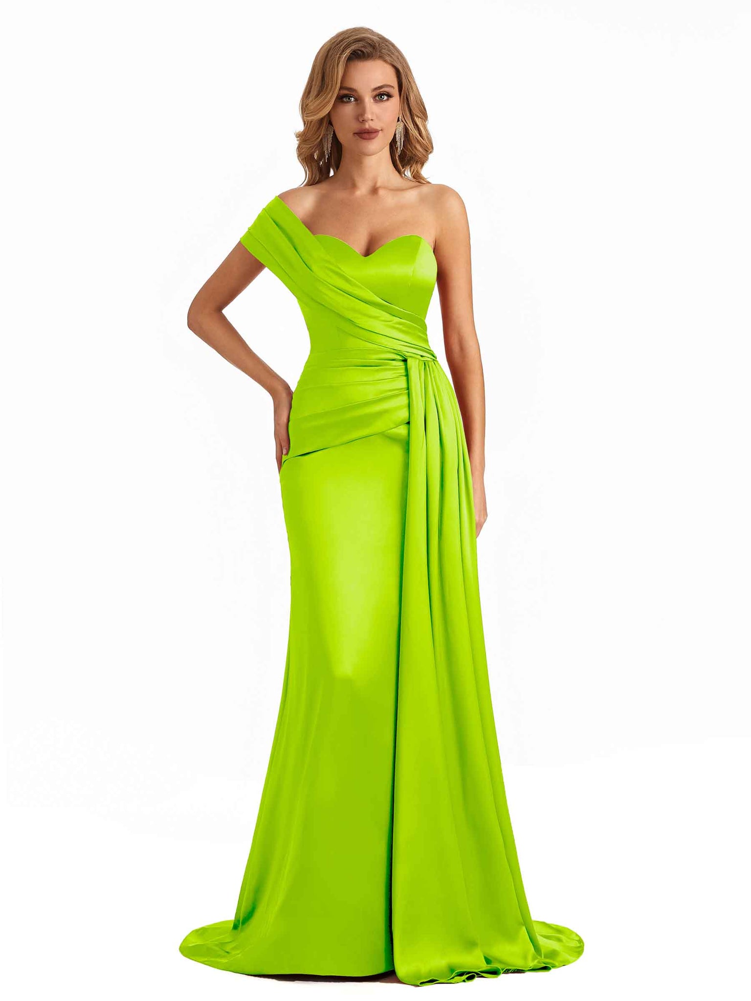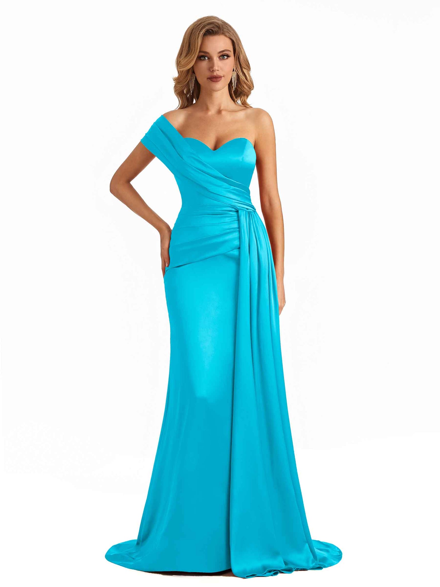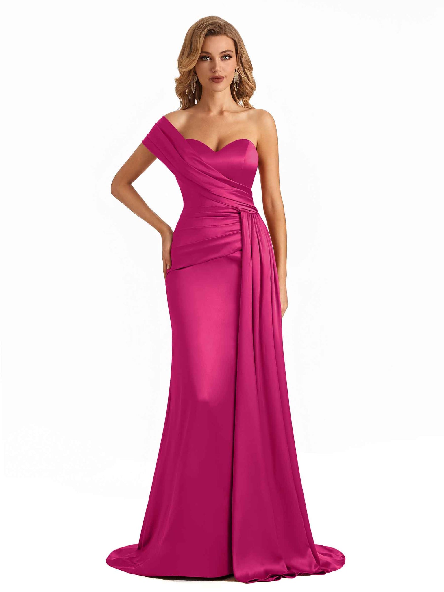 Elegant One Shoulder Pleats Soft Satin Long Sheath Bridesmaid Dresses Online - ChicSew – ChicSew