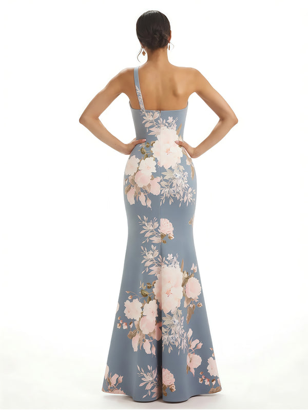 Elegant One Shoulder Side Slit Mermaid Floral Satin Maxi Floral Formal Dresses For Women
