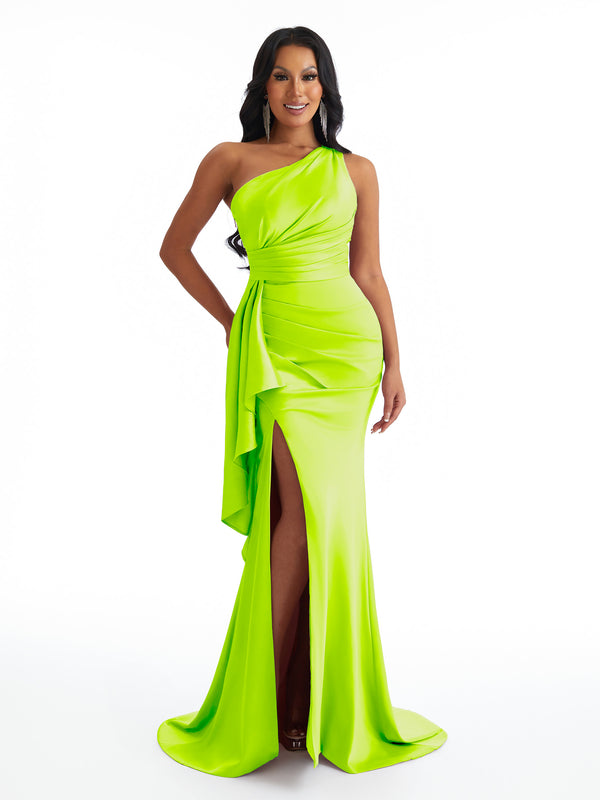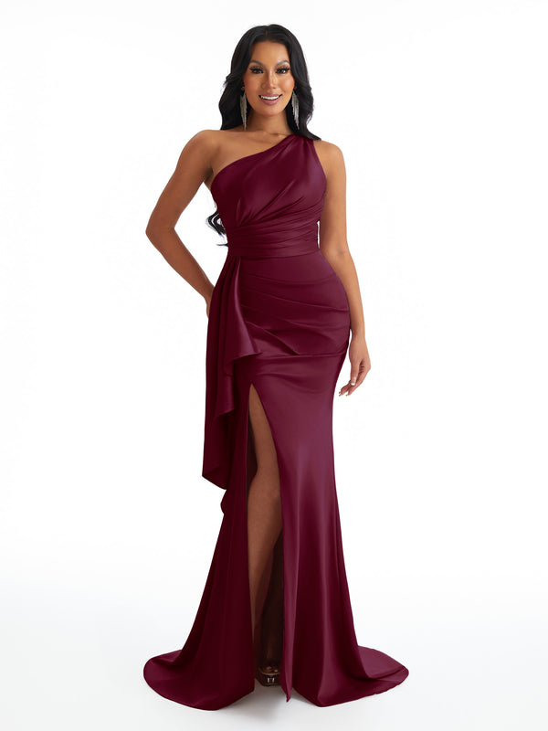 Elegant One Shoulder Side Slit Mermaid Soft Satin Long Bridesmaid Dresses - ChicSew – ChicSew