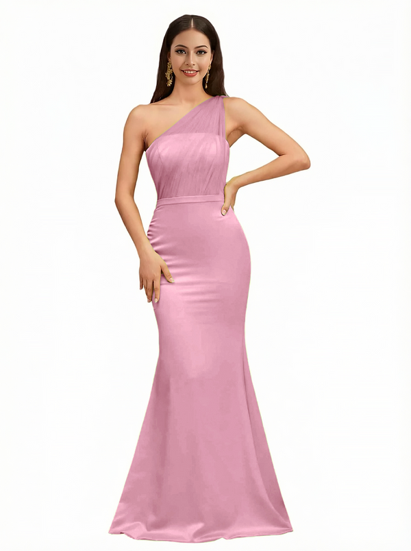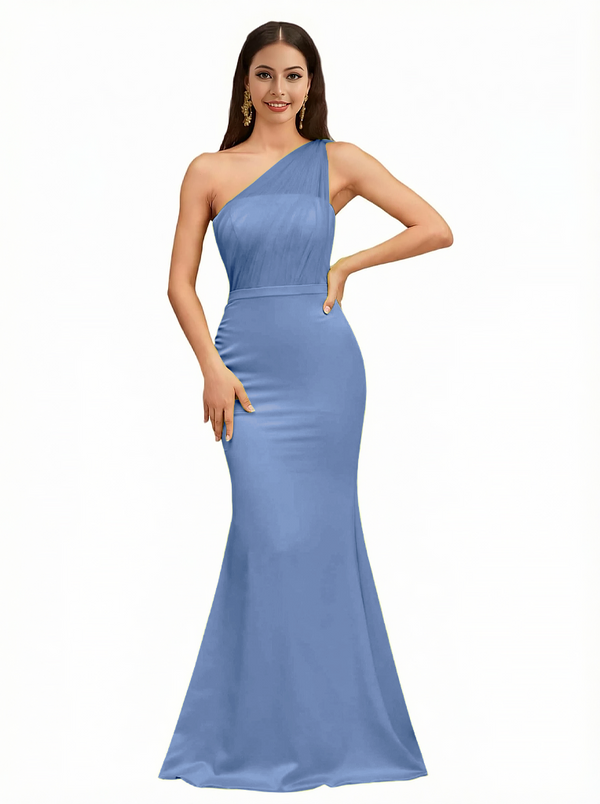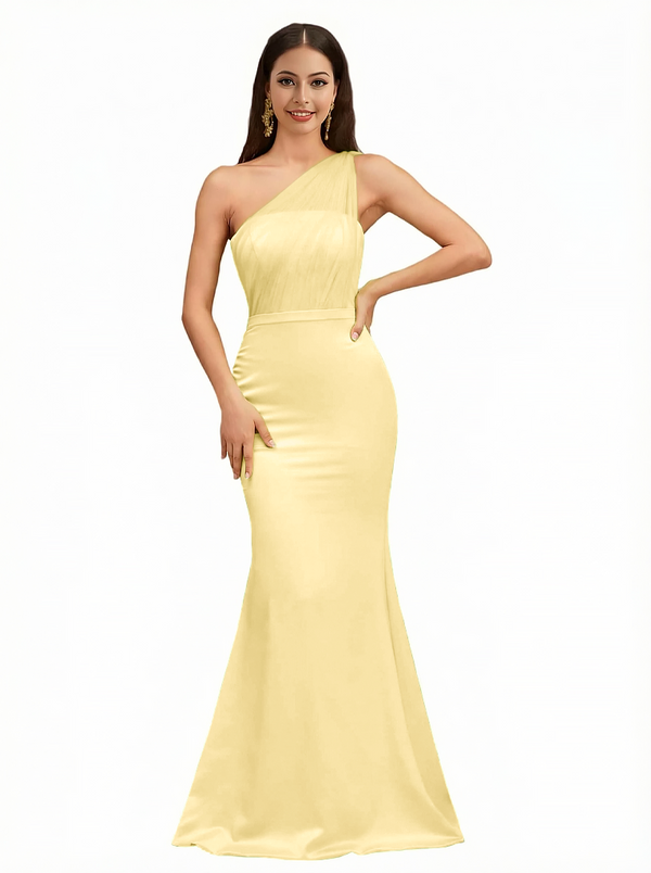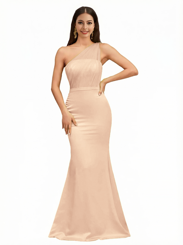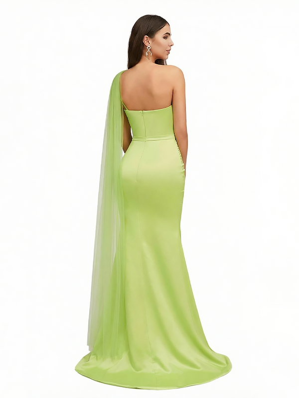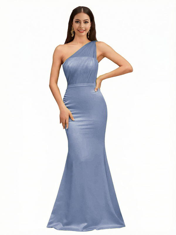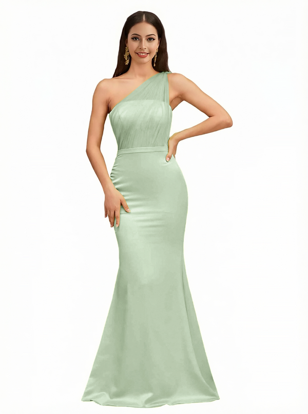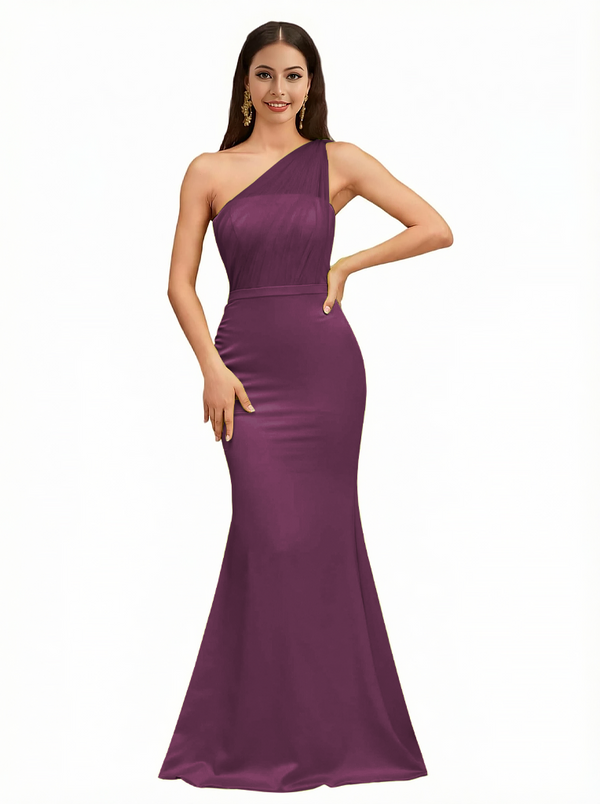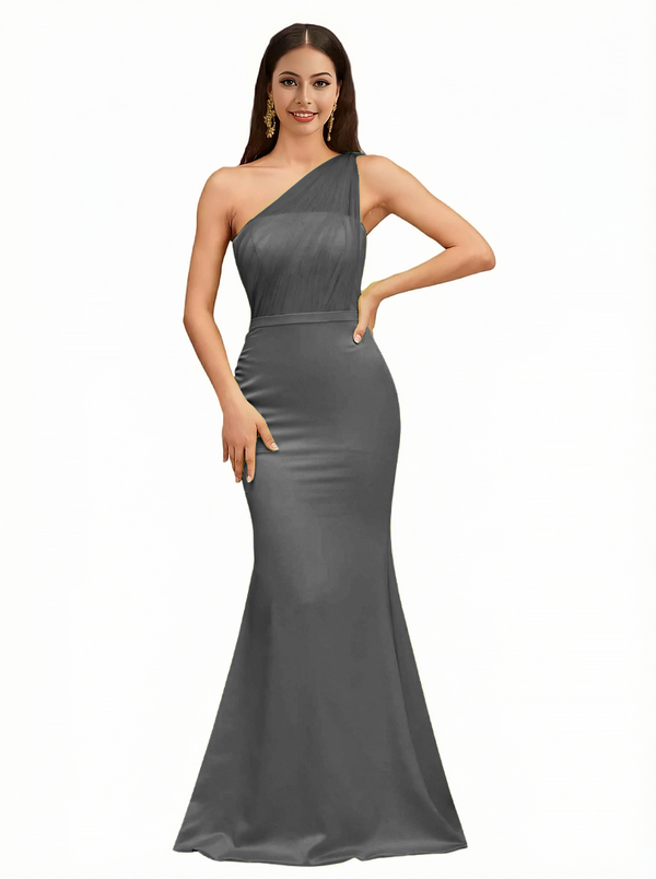 Elegant One Shoulder Silky Satin With Tulle Strap Mermaid Maxi Formal Evening Gowns