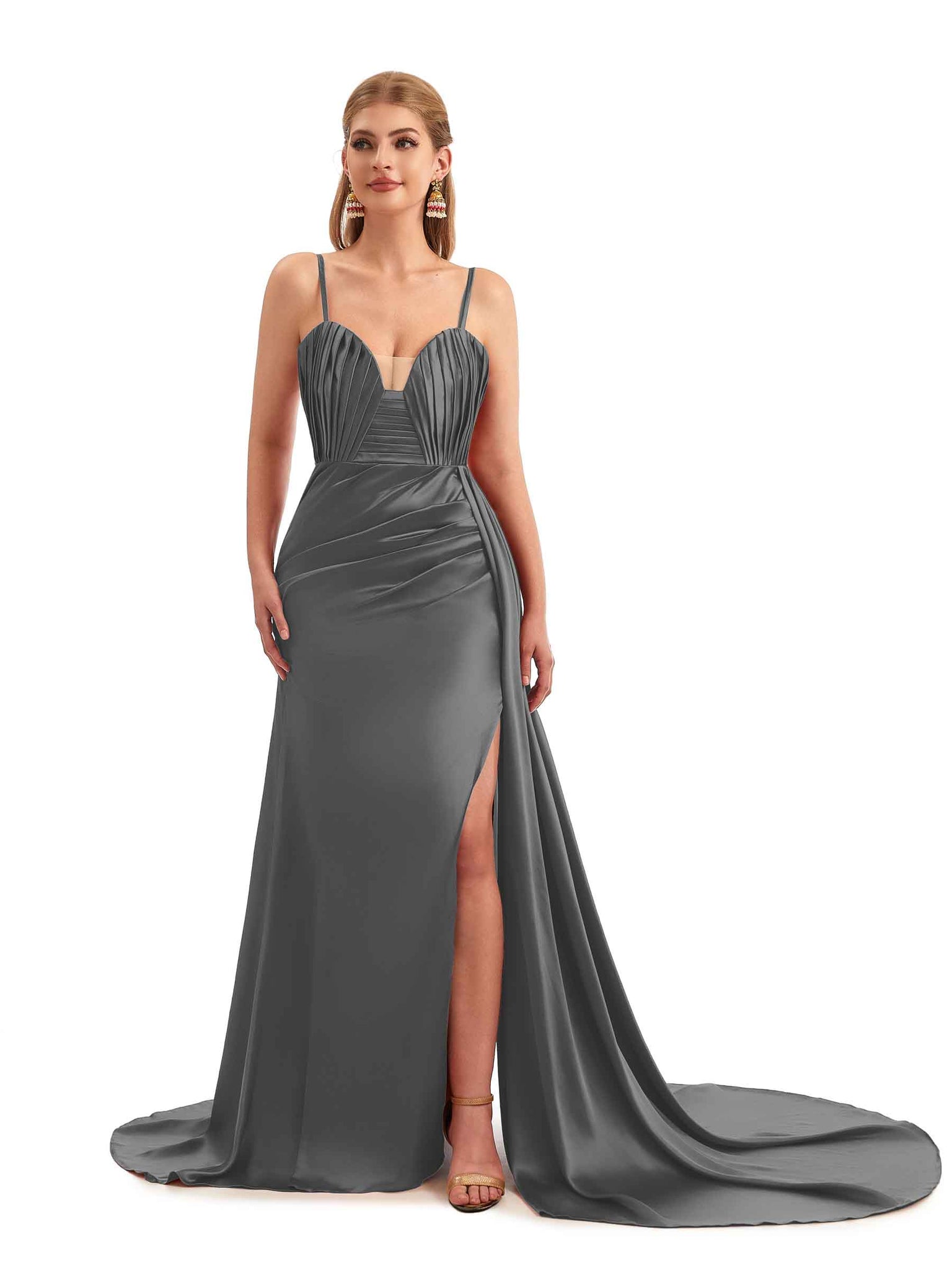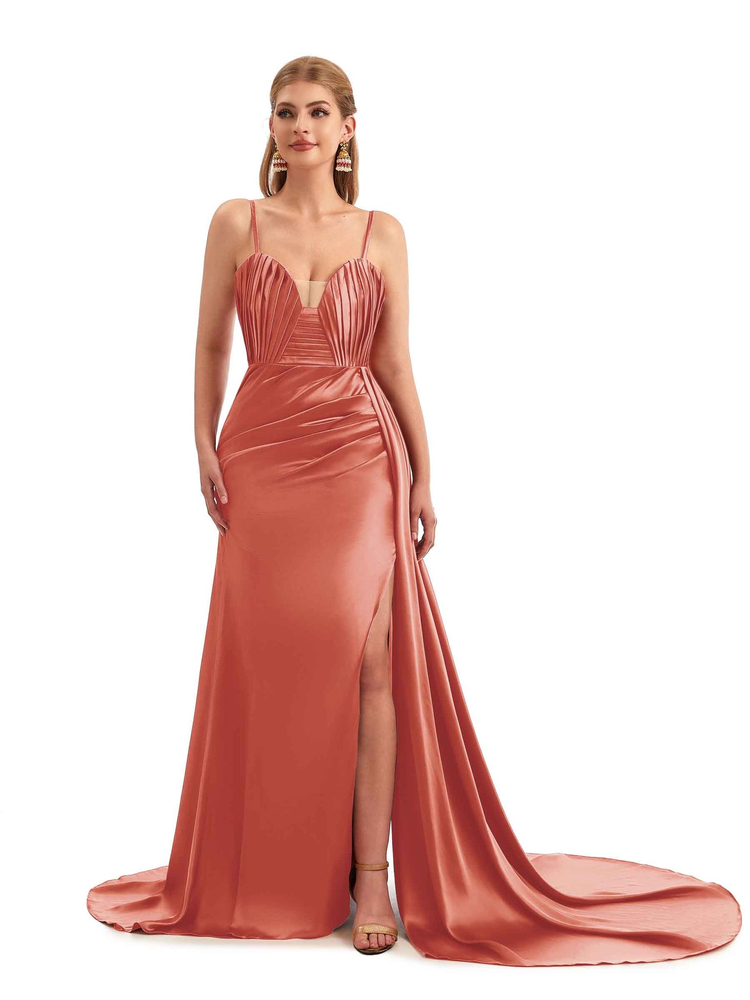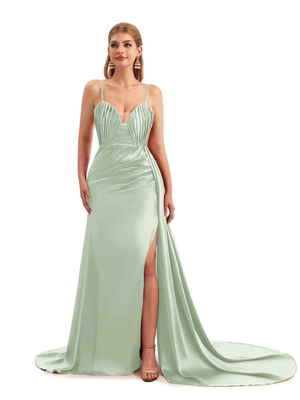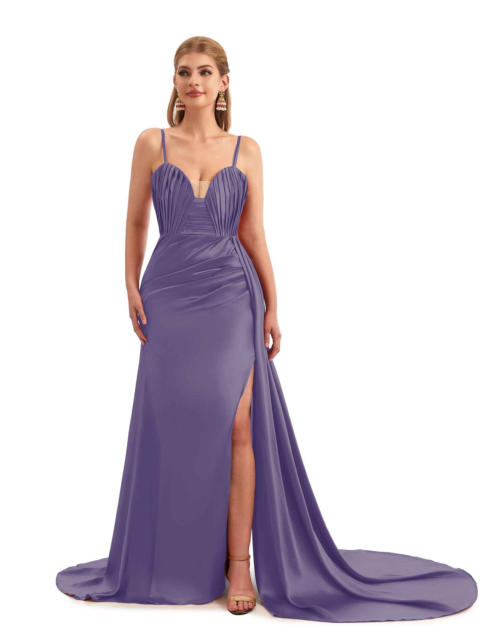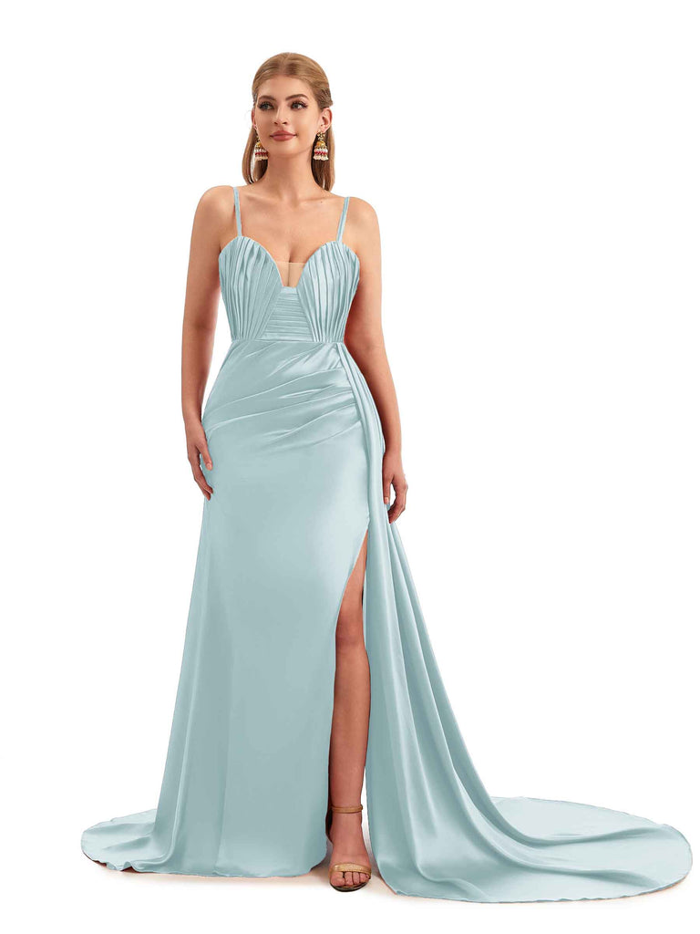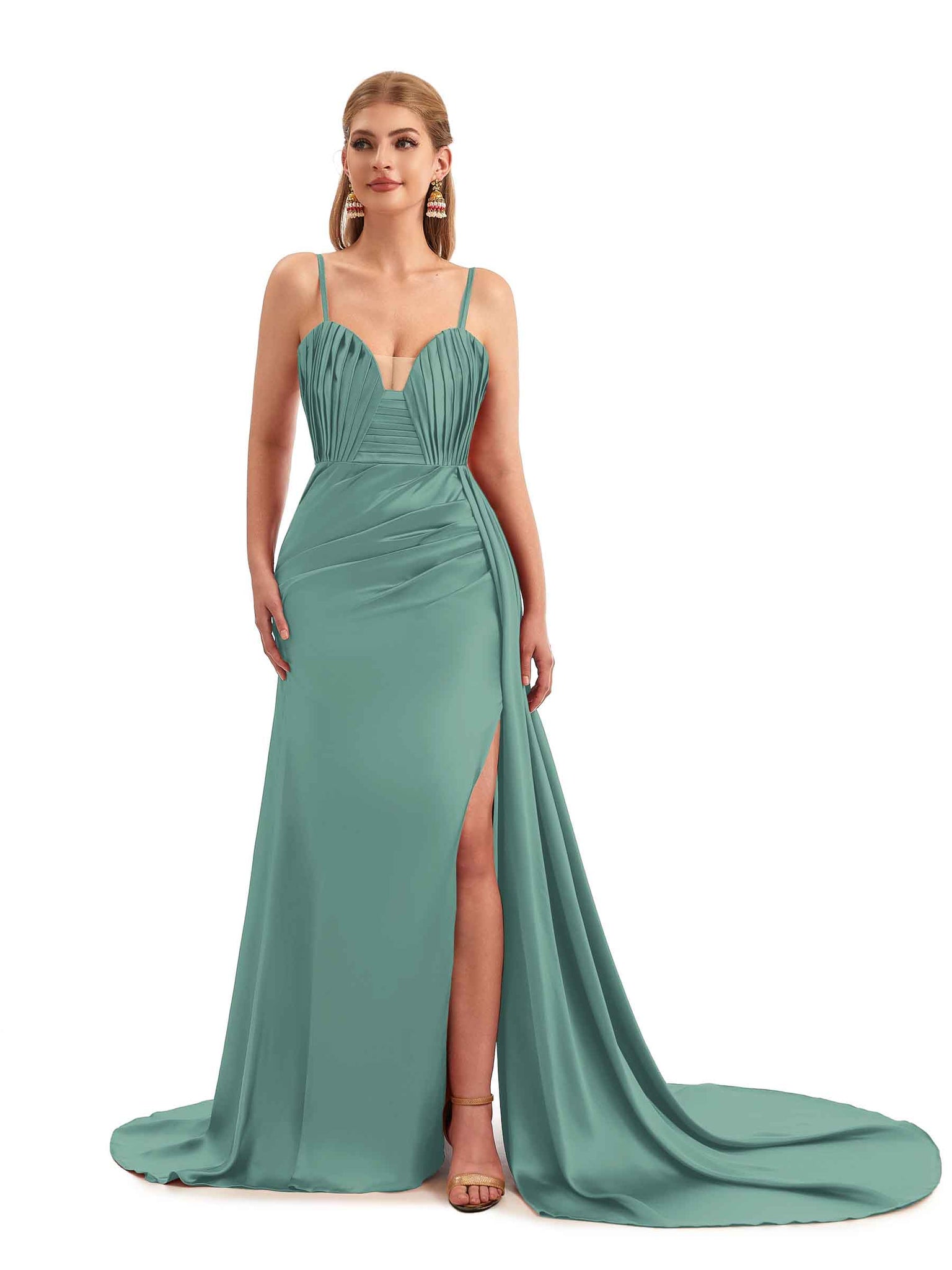 Ruched Satin Side Split Spaghetti Straps Long Mermaid Bridesmaid Dresses Online
