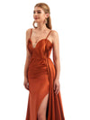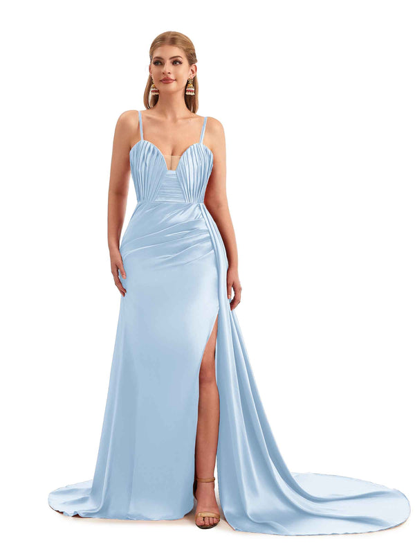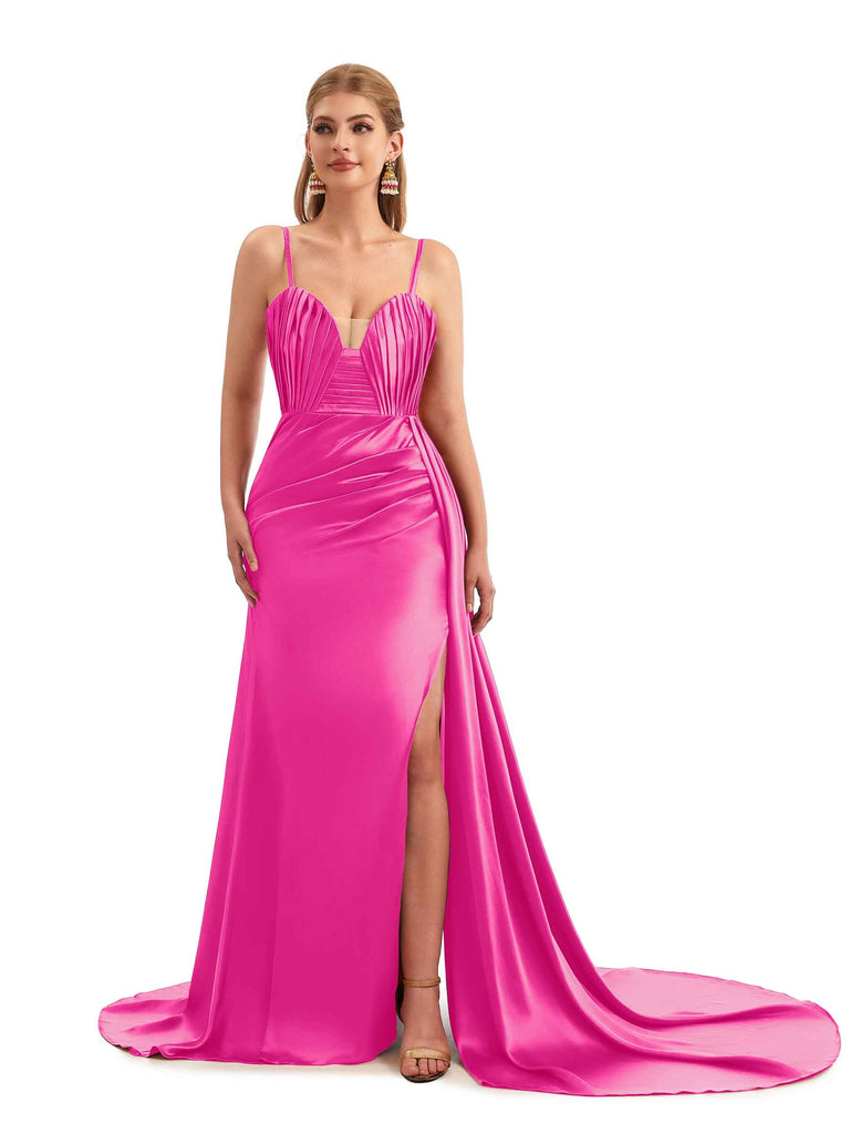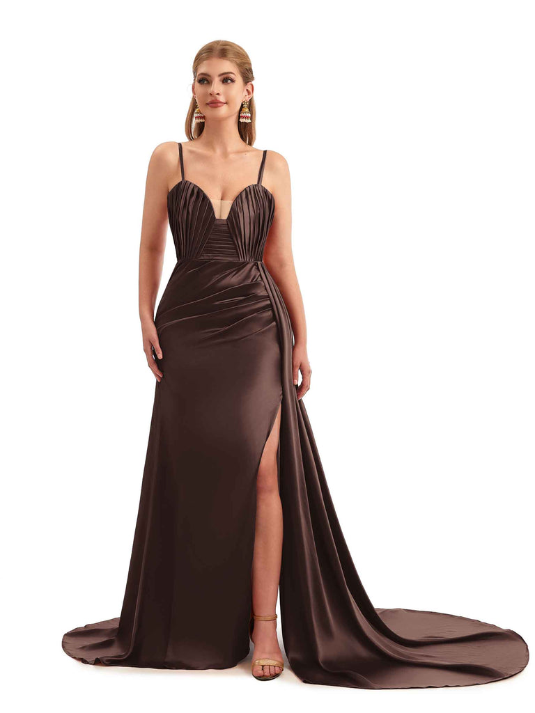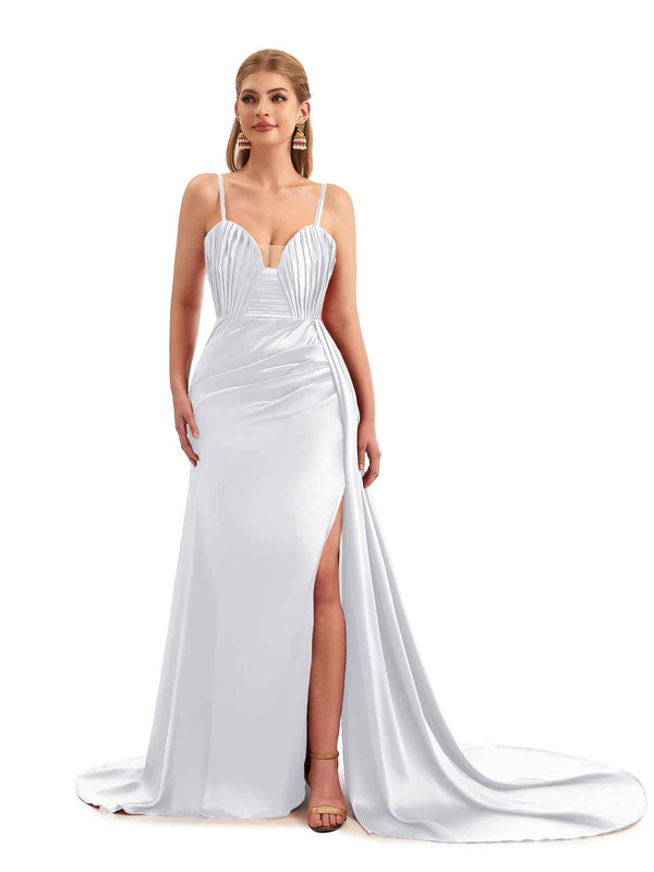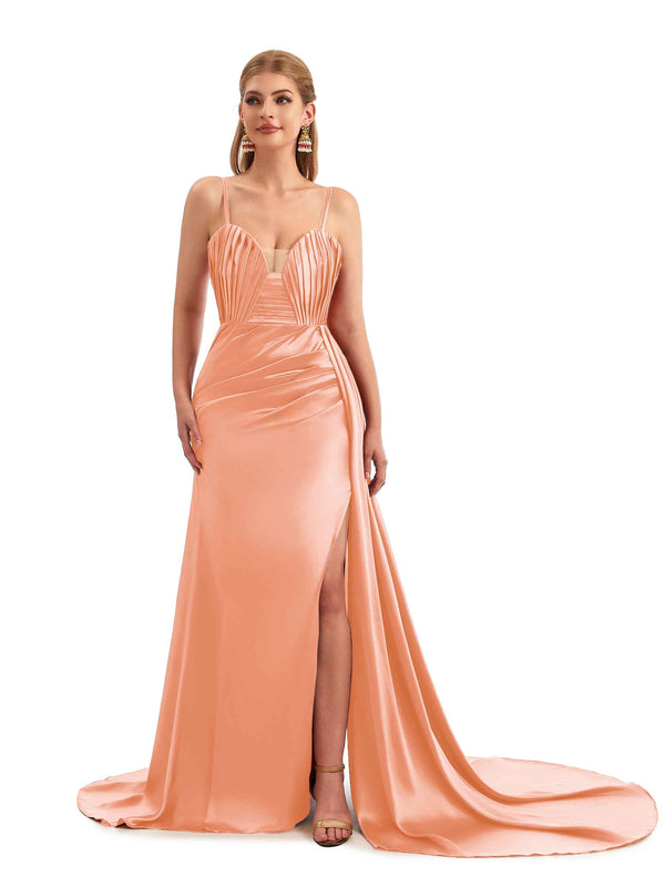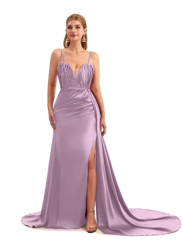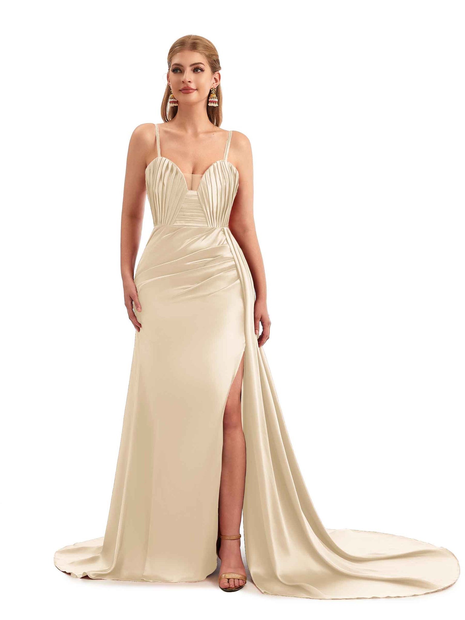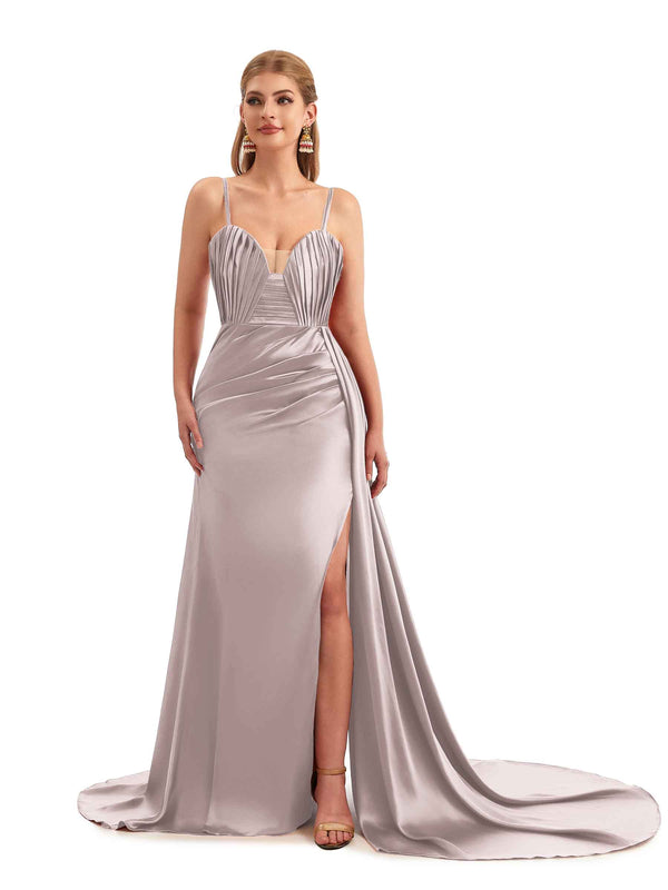 Ruched Satin Side Split Spaghetti Straps Long Mermaid Bridesmaid Dresses Online