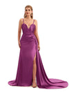 Ruched Satin Side Split Spaghetti Straps Long Mermaid Bridesmaid Dresses Online $149.99