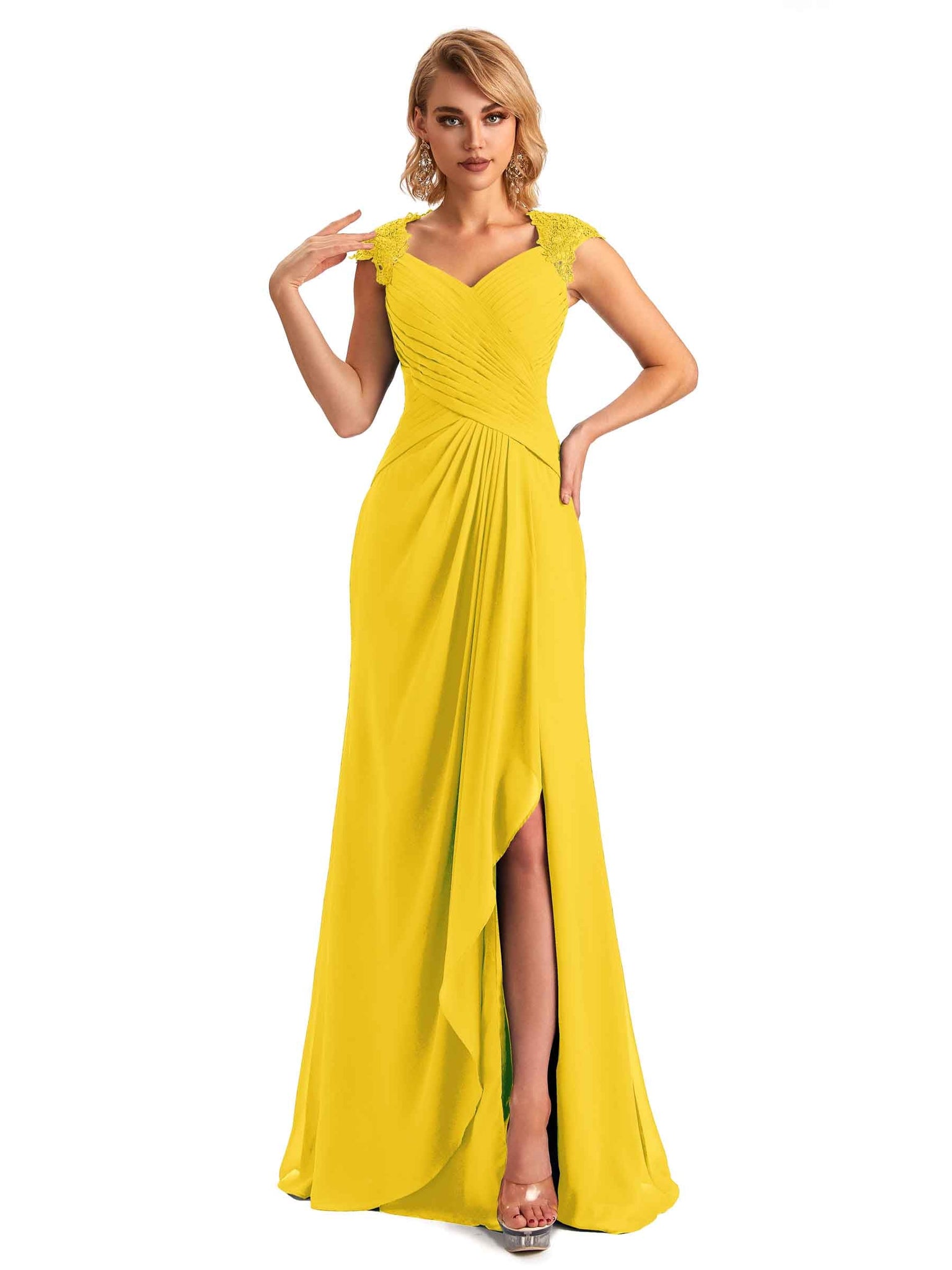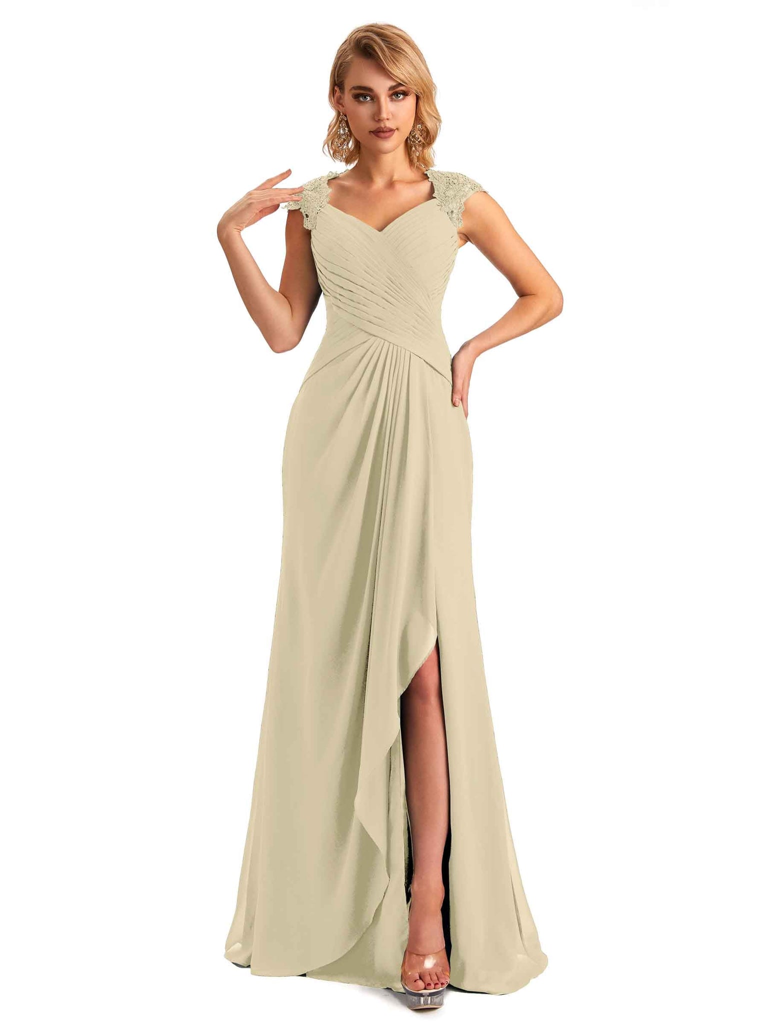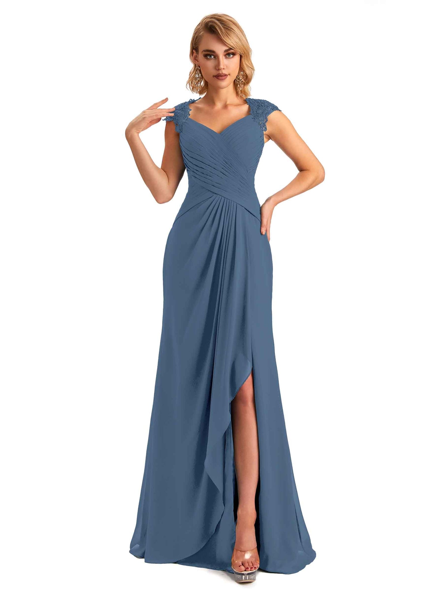 Elegant Side Slit Chiffon Cap Sleeves Long Mother of the Brides Dresses Online