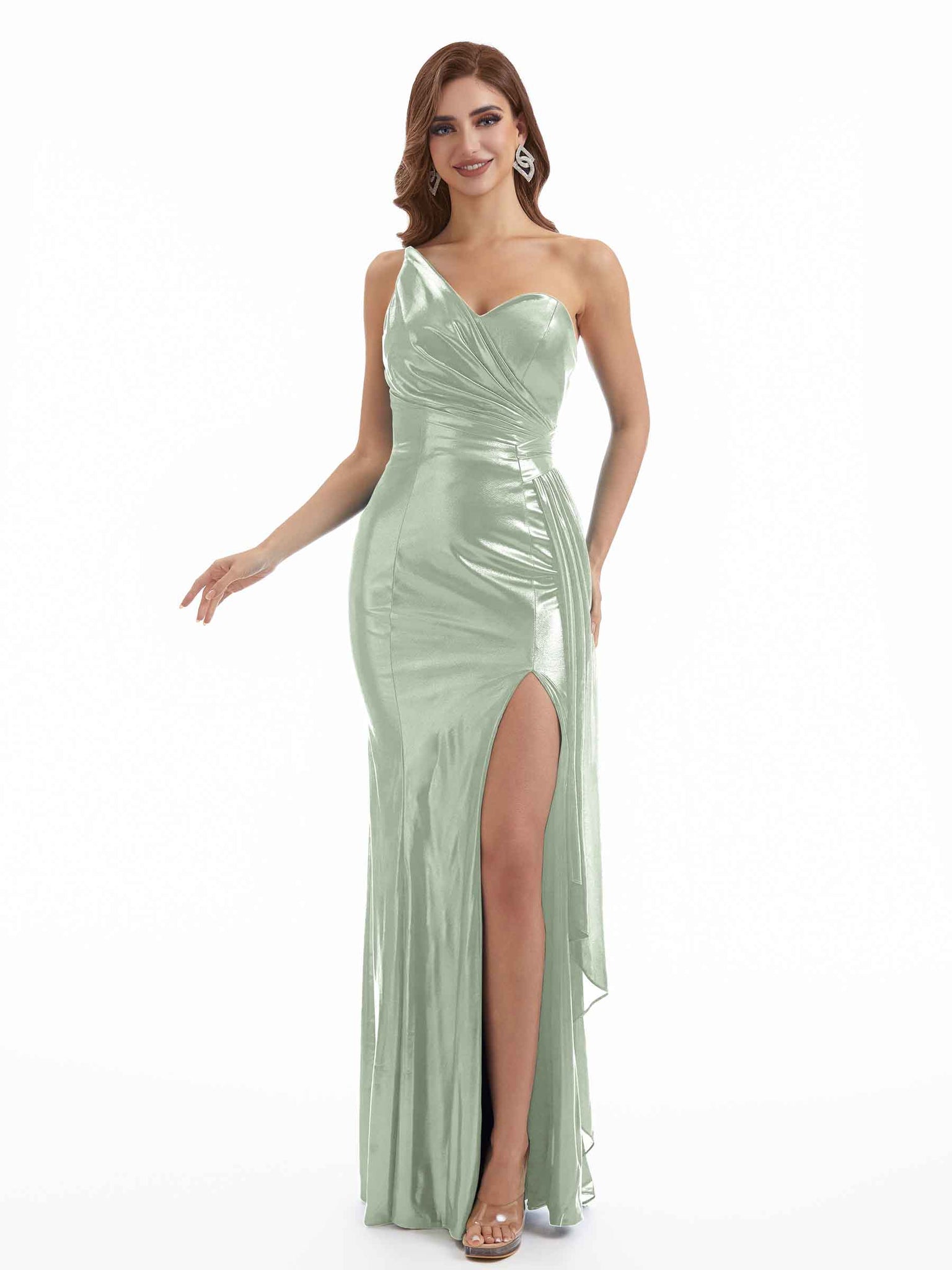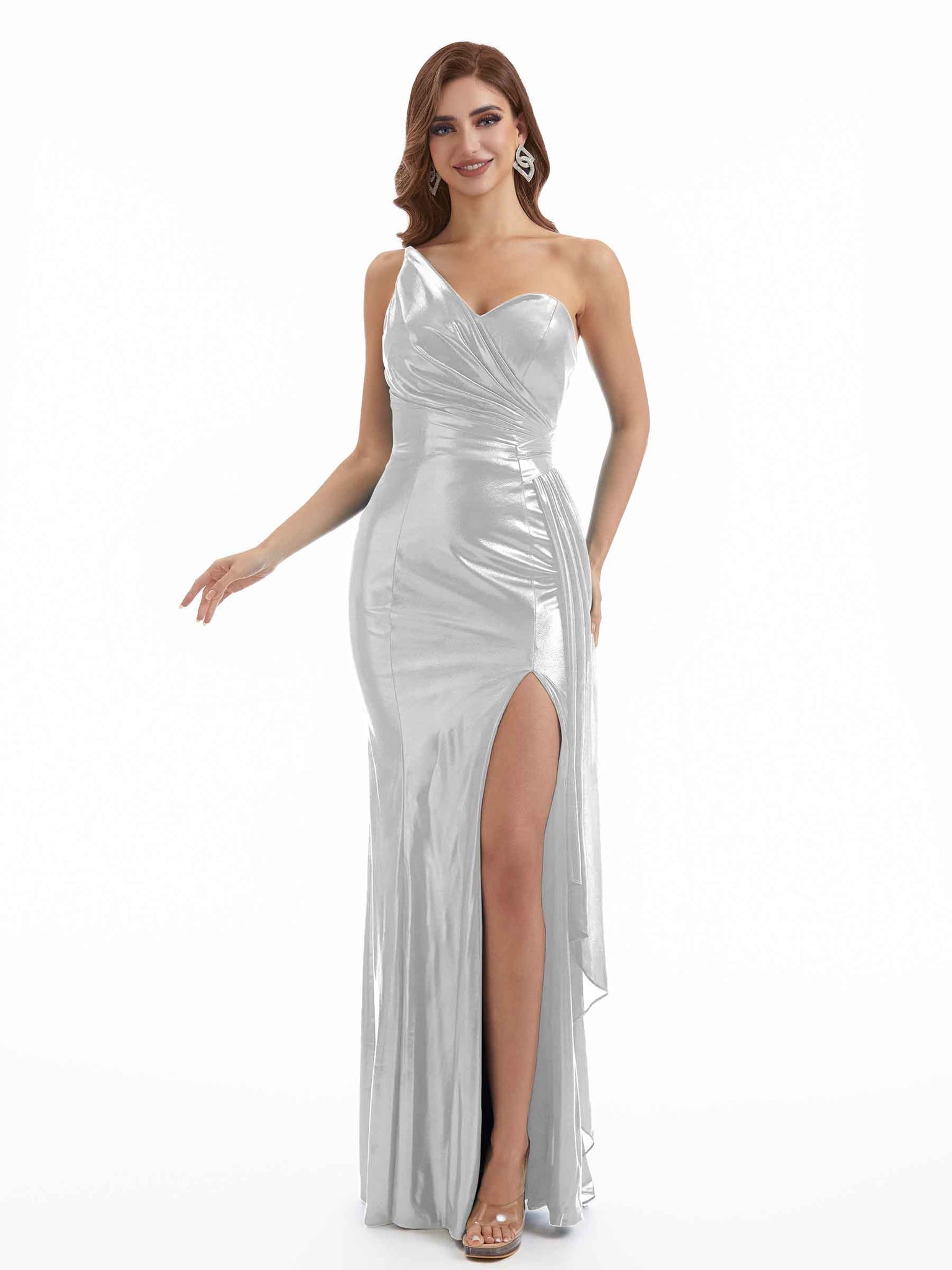 Elegant Side Slit One Shoulder Metallic Stretch Shiny Fabric Long Mermaid Bridesmaid Dresses Online - ChicSew – ChicSew