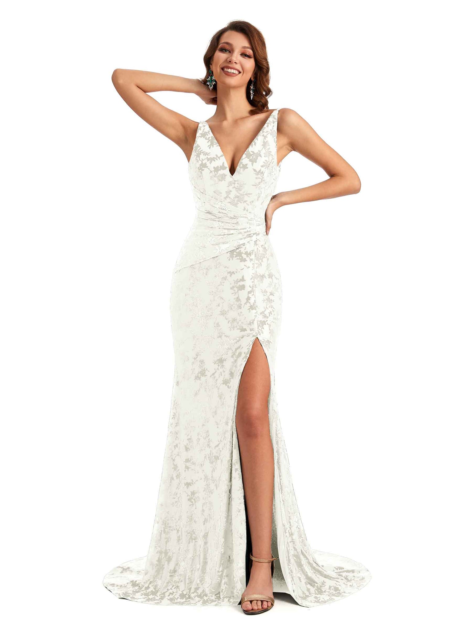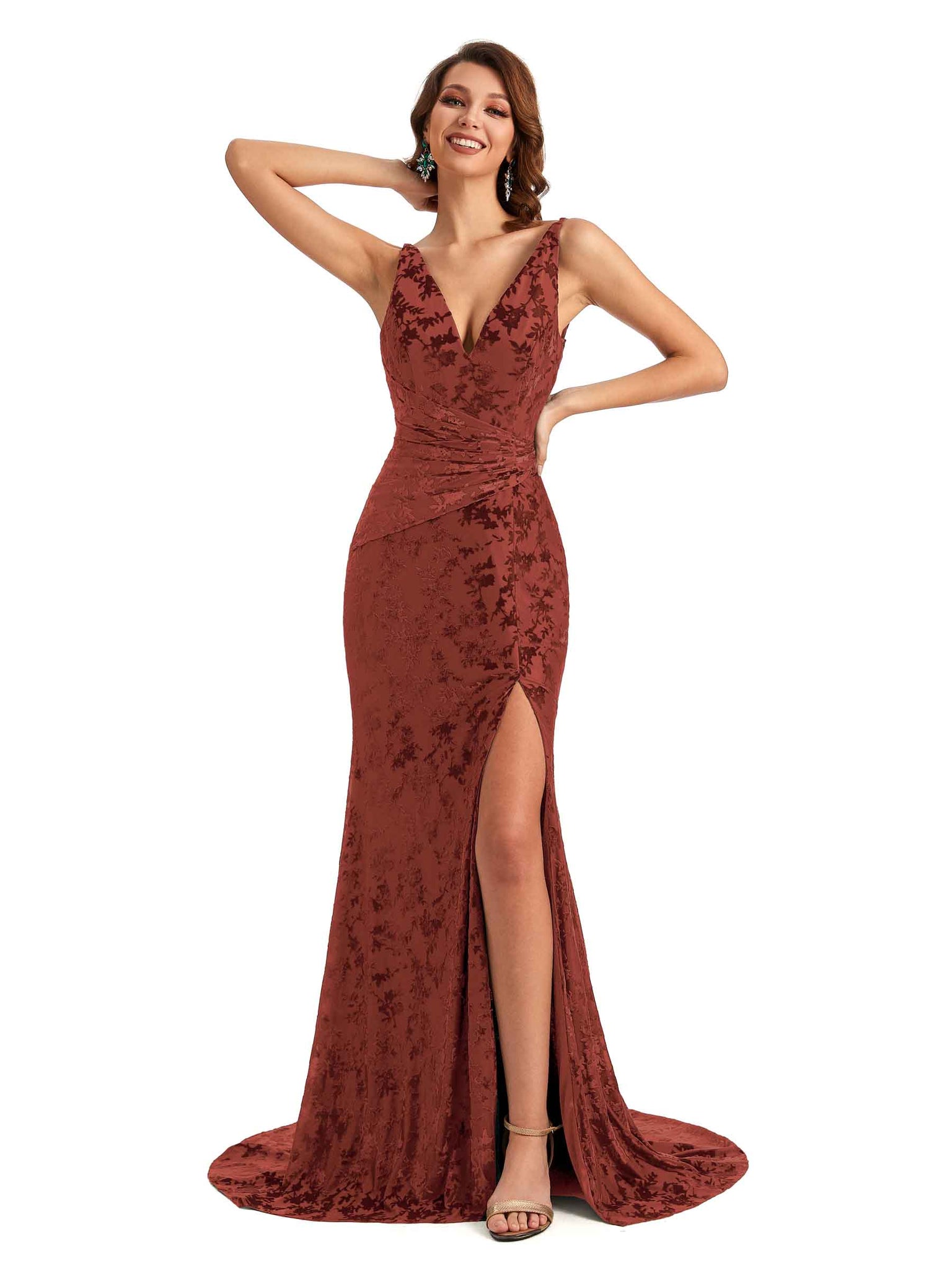 Elegant Side Slit V-neck Mermaid Lace Velvet Long Bridesmaid Dresses Online - ChicSew – ChicSew