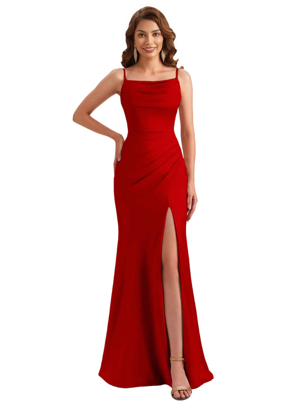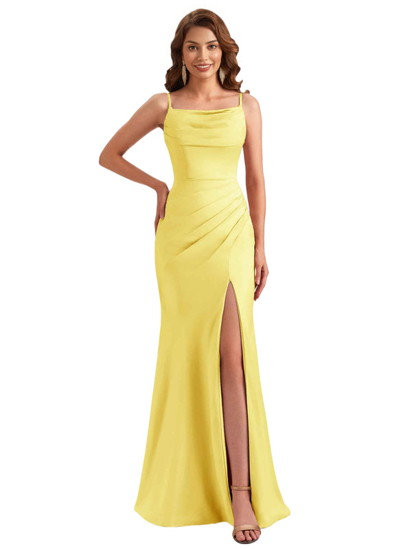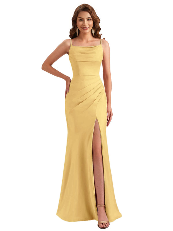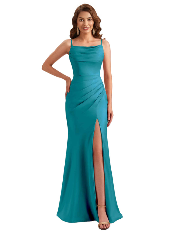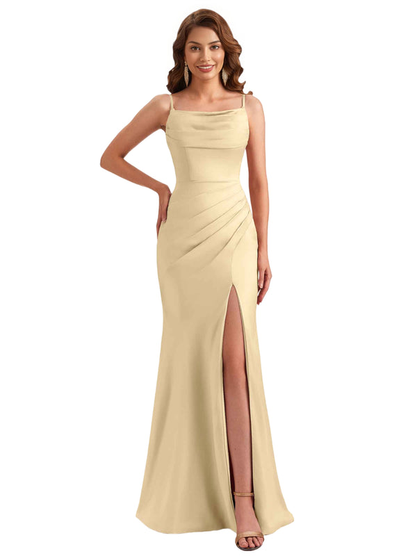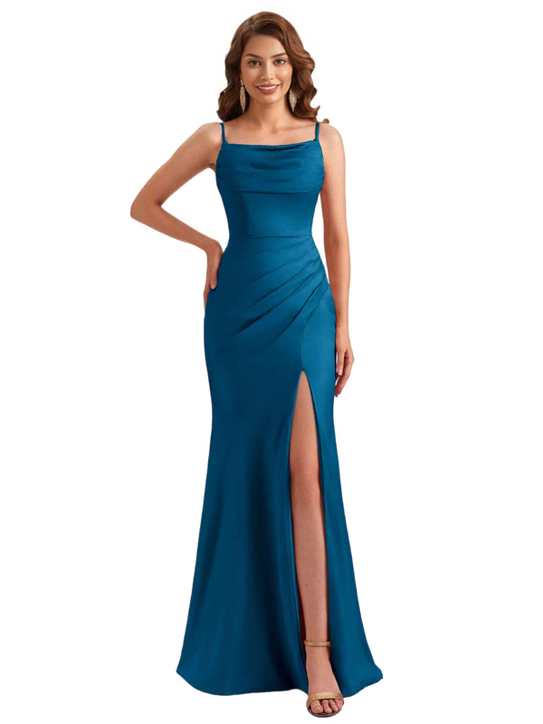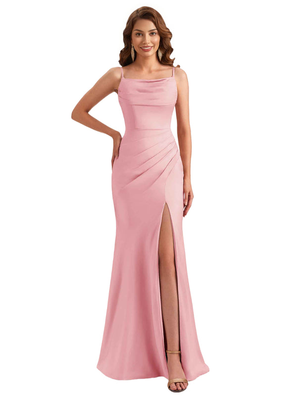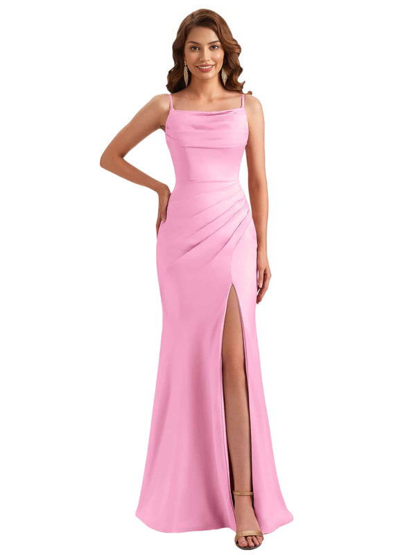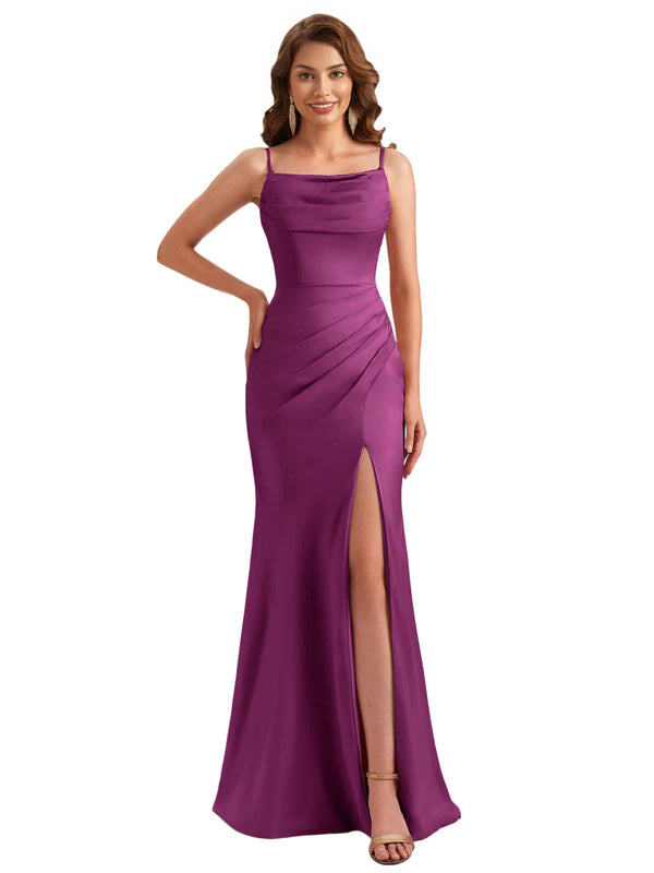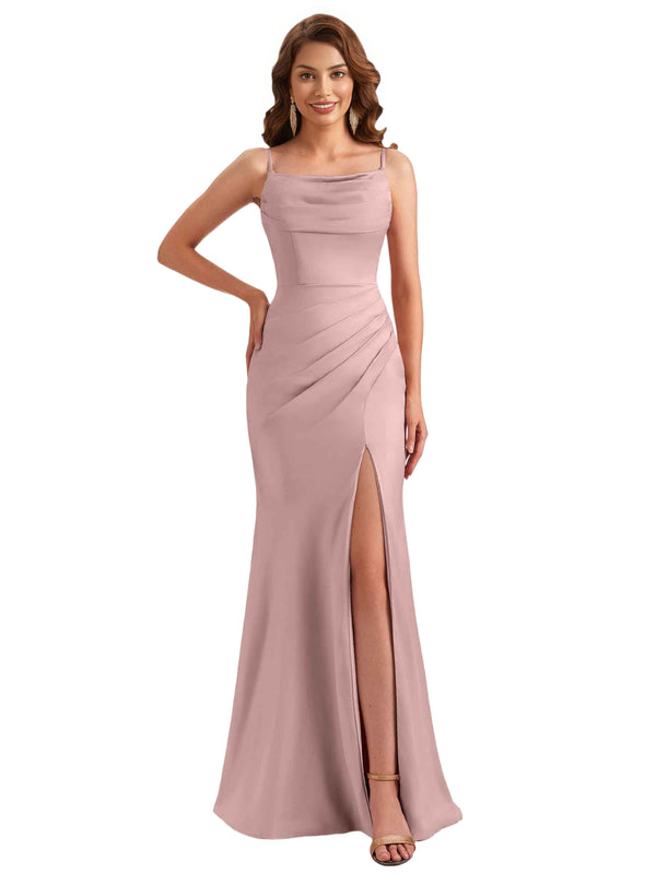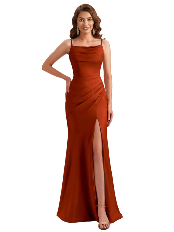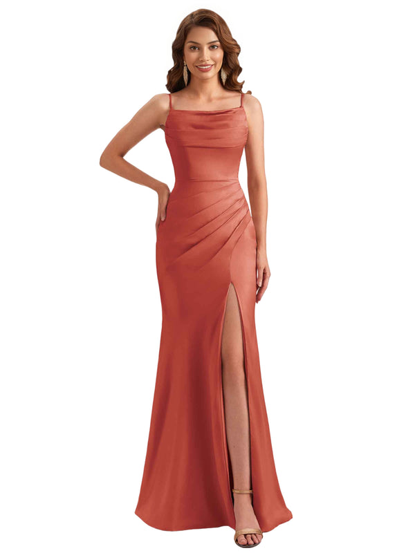 Elegant Silky Satin Spaghetti Straps Mermaid Side Slit Ruched Long Bridesmaid Dresses