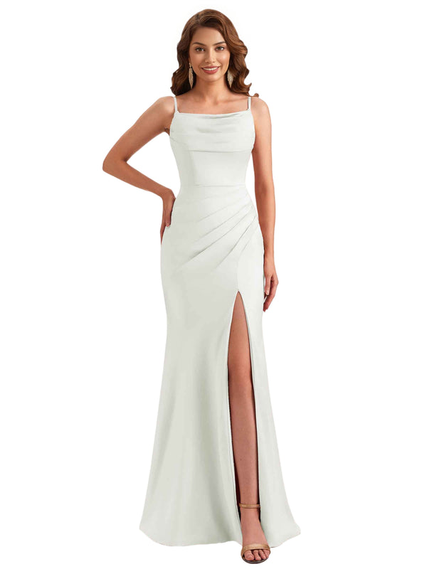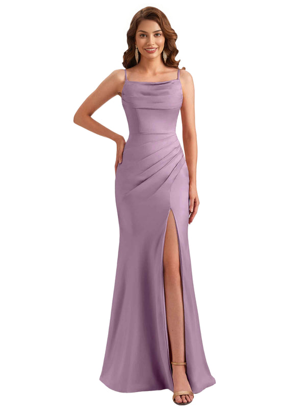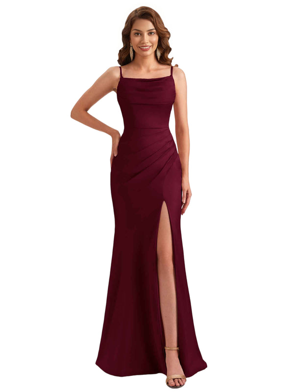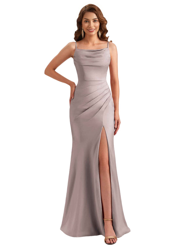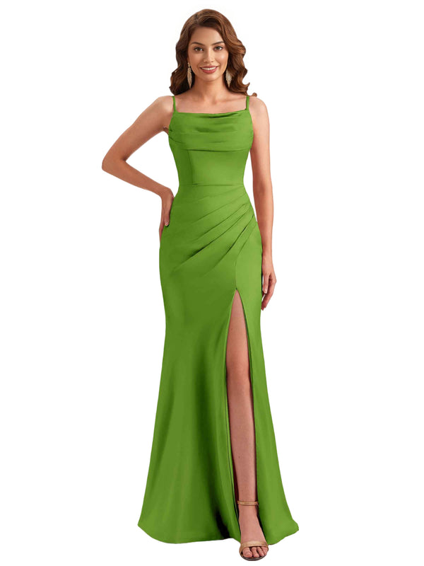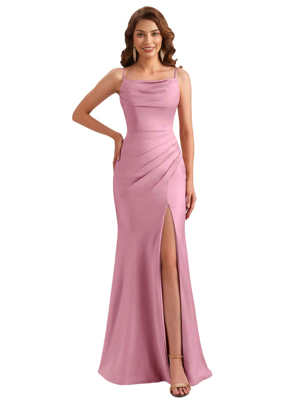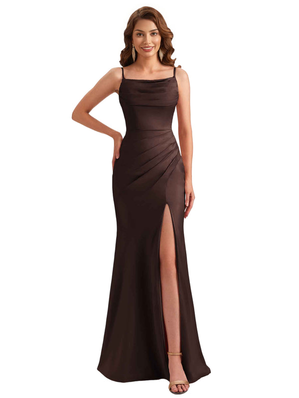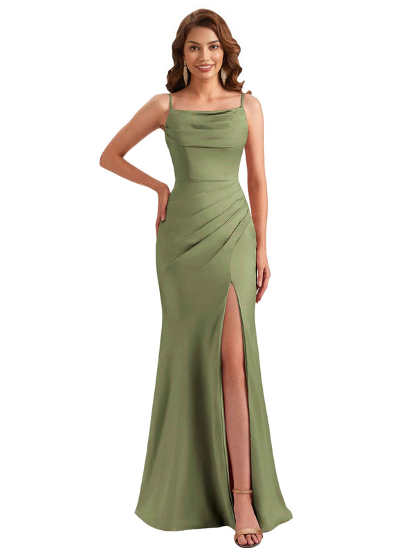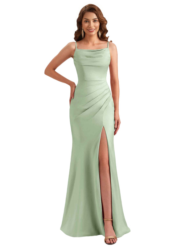 Elegant Silky Satin Spaghetti Straps Mermaid Side Slit Ruched Long Bridesmaid Dresses - ChicSew – ChicSew