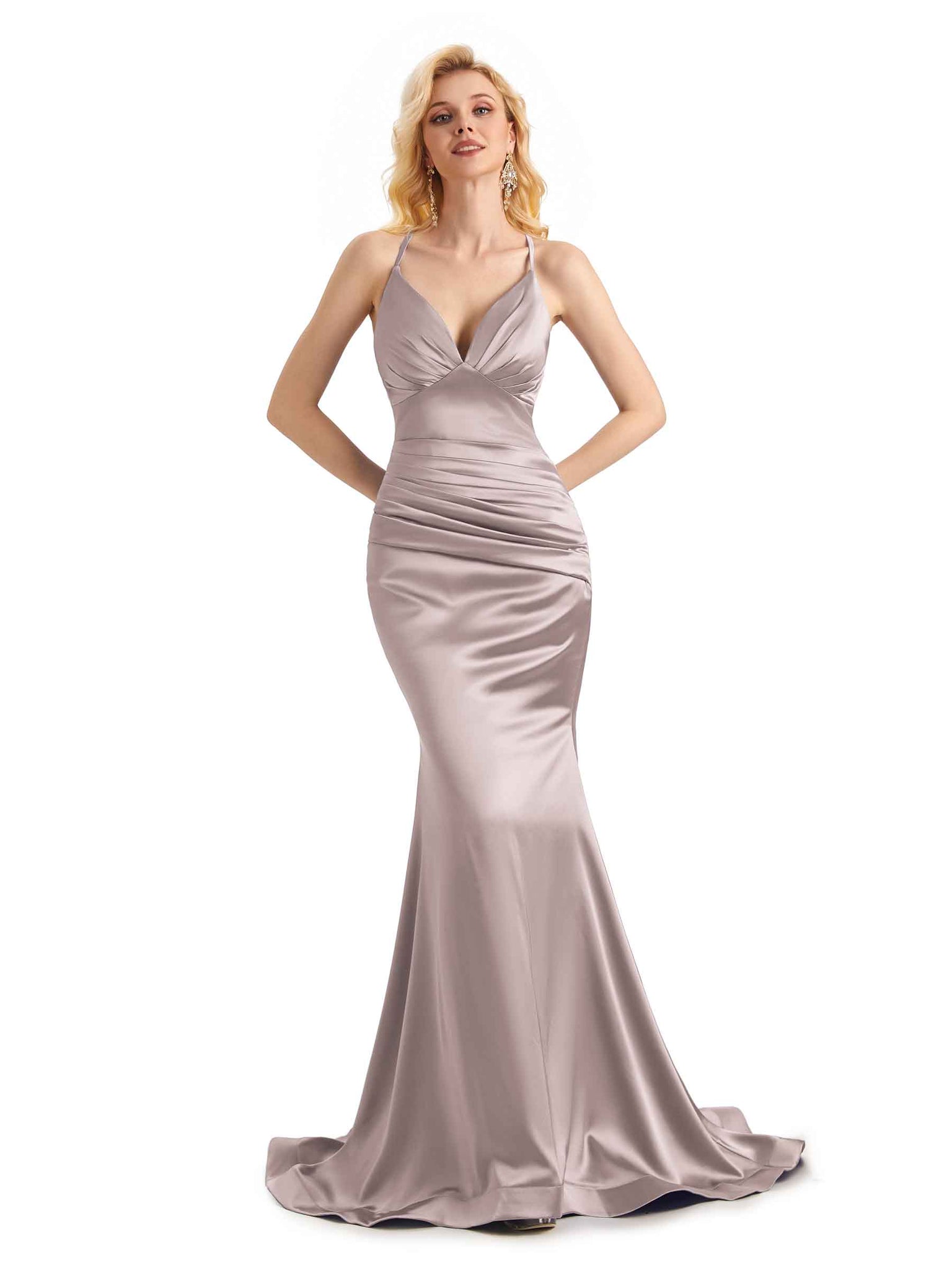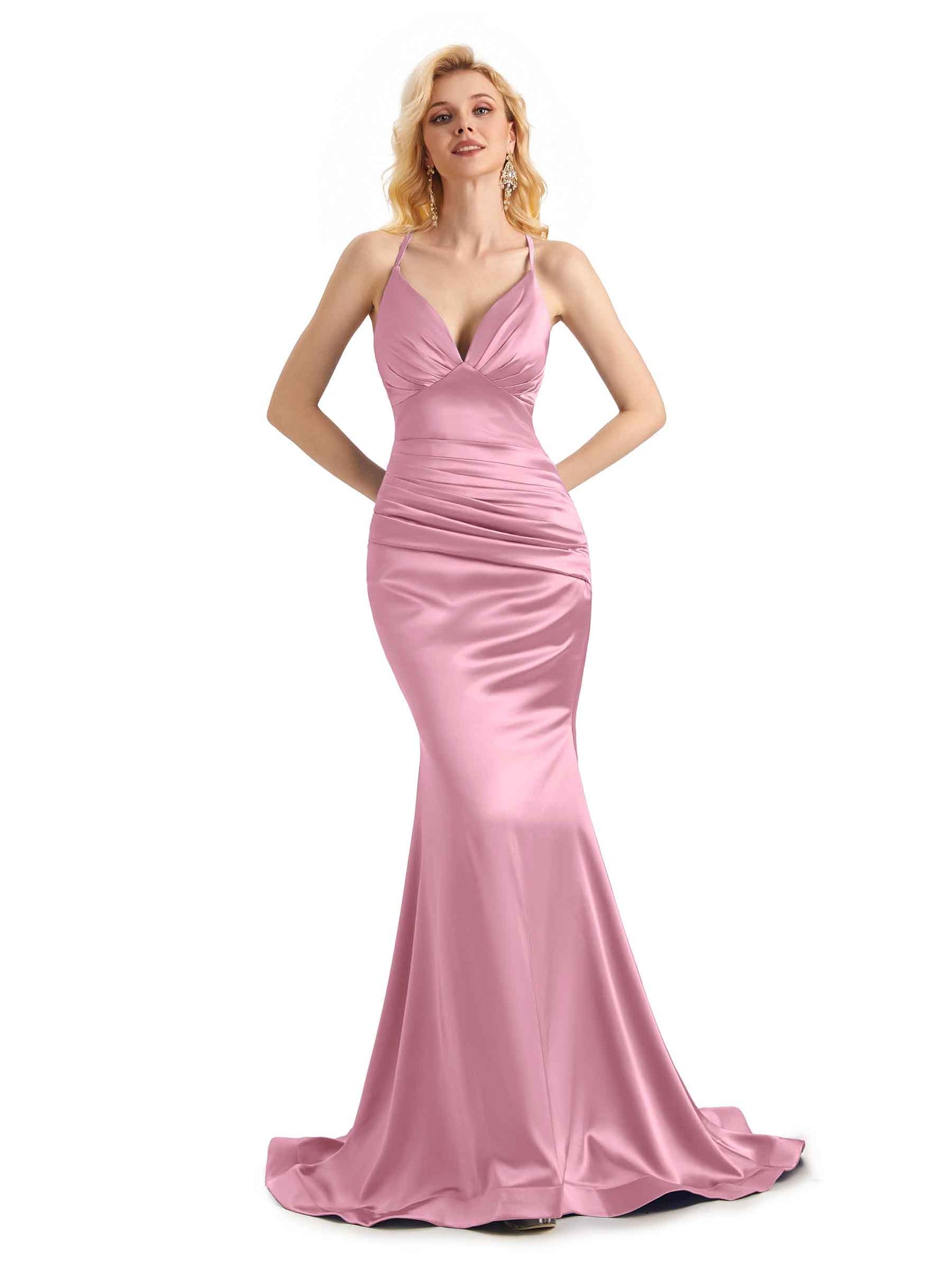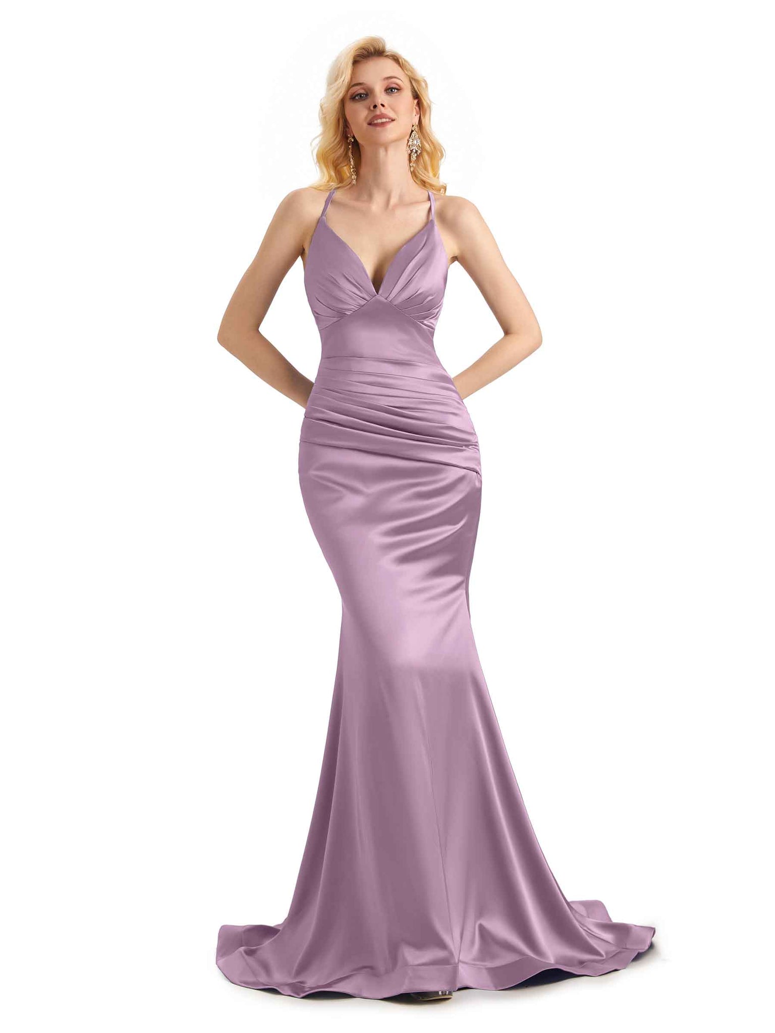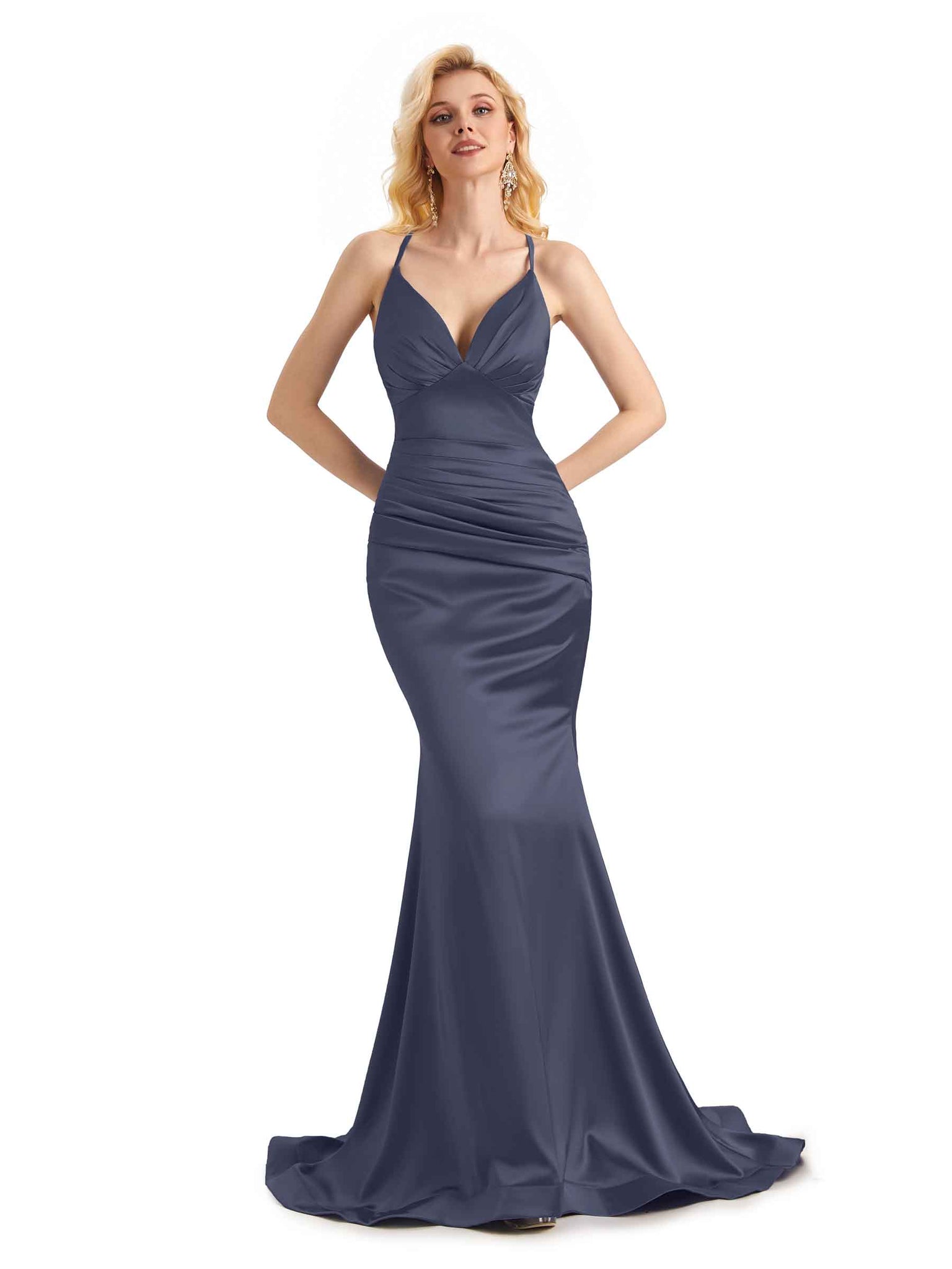 Elegant Soft Satin Mermaid Spaghetti Straps V-Neck Backless Long Bridesmaid Dresses Online