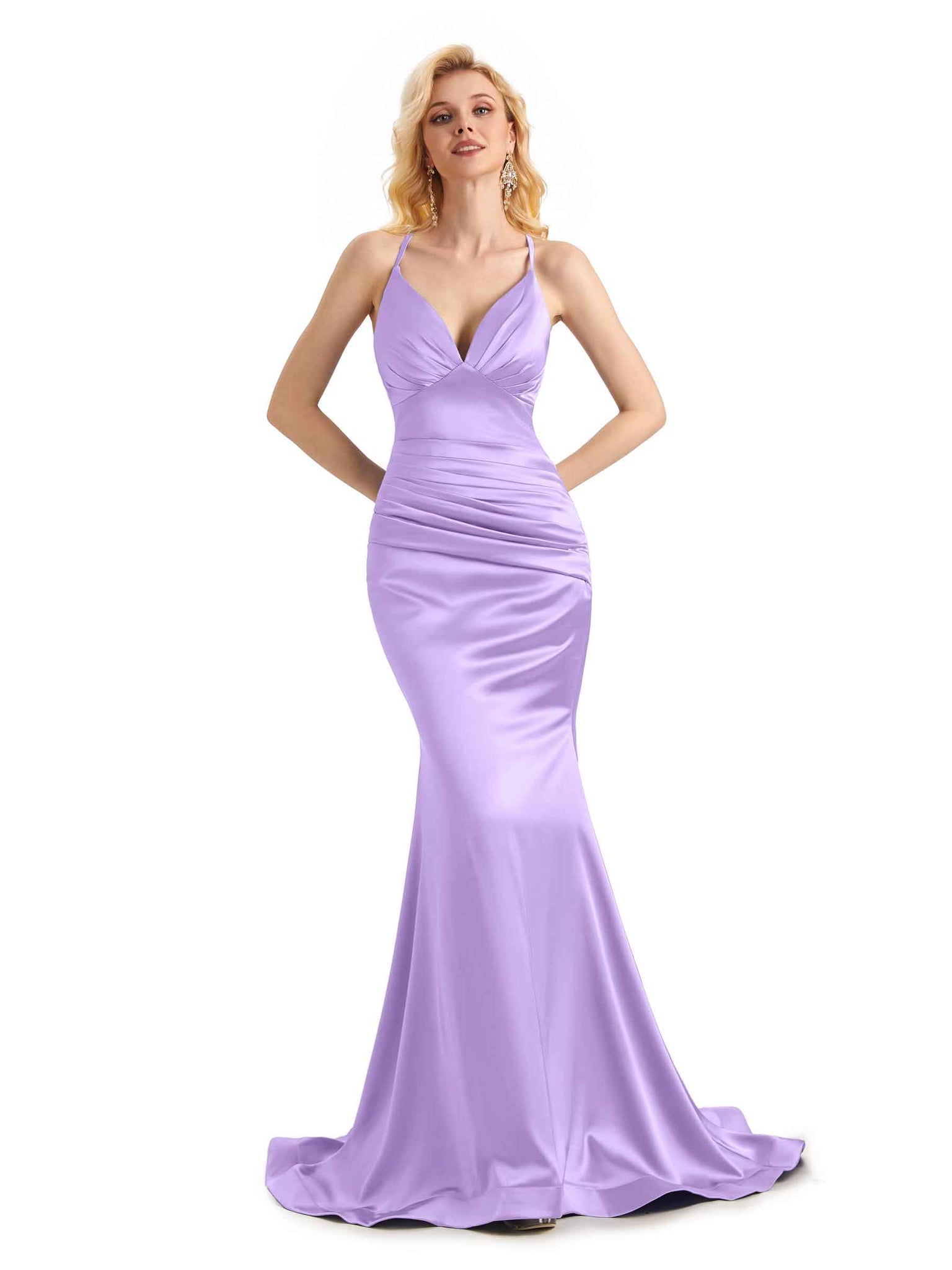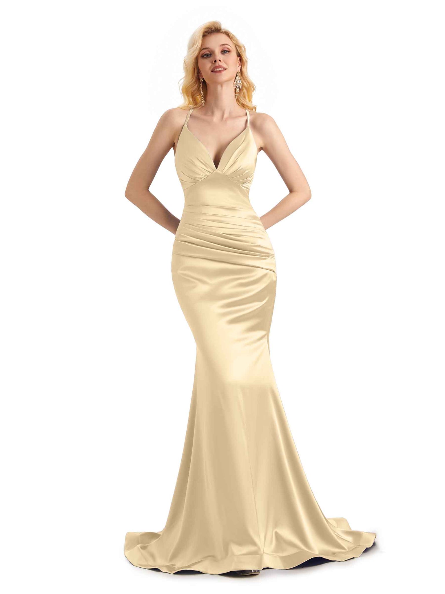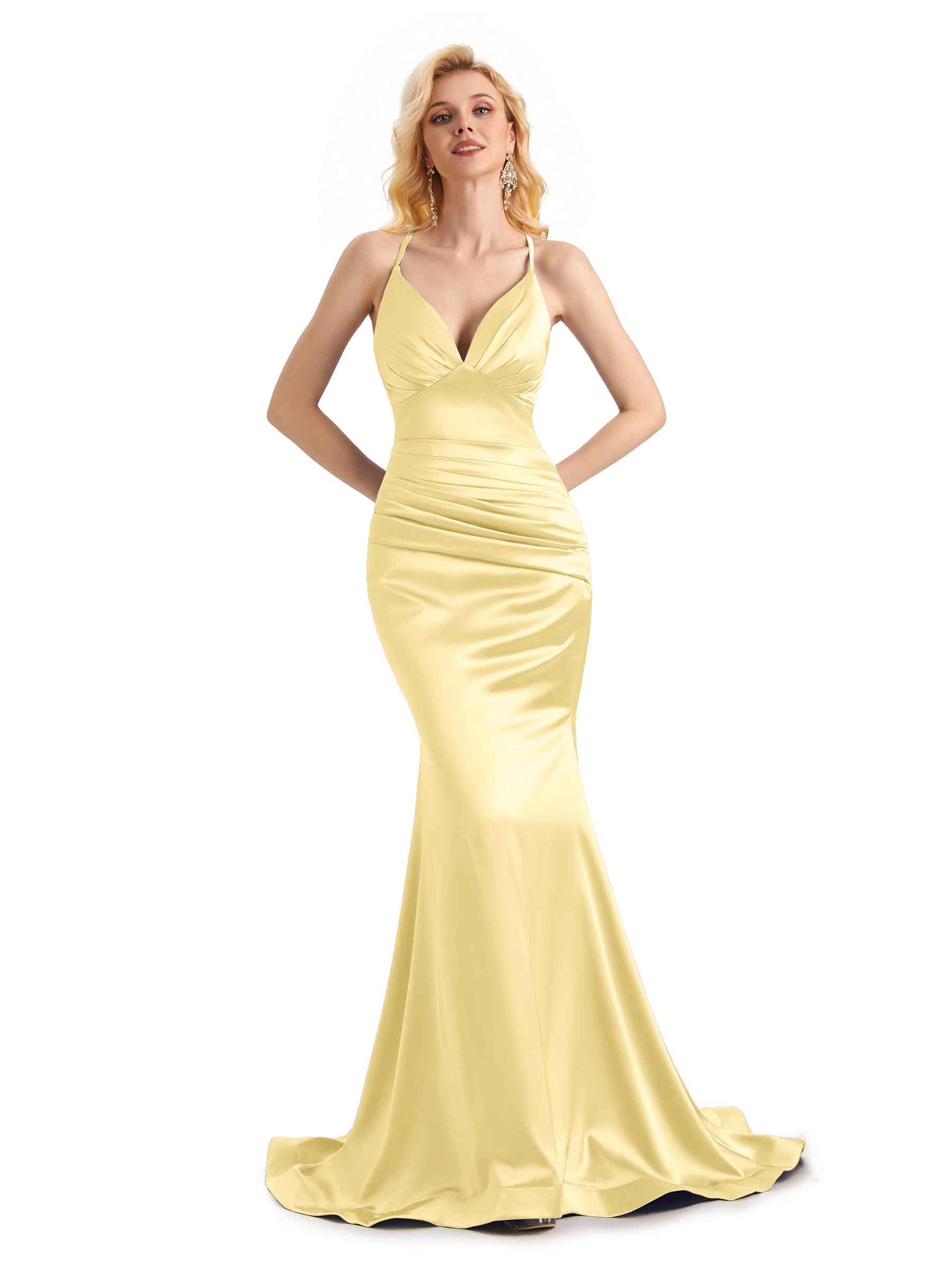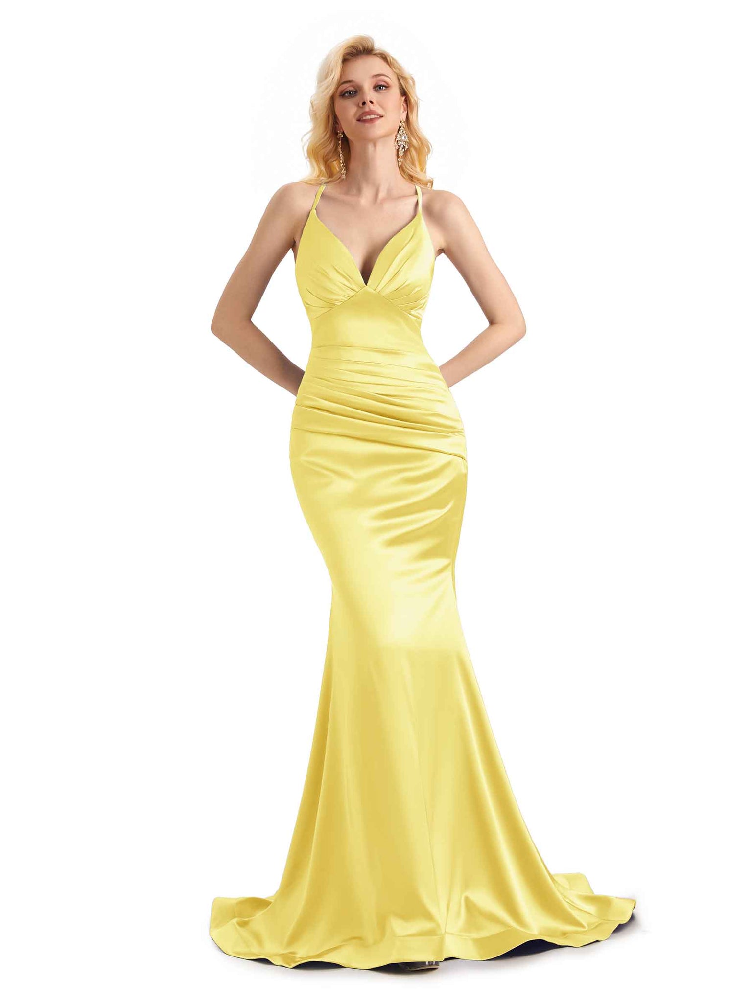 Elegant Soft Satin Mermaid Spaghetti Straps V-Neck Backless Long Bridesmaid Dresses Online
