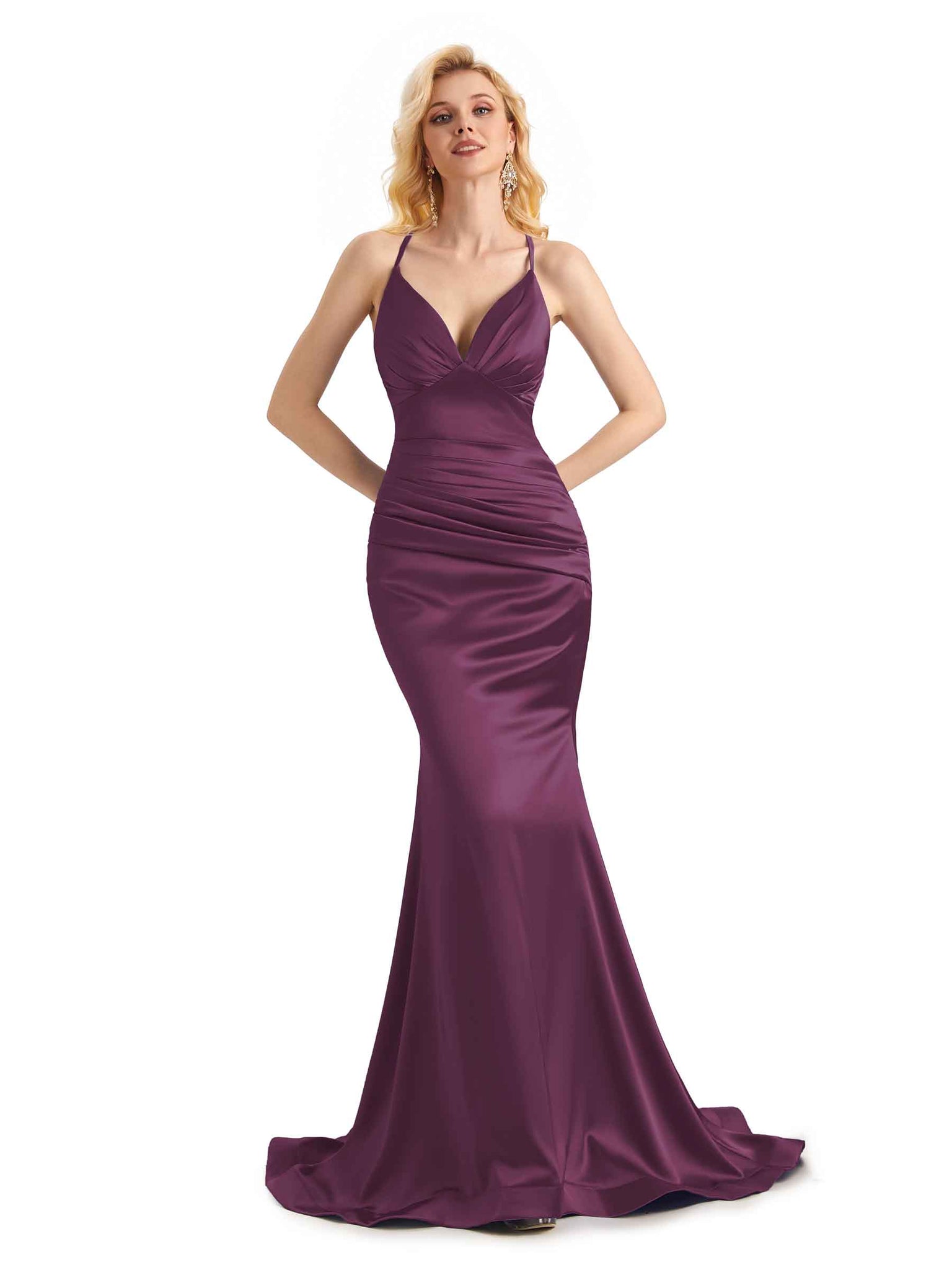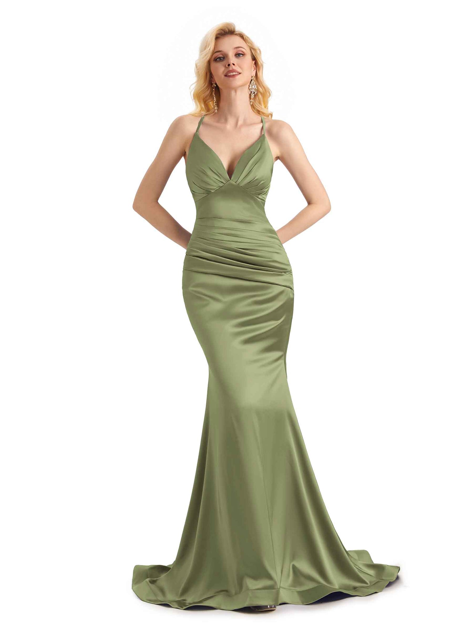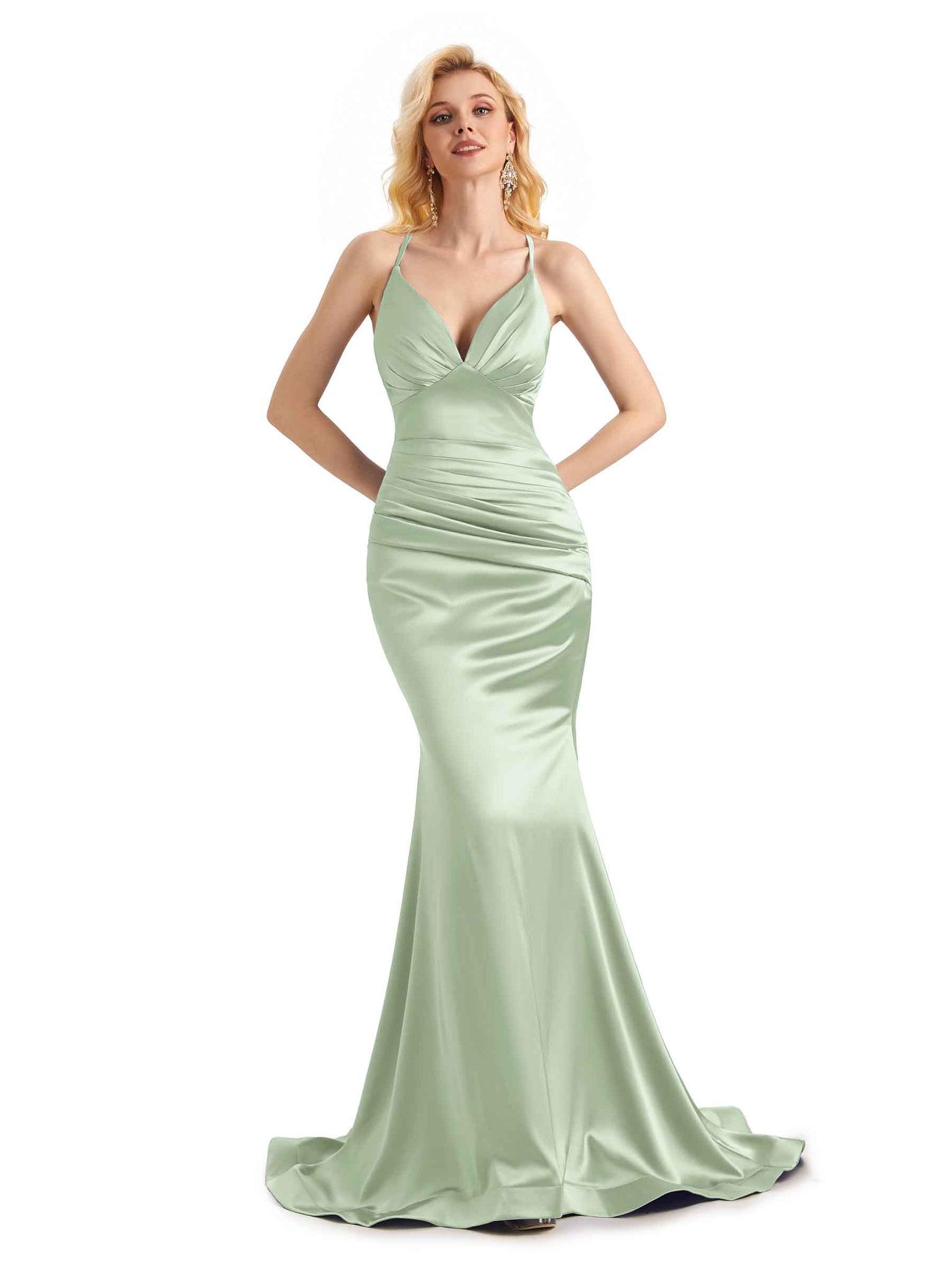 Elegant Soft Satin Mermaid Spaghetti Straps V-Neck Backless Long Bridesmaid Dresses Online - ChicSew – ChicSew