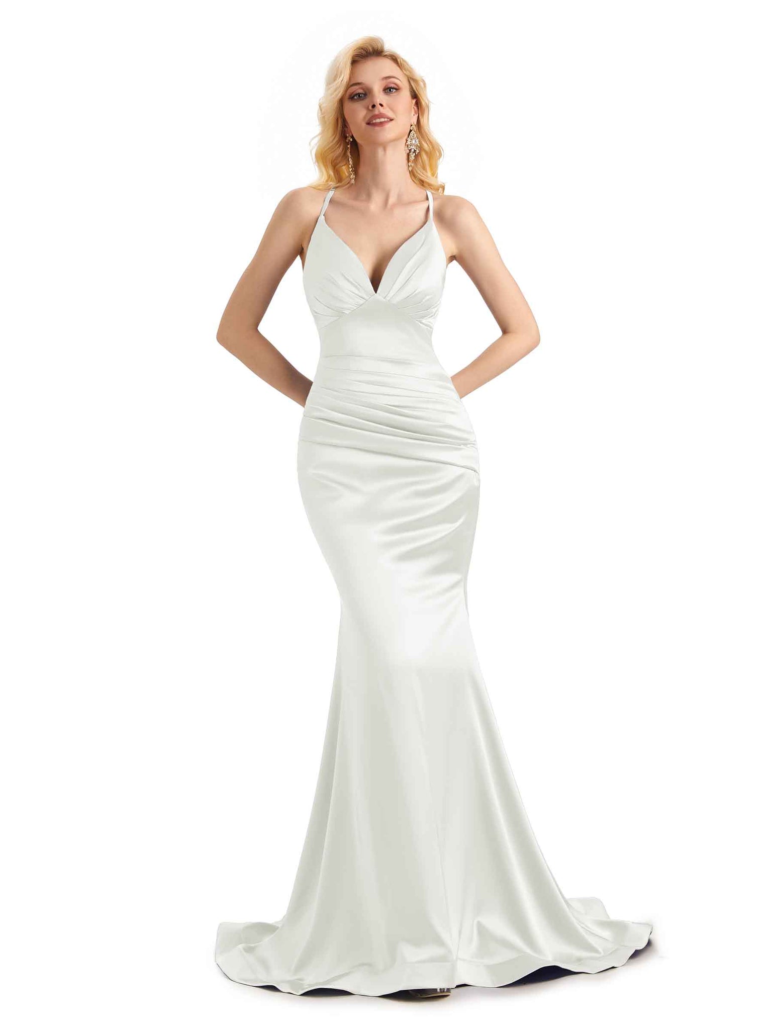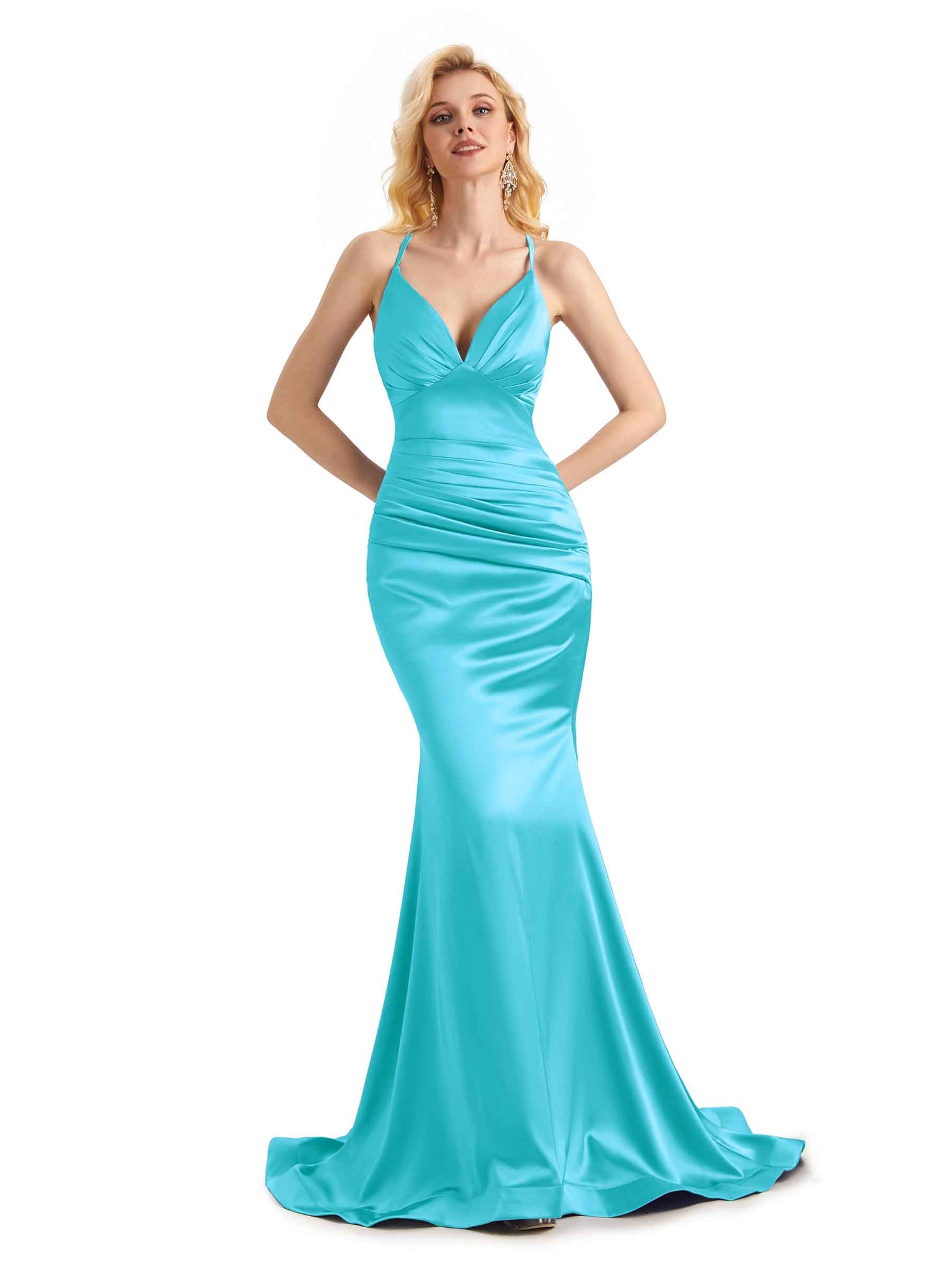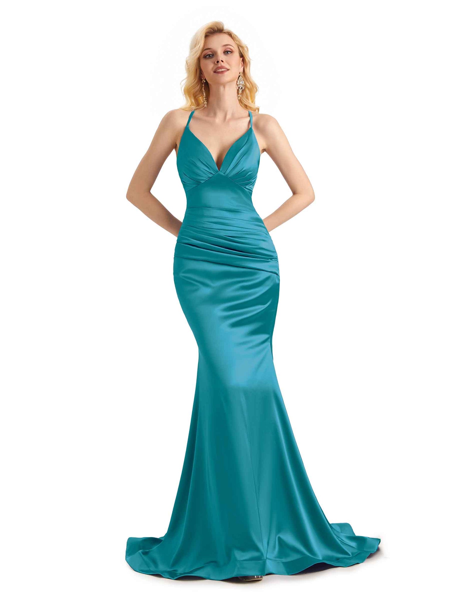 Elegant Soft Satin Mermaid Spaghetti Straps V-Neck Backless Long Bridesmaid Dresses Online - ChicSew – ChicSew