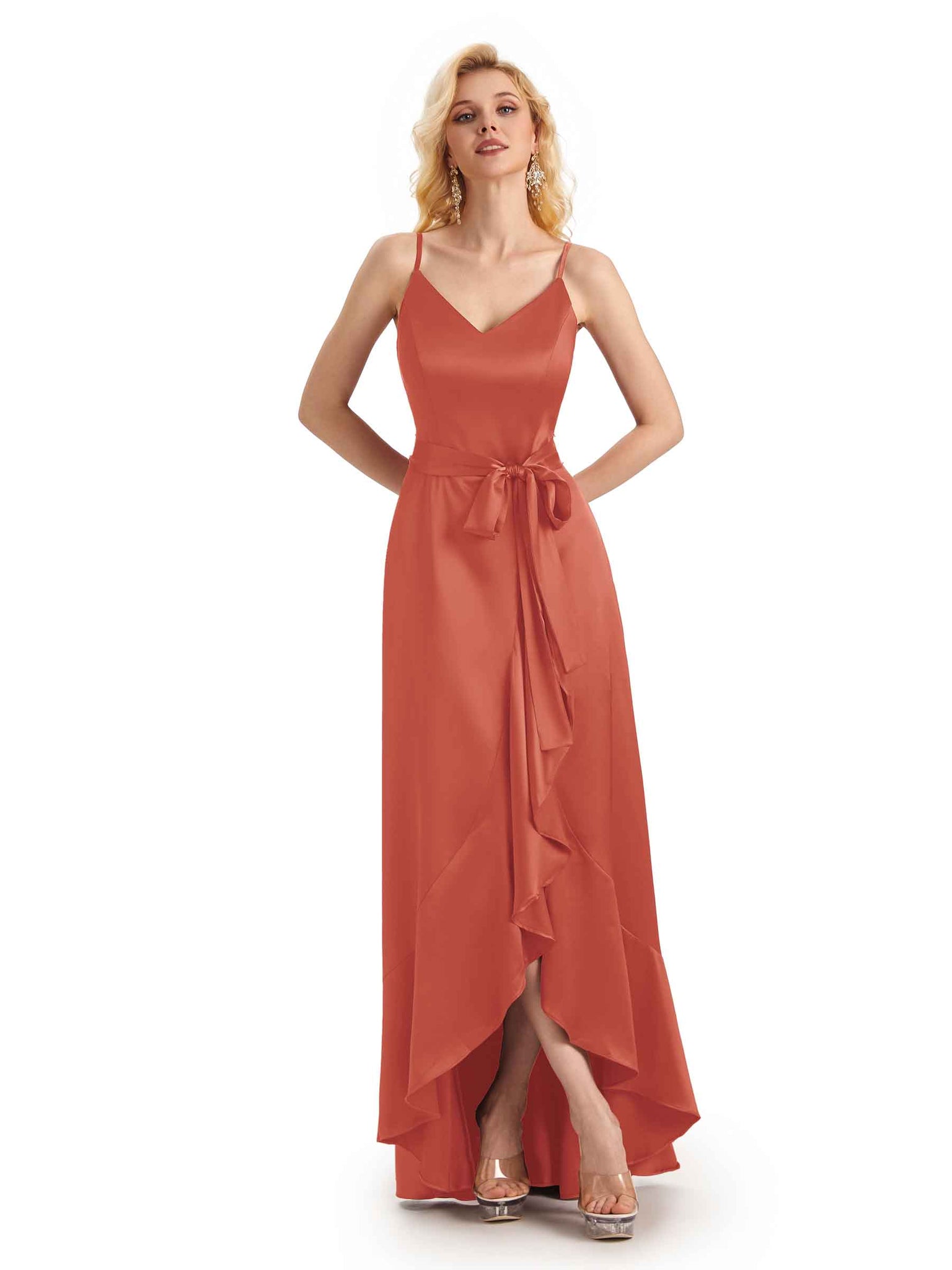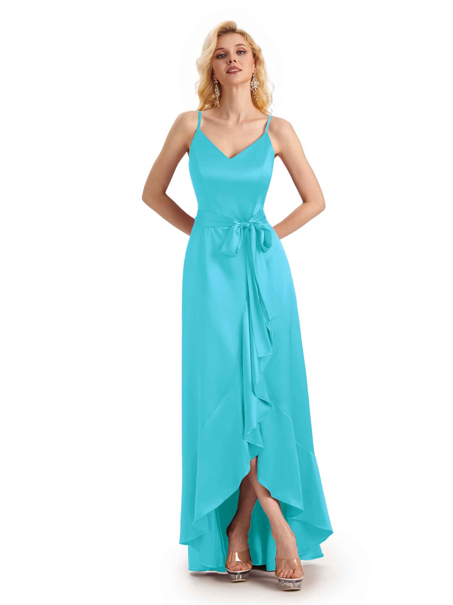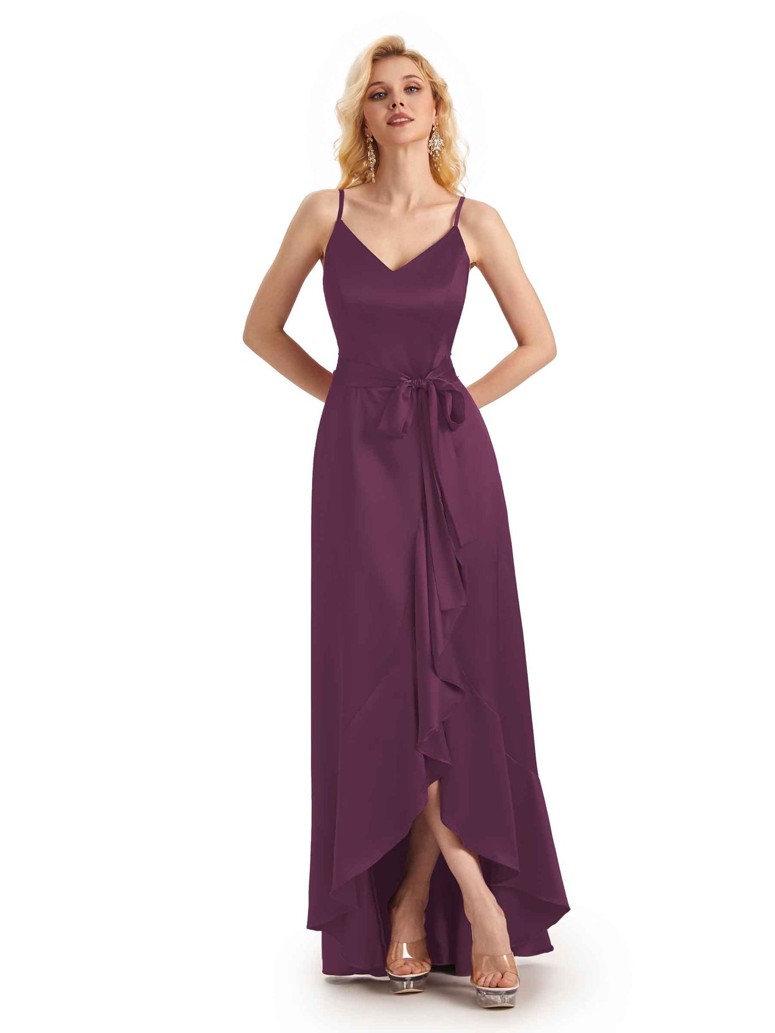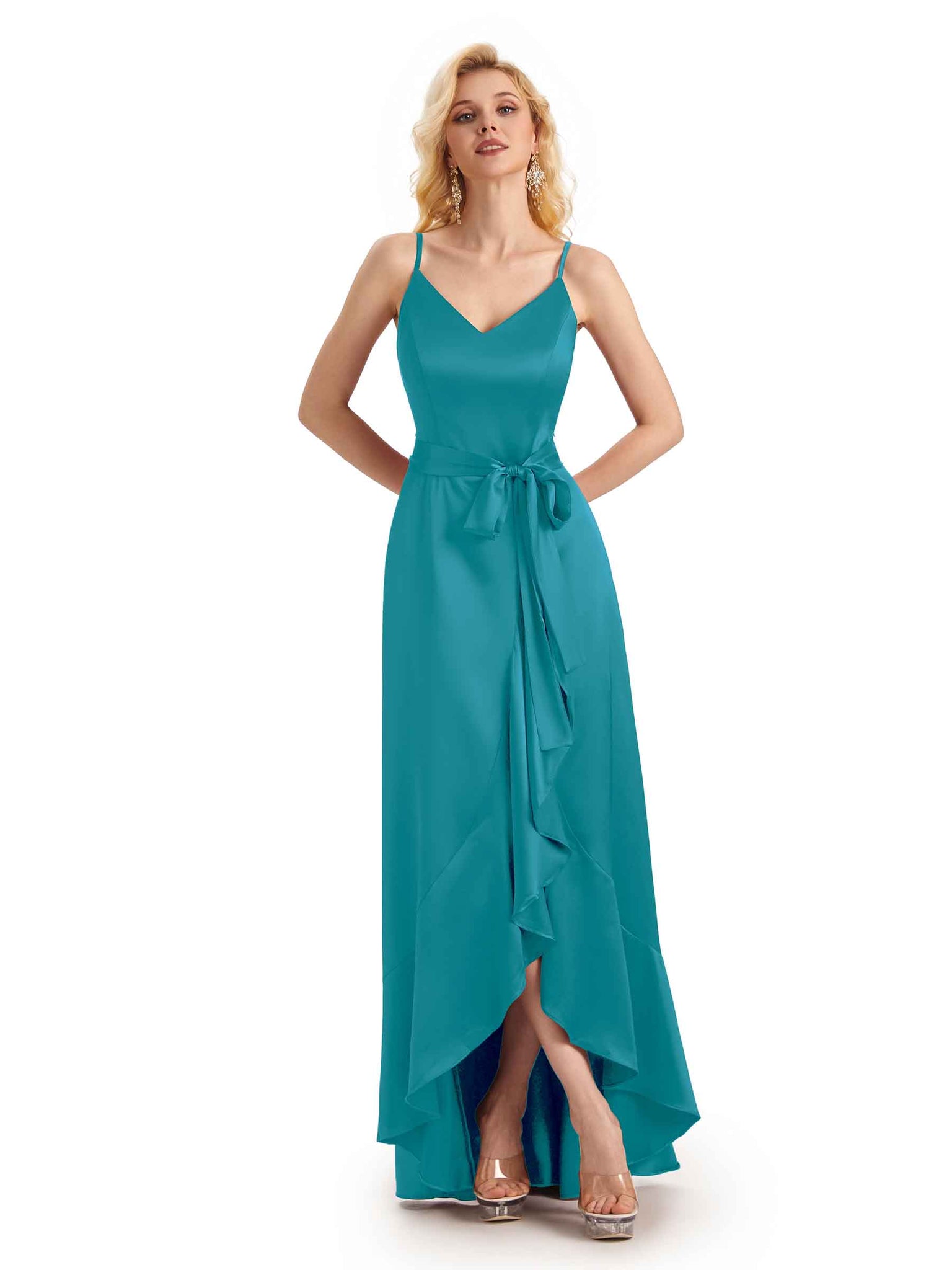 Elegant High Low V-neck Satin Formal Evening Dresses For Women Online