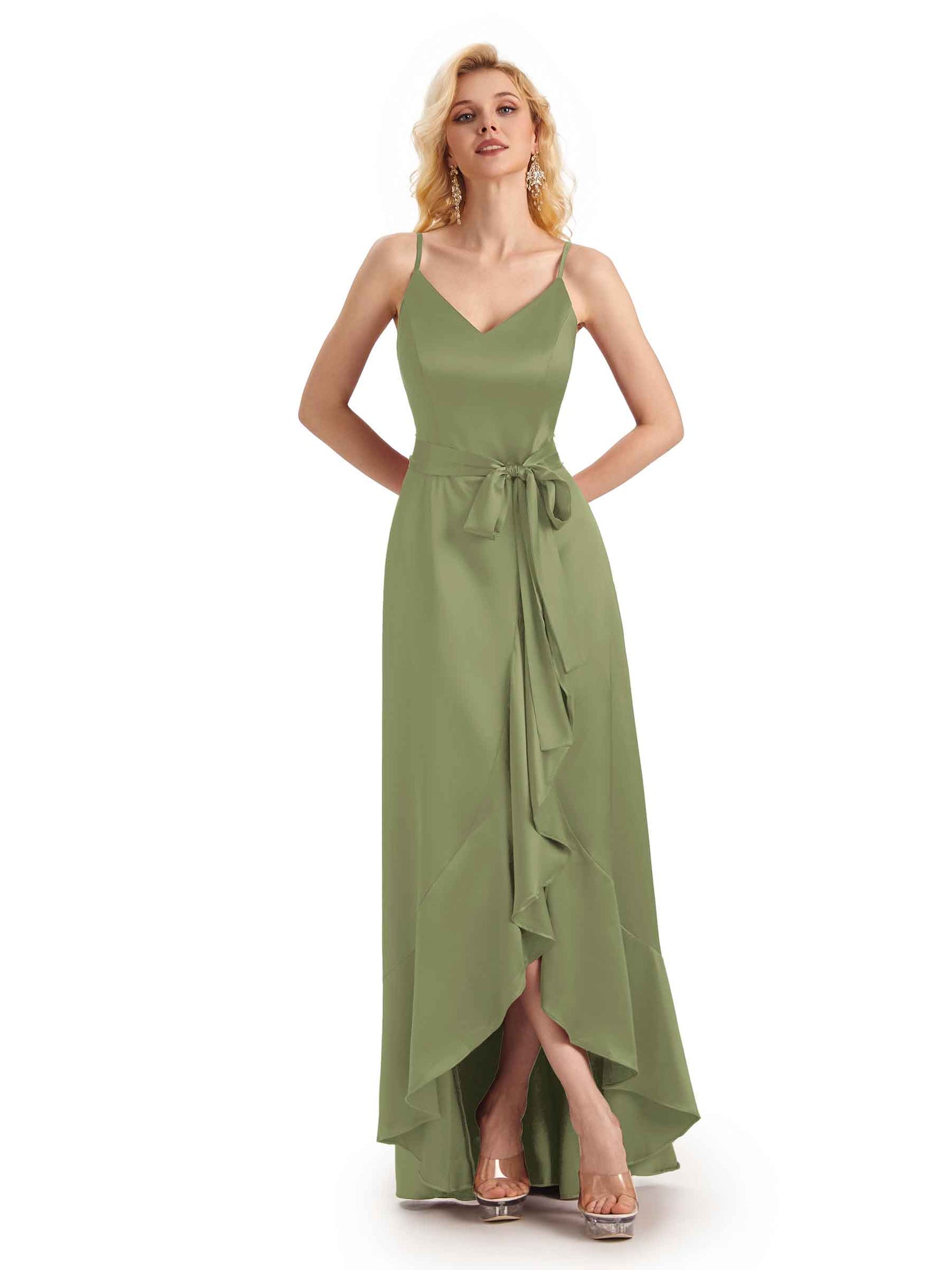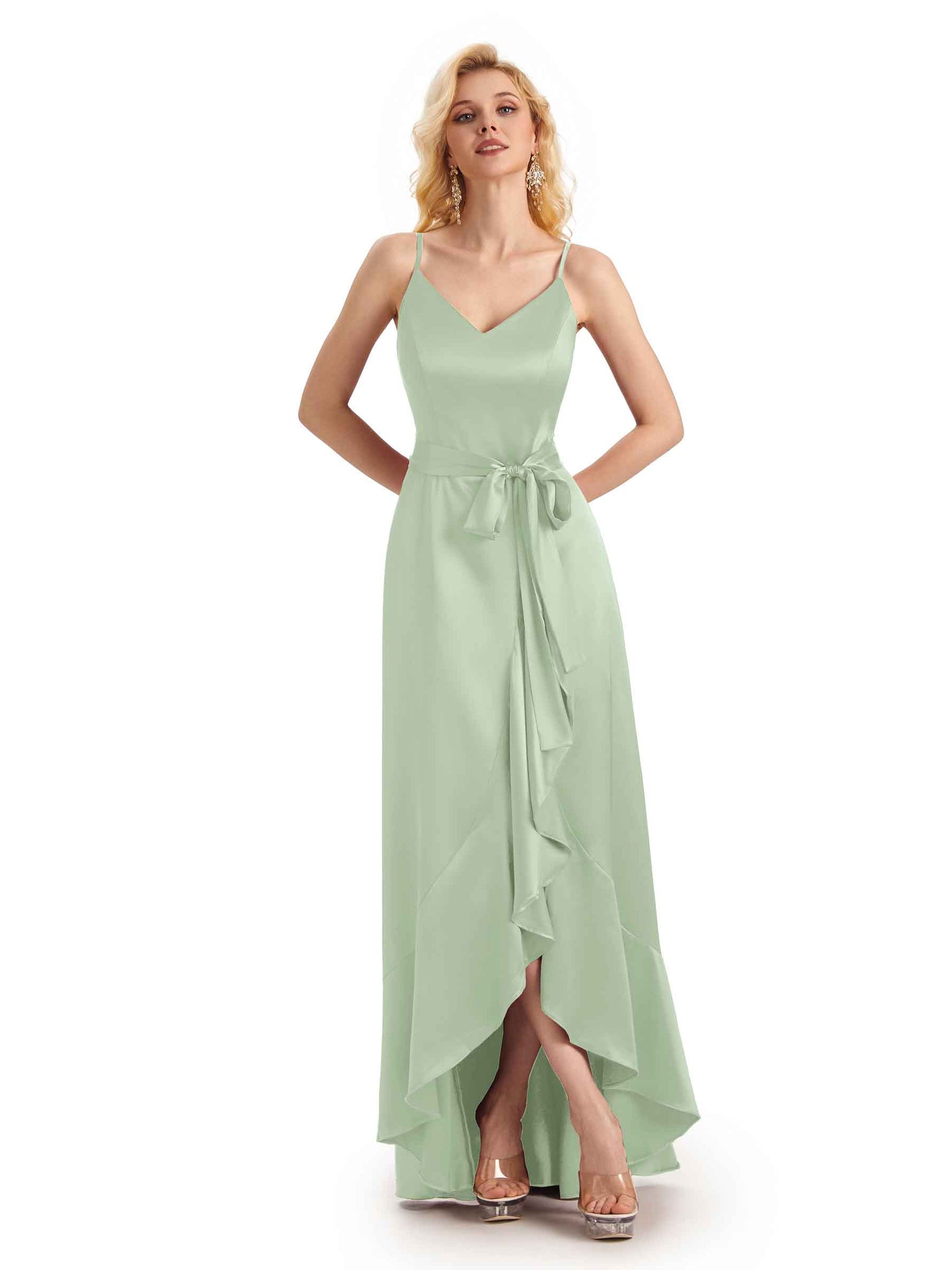 Elegant Spaghetti Straps A-line V-neck Asymmetrical Soft Satin Long Mermaid Bridesmaid Dresses- ChicSew – ChicSew