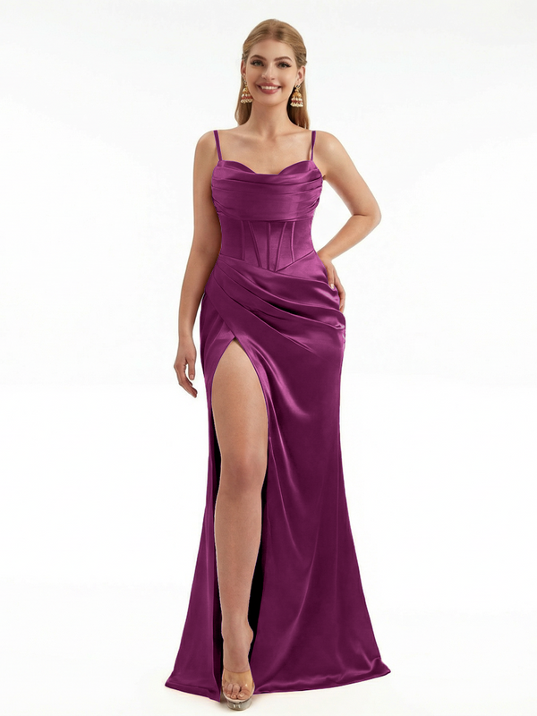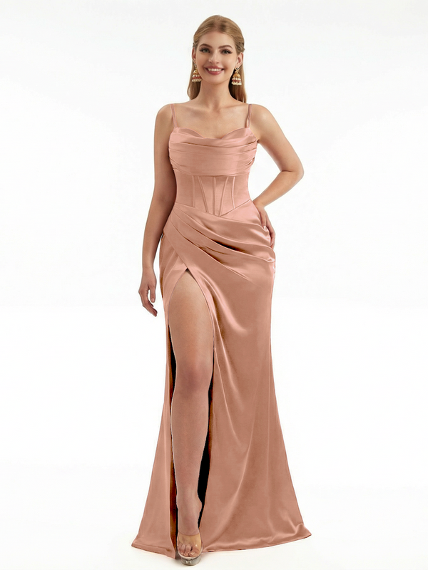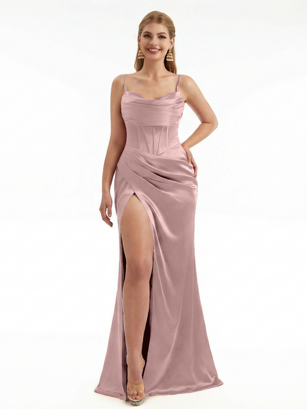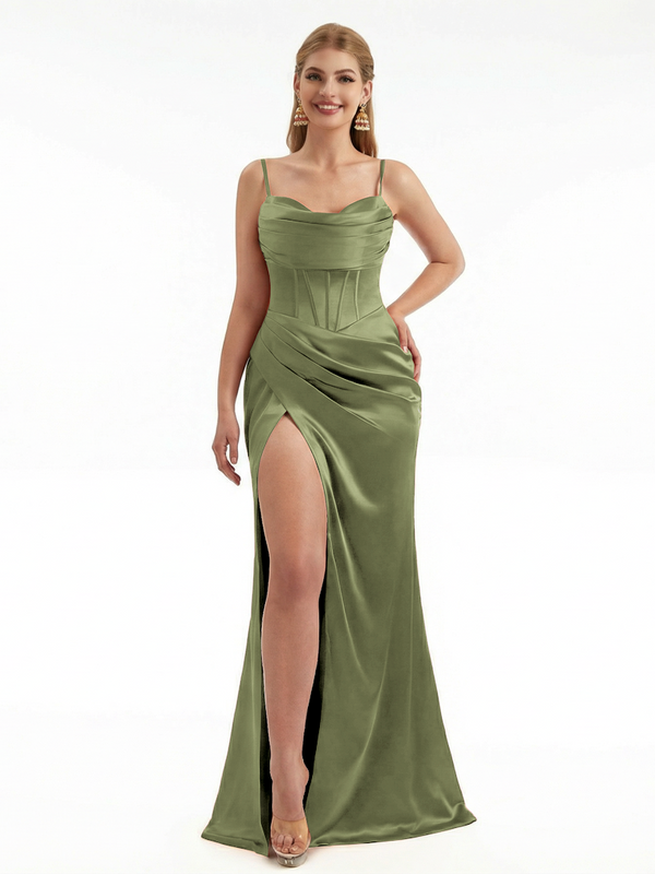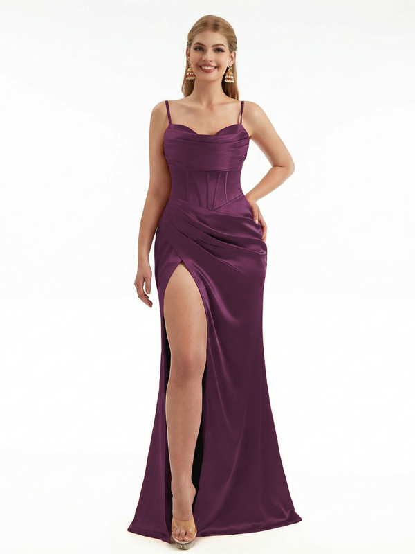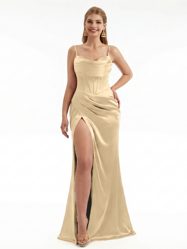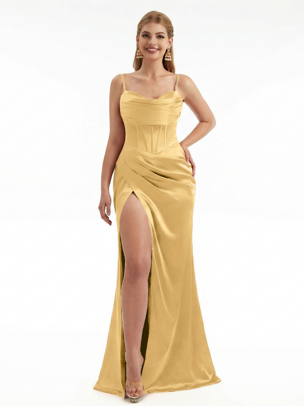Elegant Spaghetti Straps Boning Side Slit Mermaid Soft Satin Long Formal Dresses - ChicSew – ChicSew