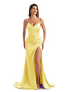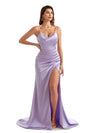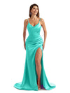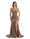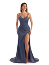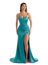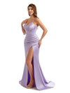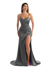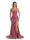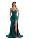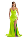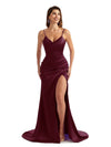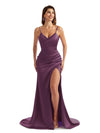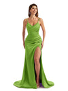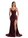 Elegant Spaghetti Straps Side Split Mermaid Ruched Satin Pretty Long Bridesmaid Dresses