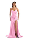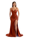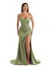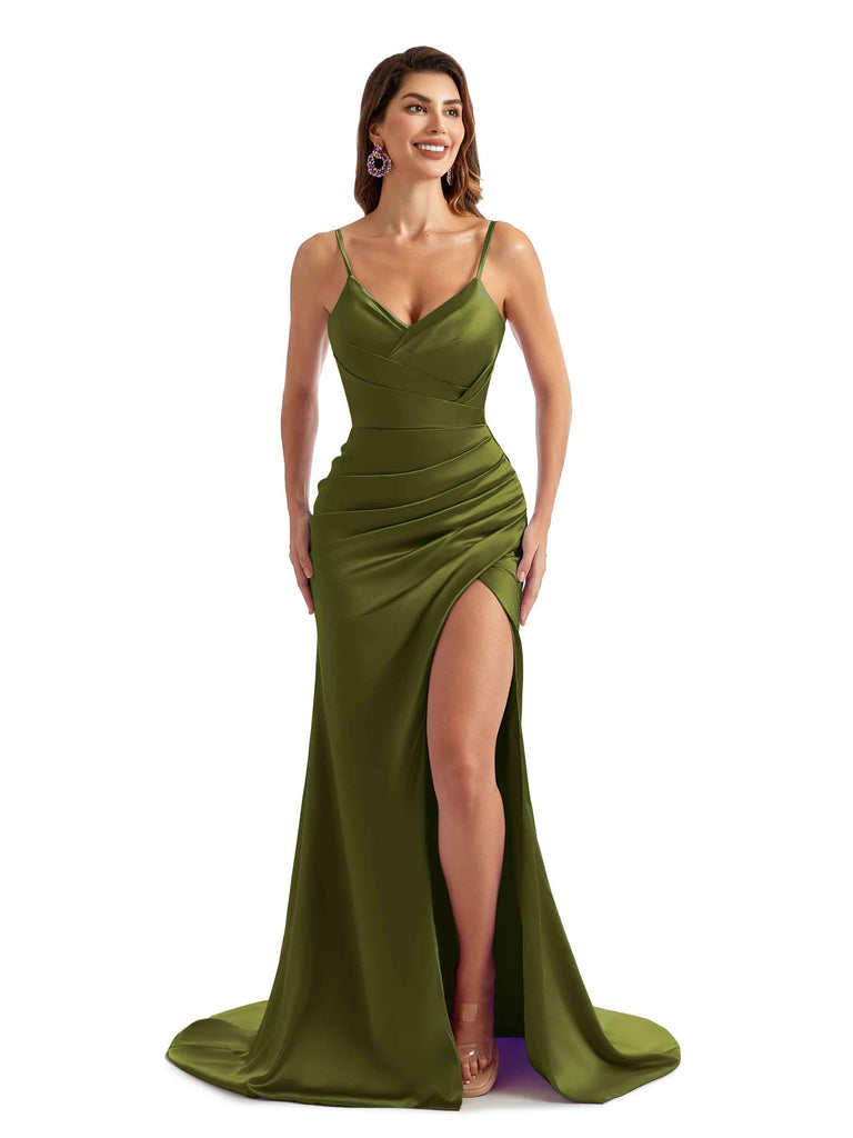 Elegant Spaghetti Straps Side Split Mermaid Ruched Satin Pretty Long Bridesmaid Dresses $139.99