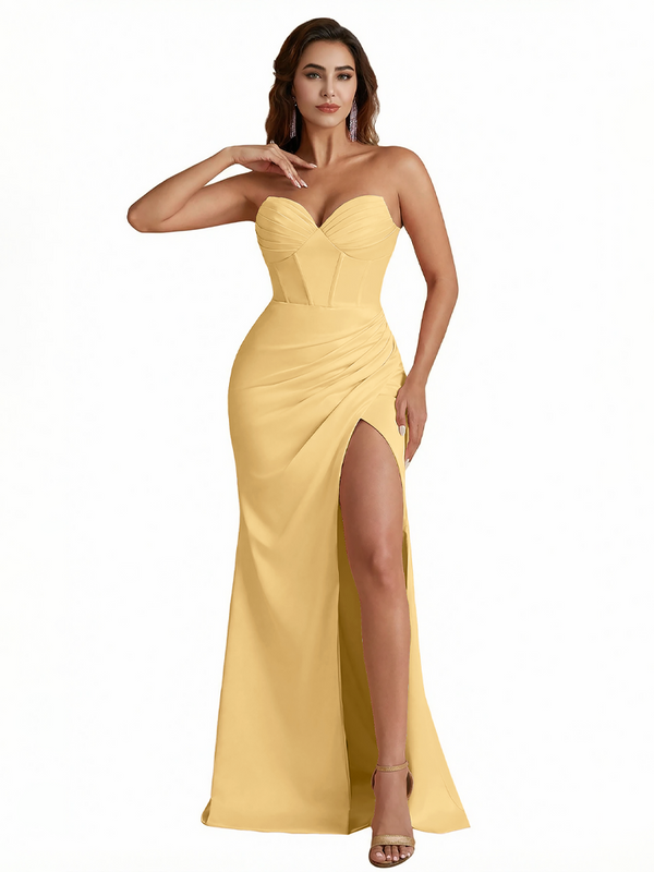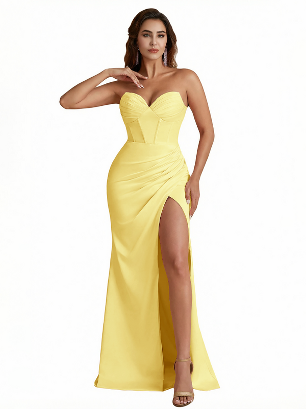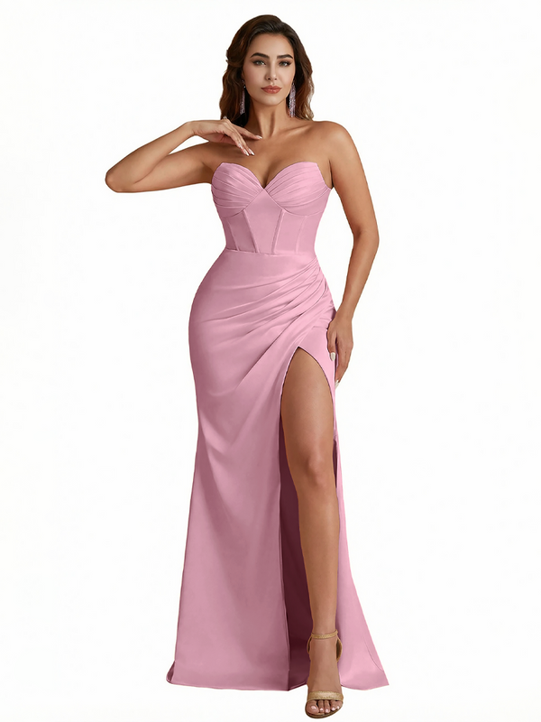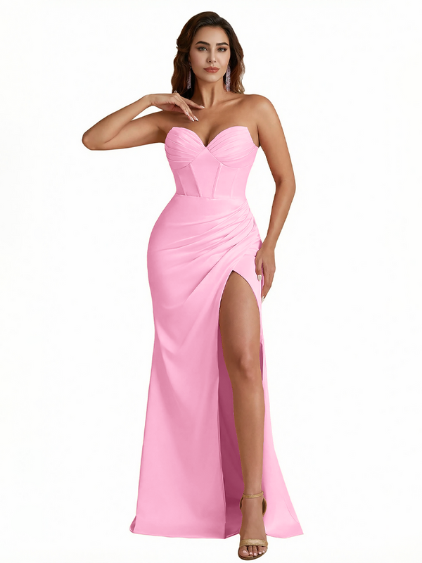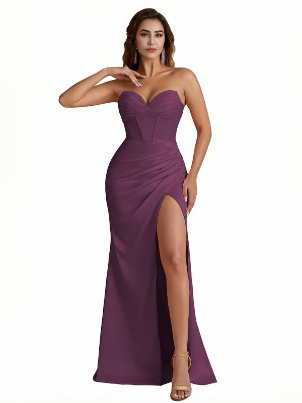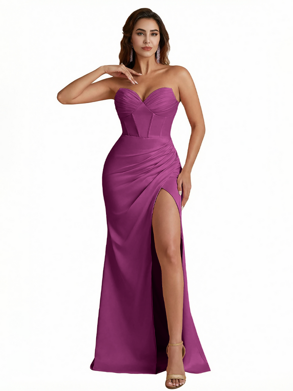 Elegant Sweetheart Strapless Mermaid Ruched Satin Long Formal Dresses Side Slit