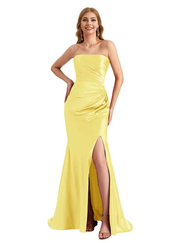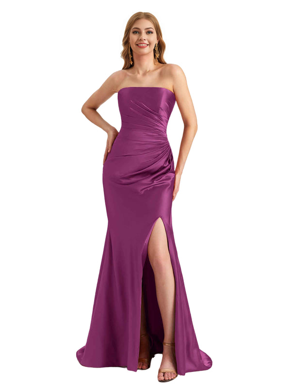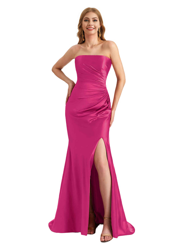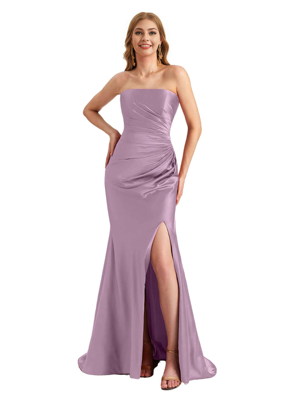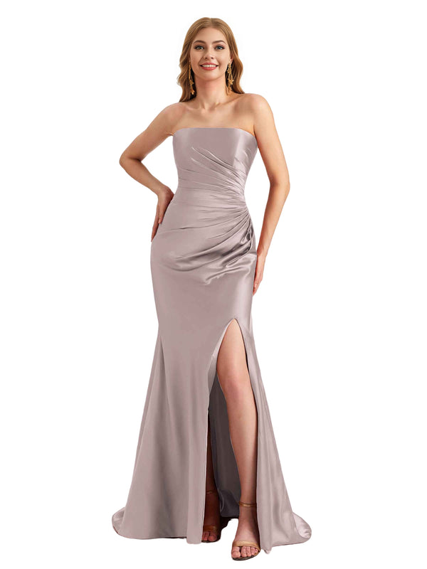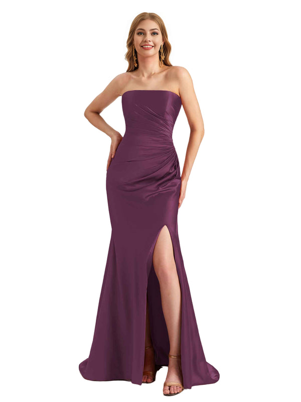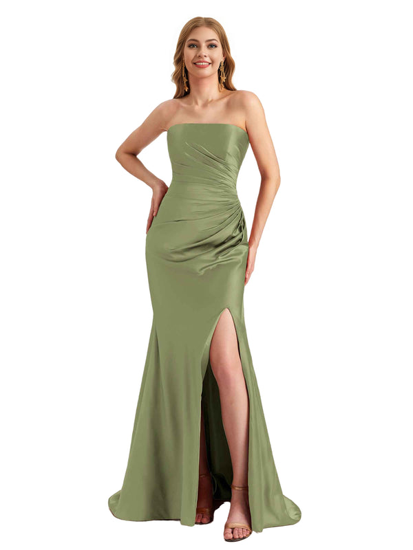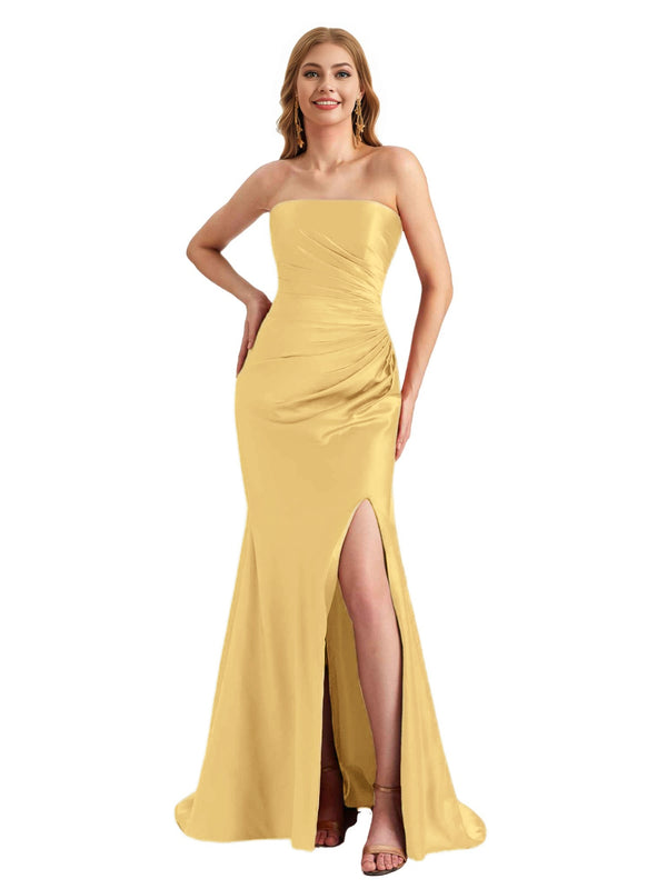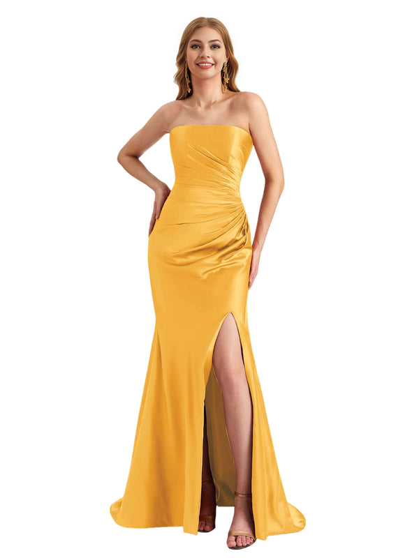 Elegant Sweetheart Strapless Silky Satin Side Split Mermaid Long Bridesmaid Dresses