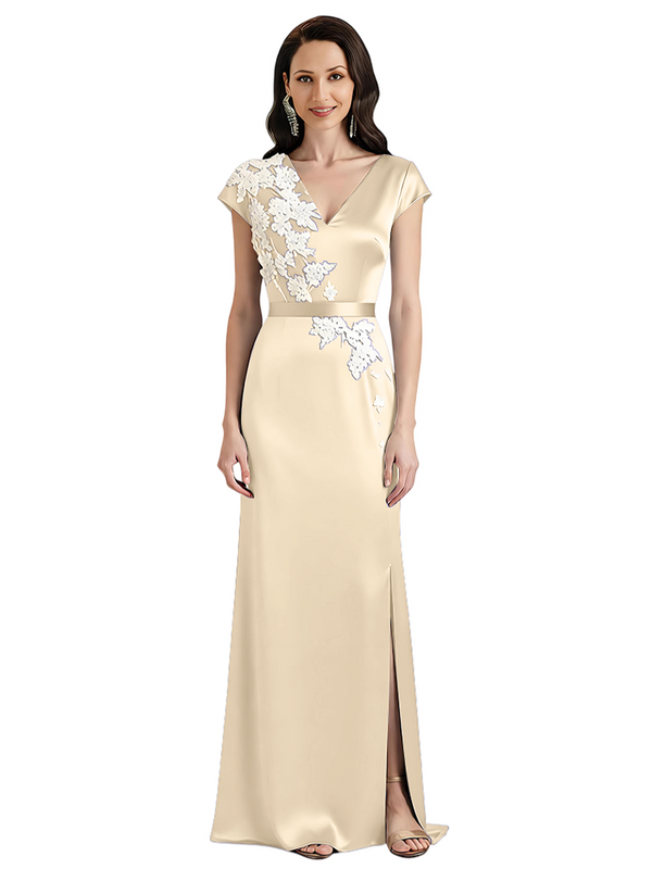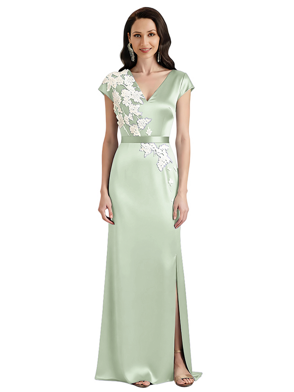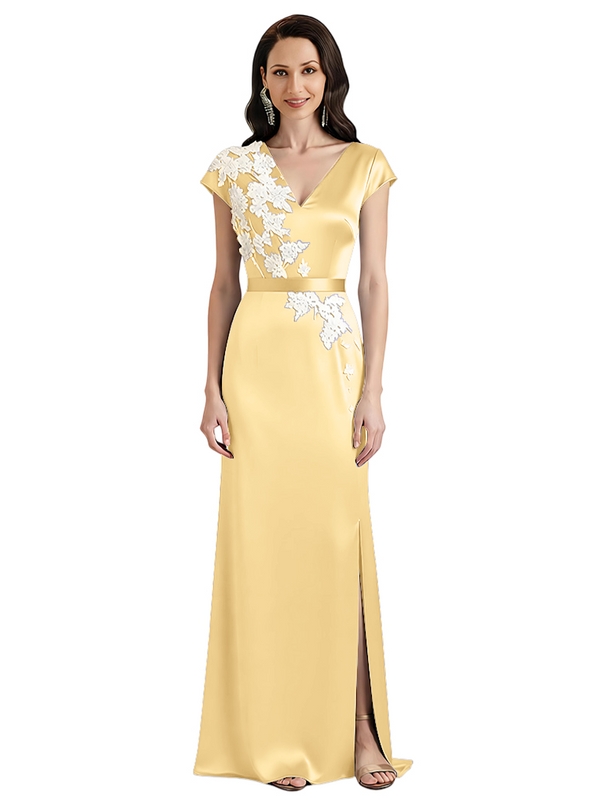 Elegant V-Neck Cap Sleeves Side Slit Satin Mermaid Floor-Length Mother Of The Bride Dresses