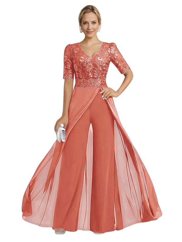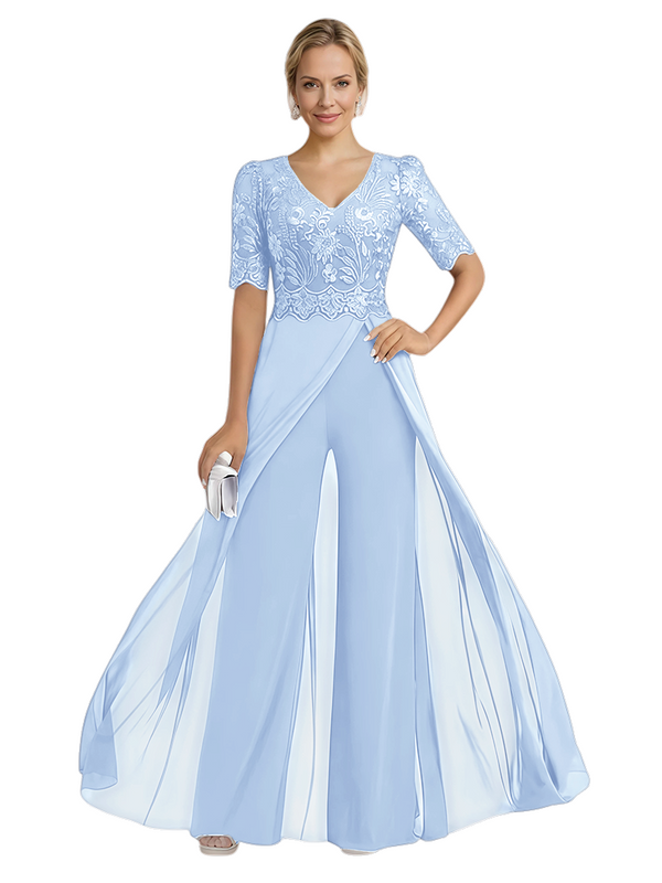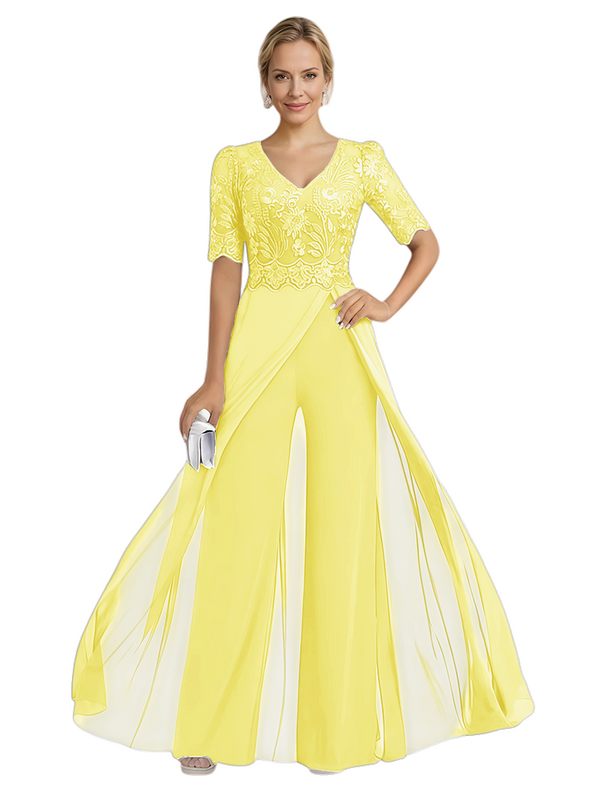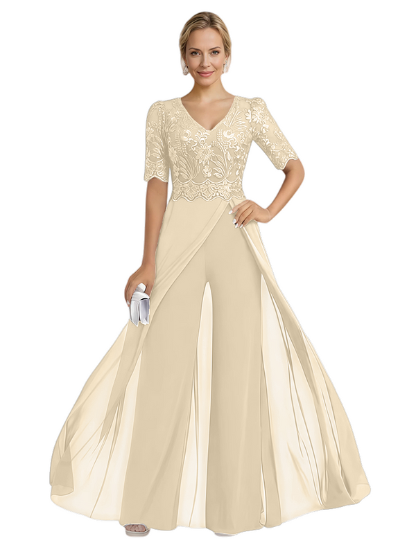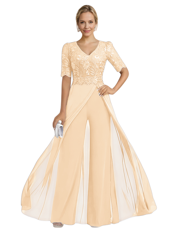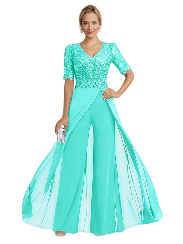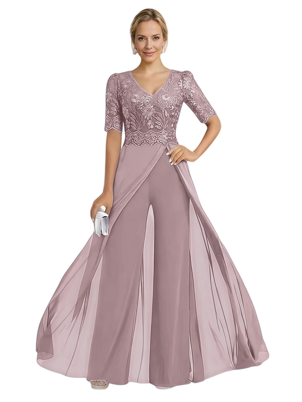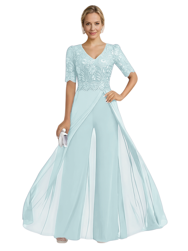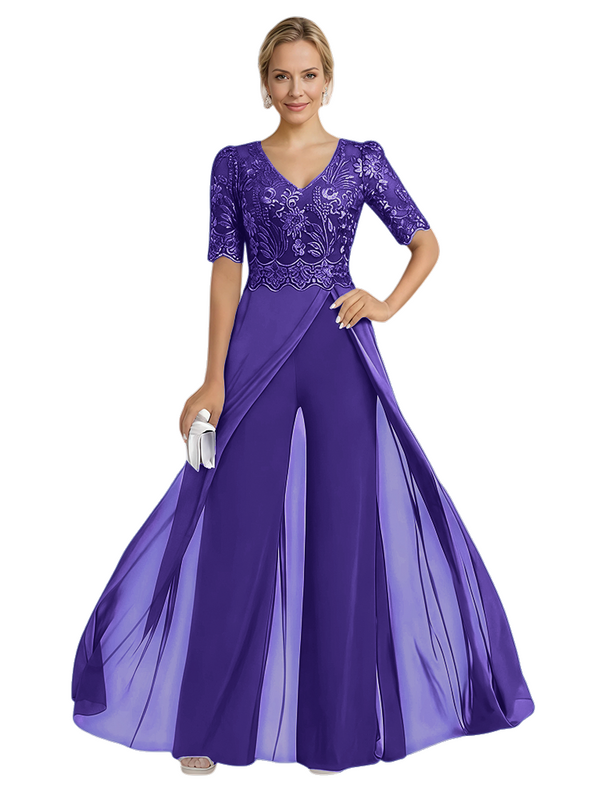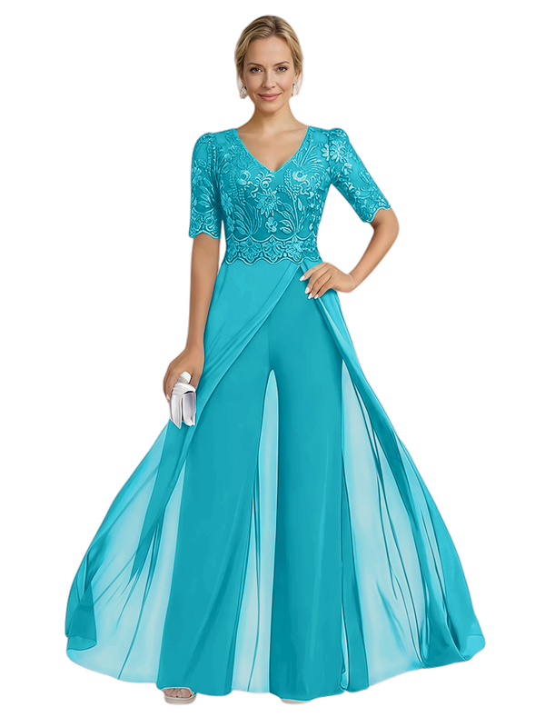 Elegant V-neck Chiffon And Lace Half Sleeves Jumpsuit For Mother Of The Bride