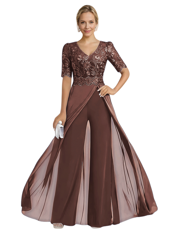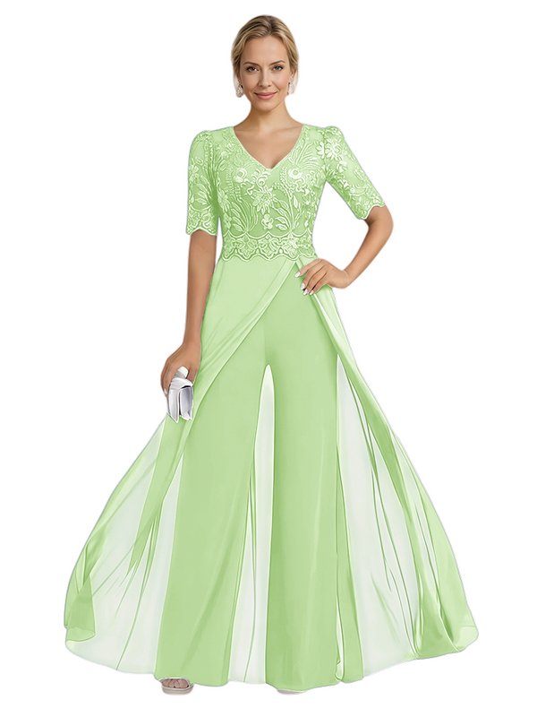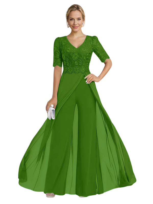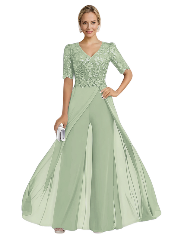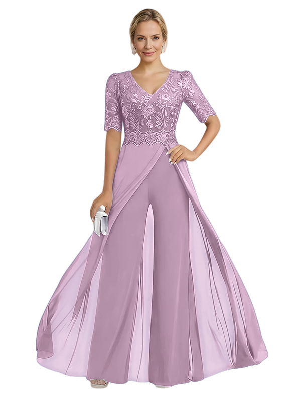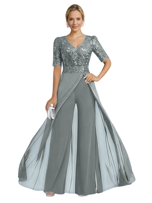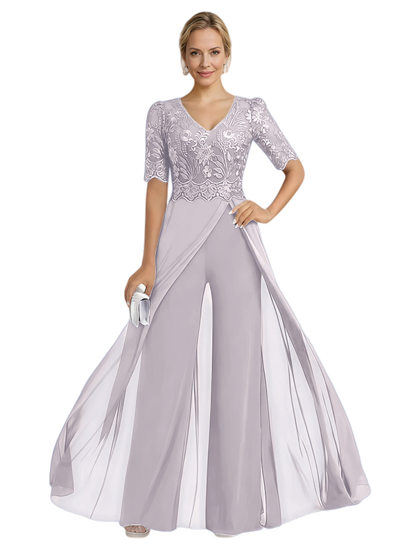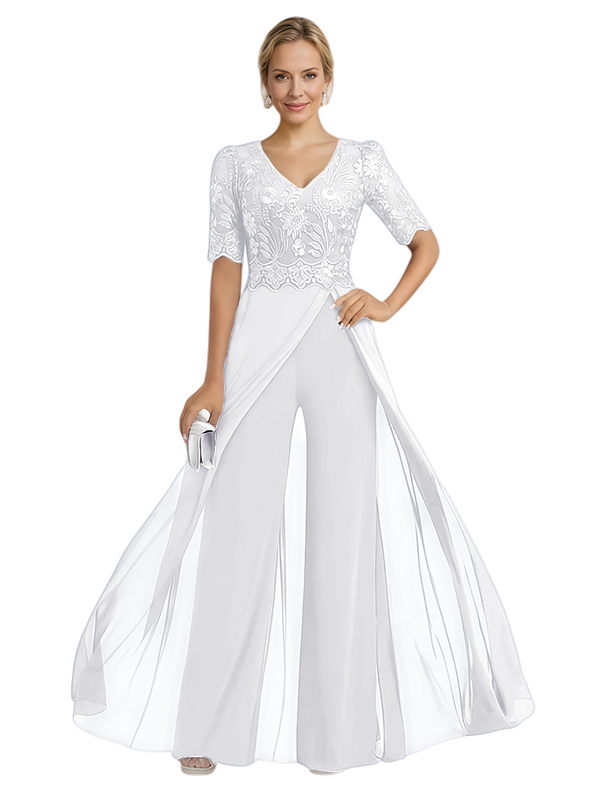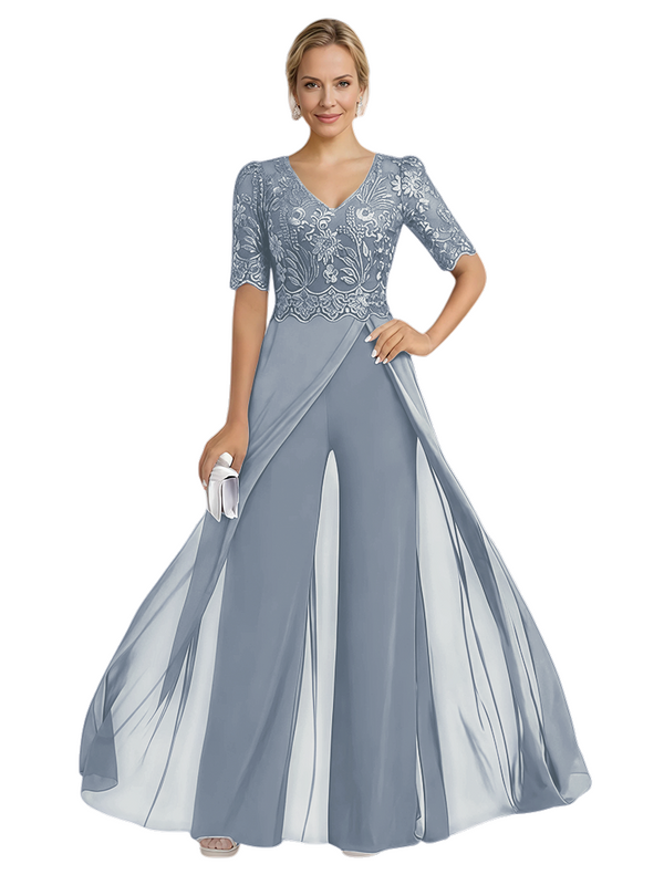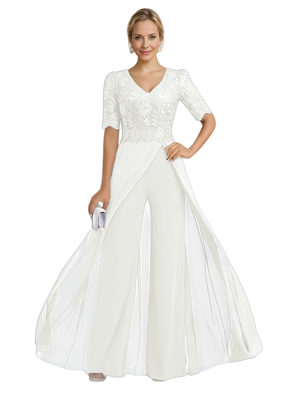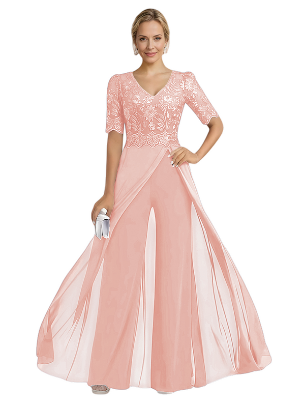 Elegant V-neck Chiffon And Lace Half Sleeves Jumpsuit For Mother Of The Bride- ChicSew – ChicSew