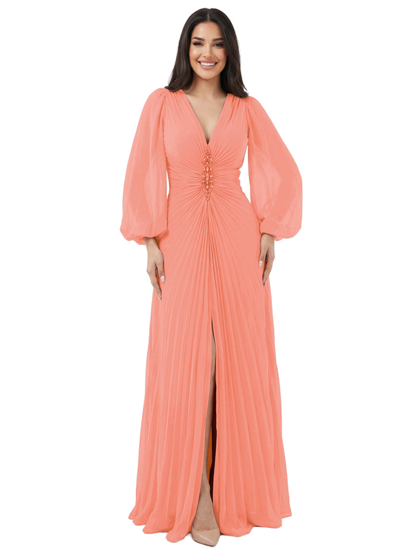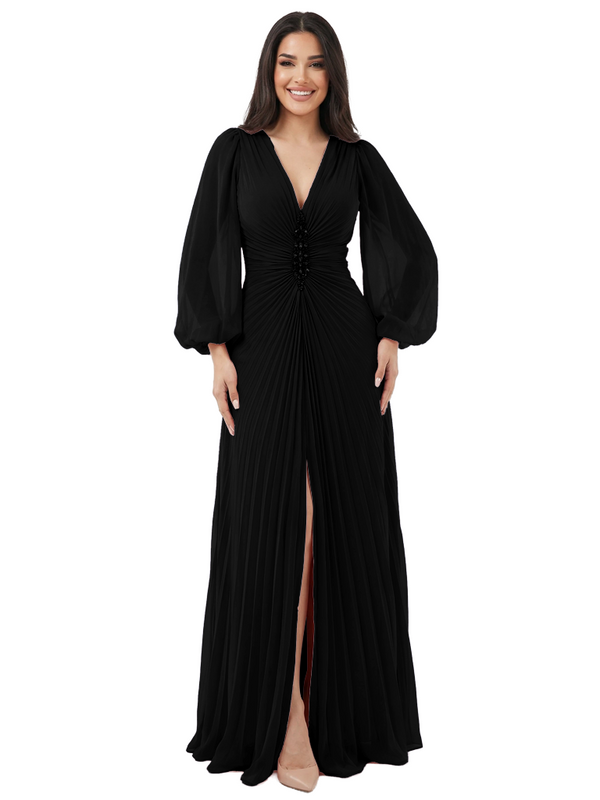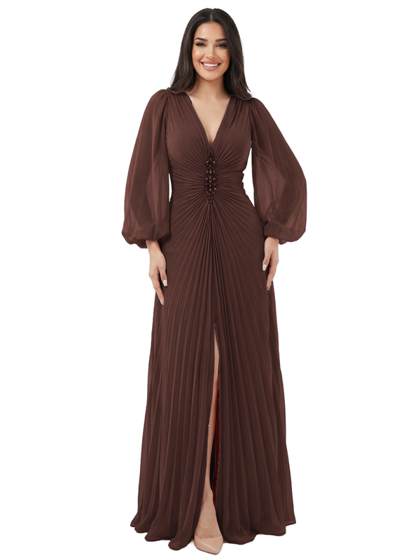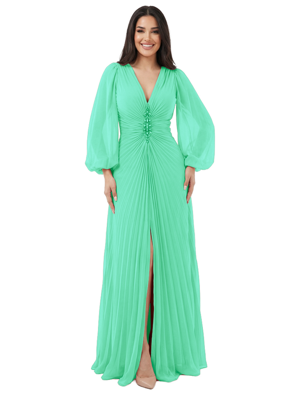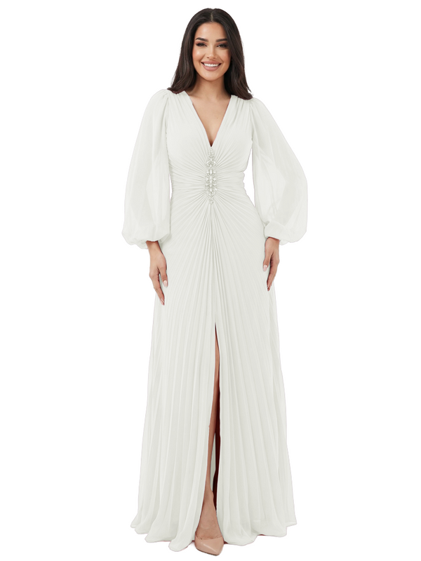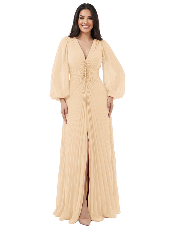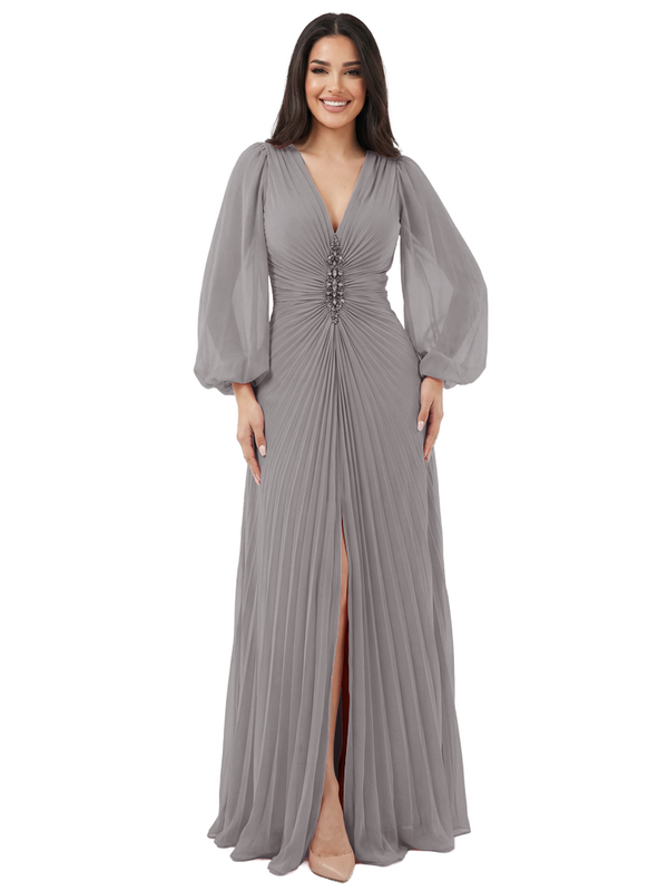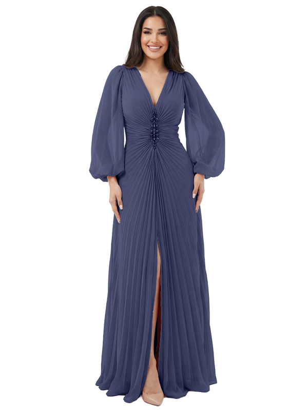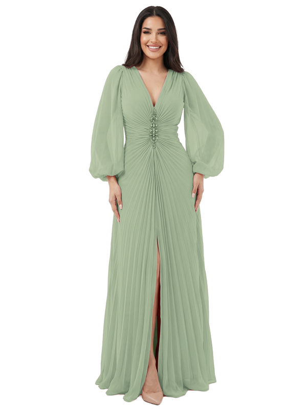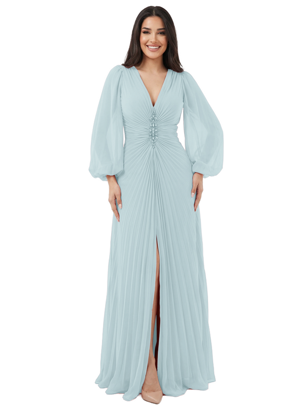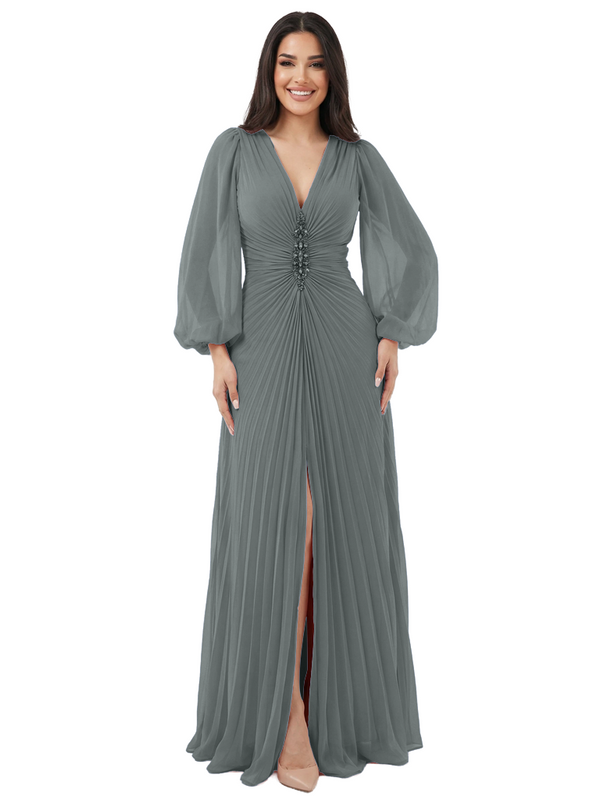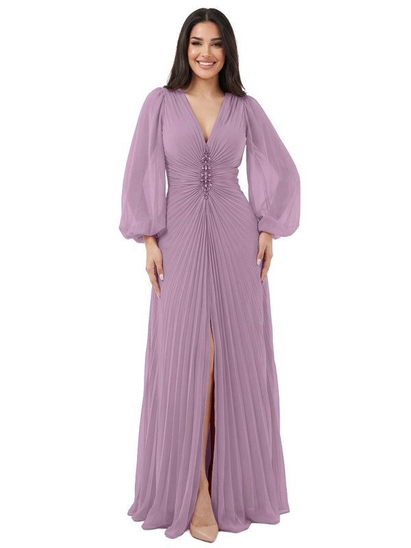 Elegant V-neck Lantern Sleeves Beaded Front Slit A-Line Chiffon Mother Of The Bride Dress- ChicSew – ChicSew