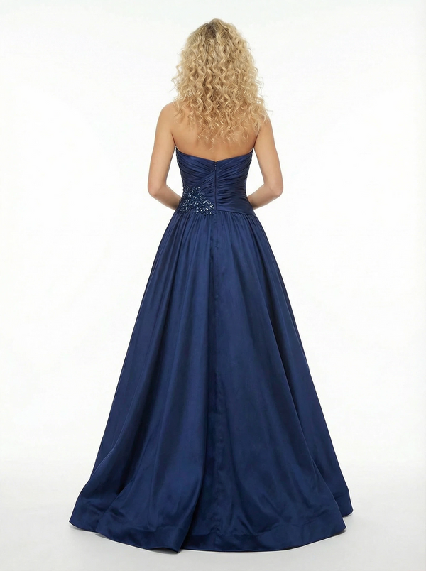 Elegent Strapless Satin Sweetheart Beaded Floor Length Party Prom Dresses Side Slit