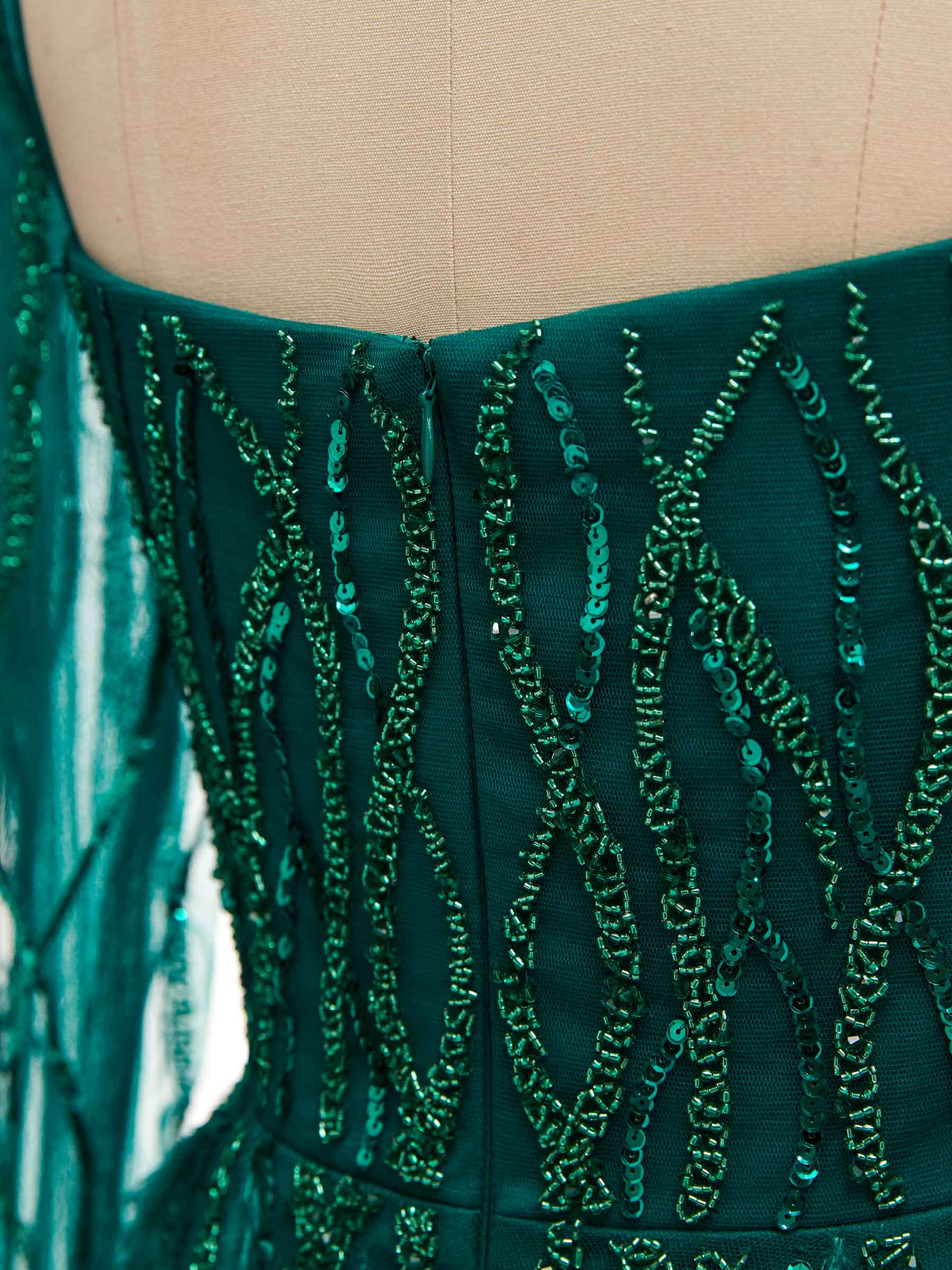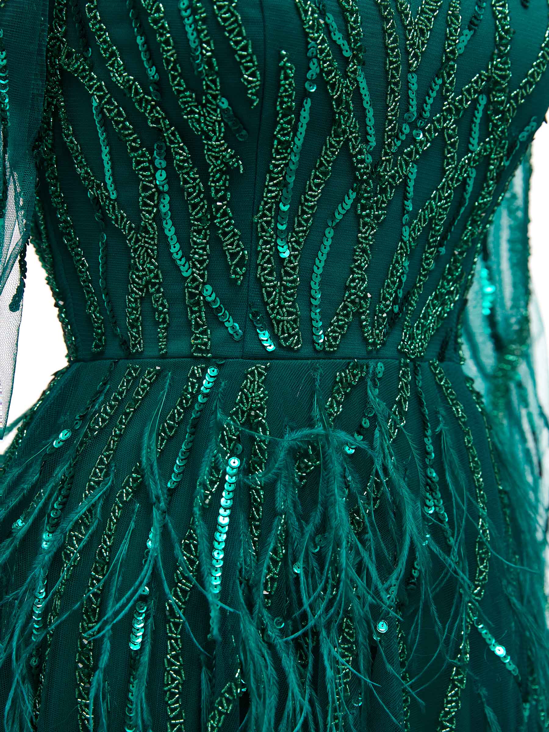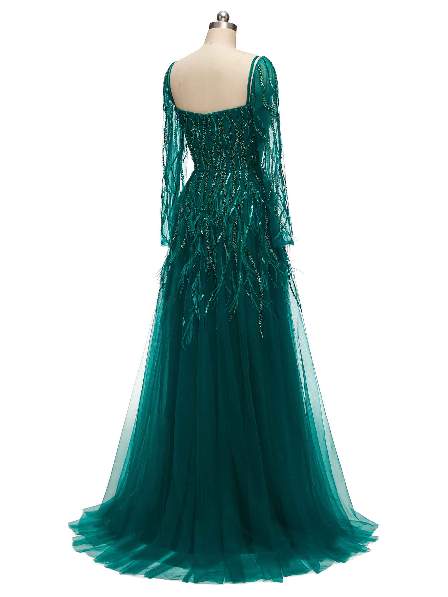 Green A-line Long Sleeves Floor-length Heavily Beaded Long Formal Prom Dresses