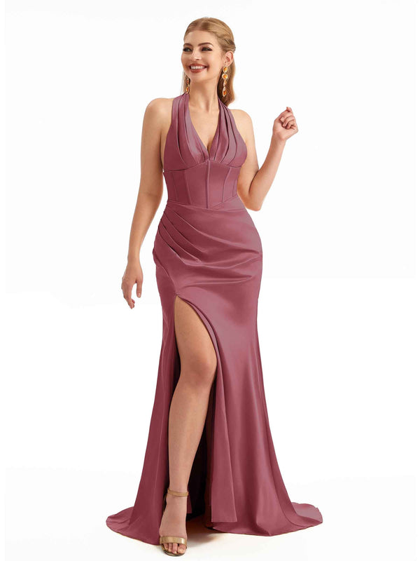 Halter V-Neck Boho Bridesmaid Dresses Satin Fabric $108.99