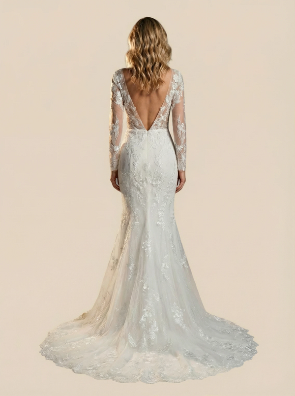 Mermaid Long Sleeves V-Neck Lace Maxi Long Wedding Dresses With Train - ChicSew – ChicSew