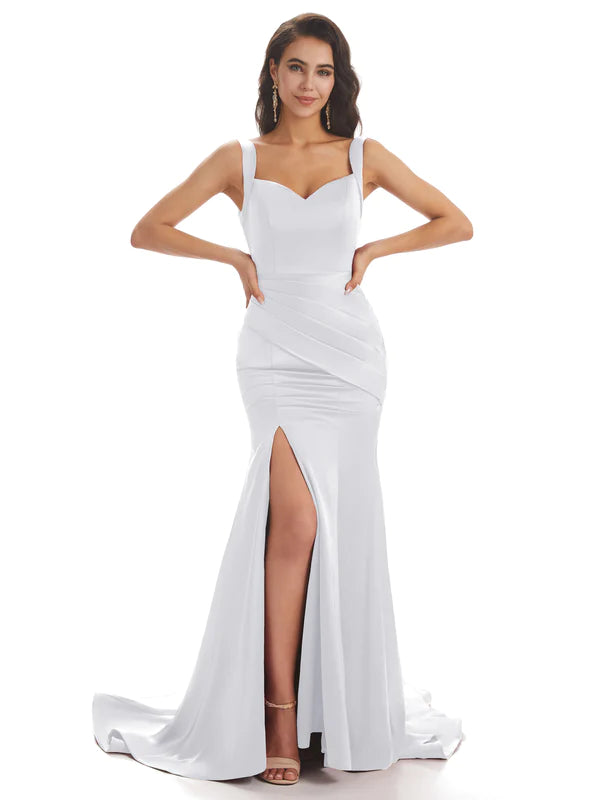 Mismatched White Sexy Side Slit Mermaid Soft Satin Long Bridesmaid Dresses Online