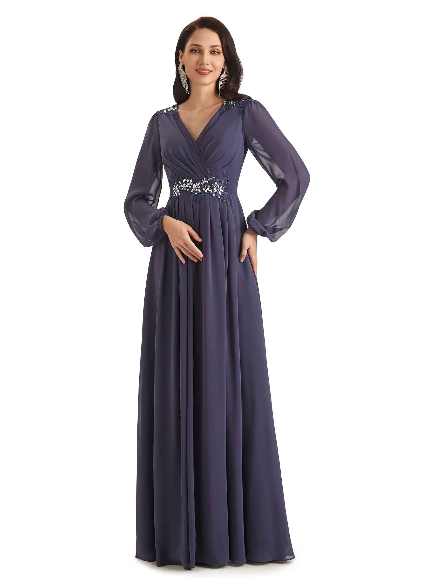 Modern Chiffon Long Sleeves V-neck Long Mother of The Bride Dresses