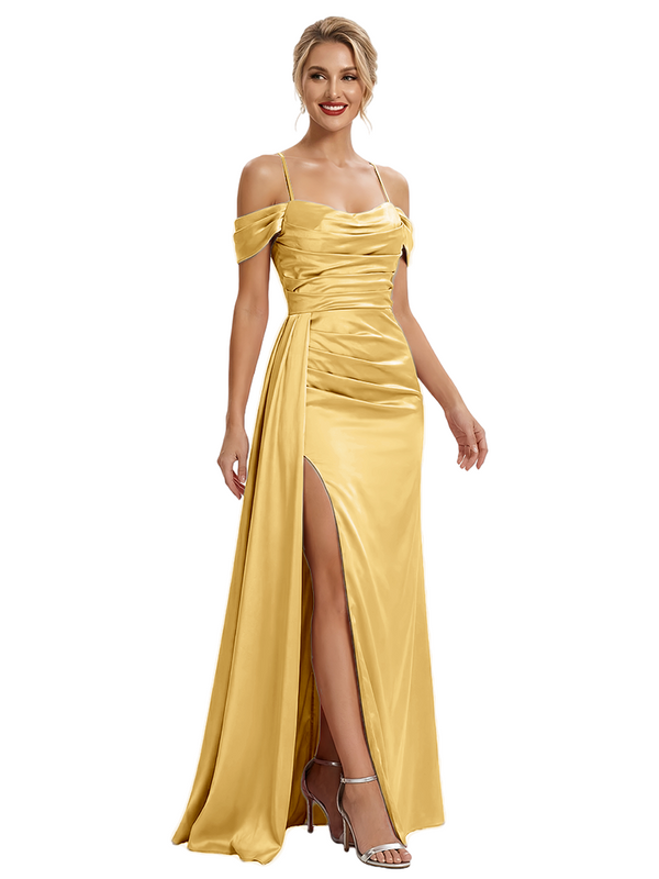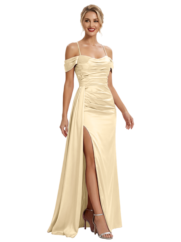 Modern Cold Shoulder Ruched Satin Maxi Prom Dresses with Slit $169.99