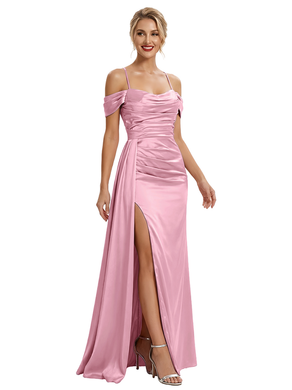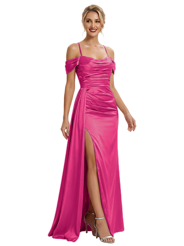 Modern Cold Shoulder Pleated Satin Prom Dresses with Slit- ChicSew – ChicSew