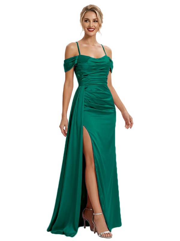 Modern Cold Shoulder Ruched Satin Maxi Prom Dresses with Slit