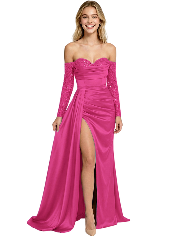 Modern Sweetheart Off Shoulder Long Sleeve High Side Slit Ruched Satin Mermaid Prom Dress