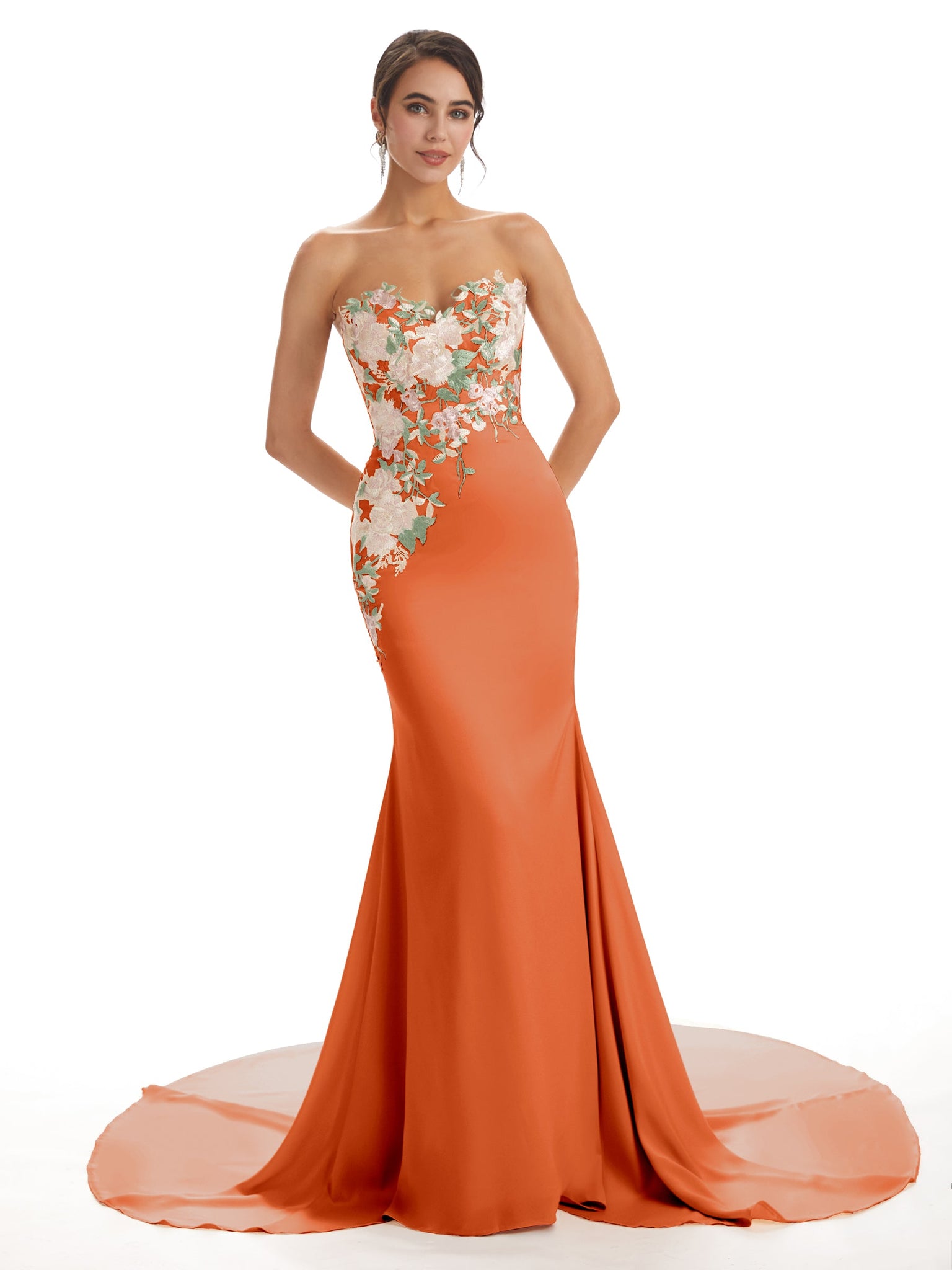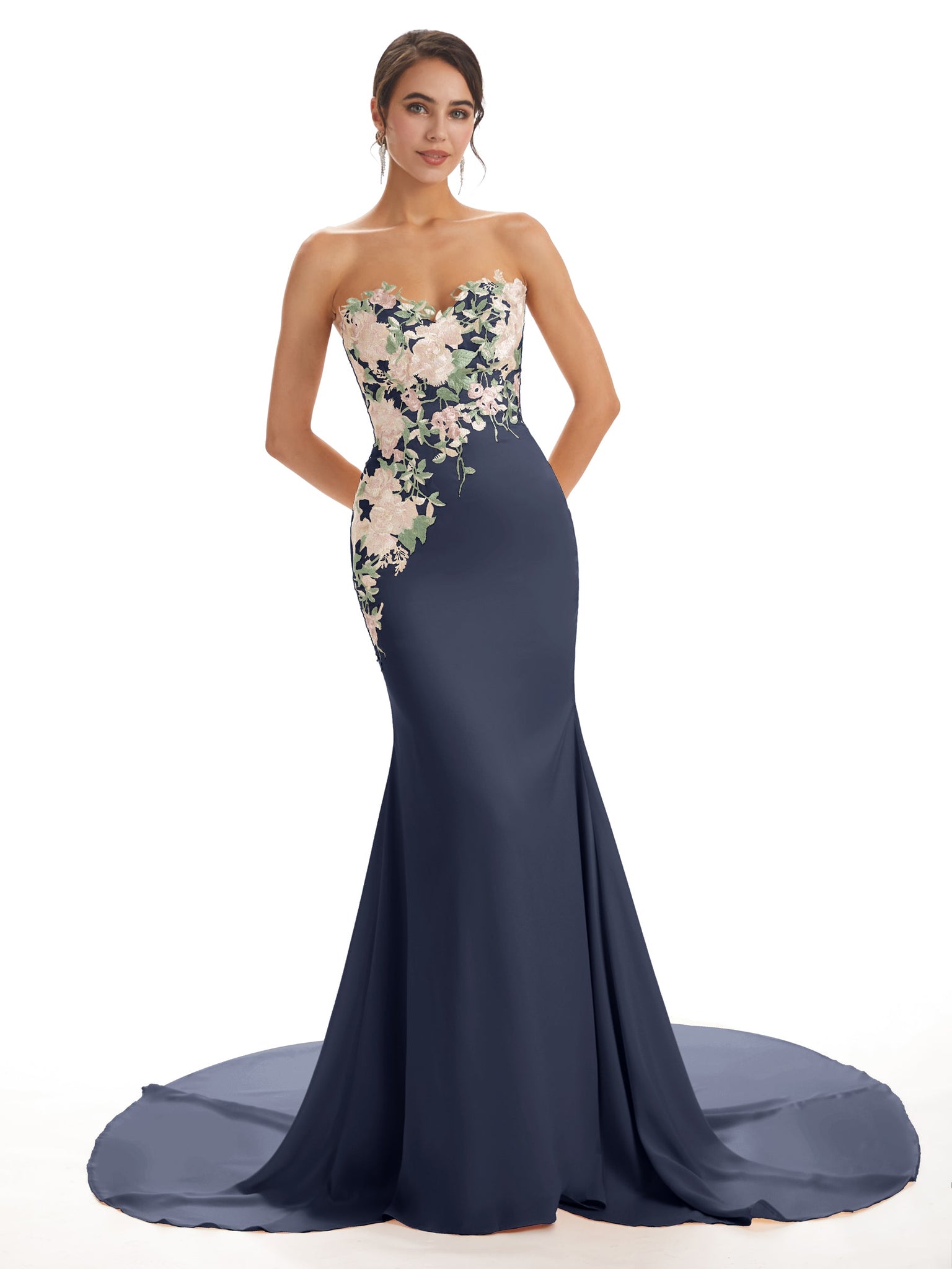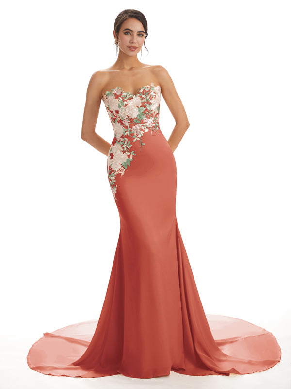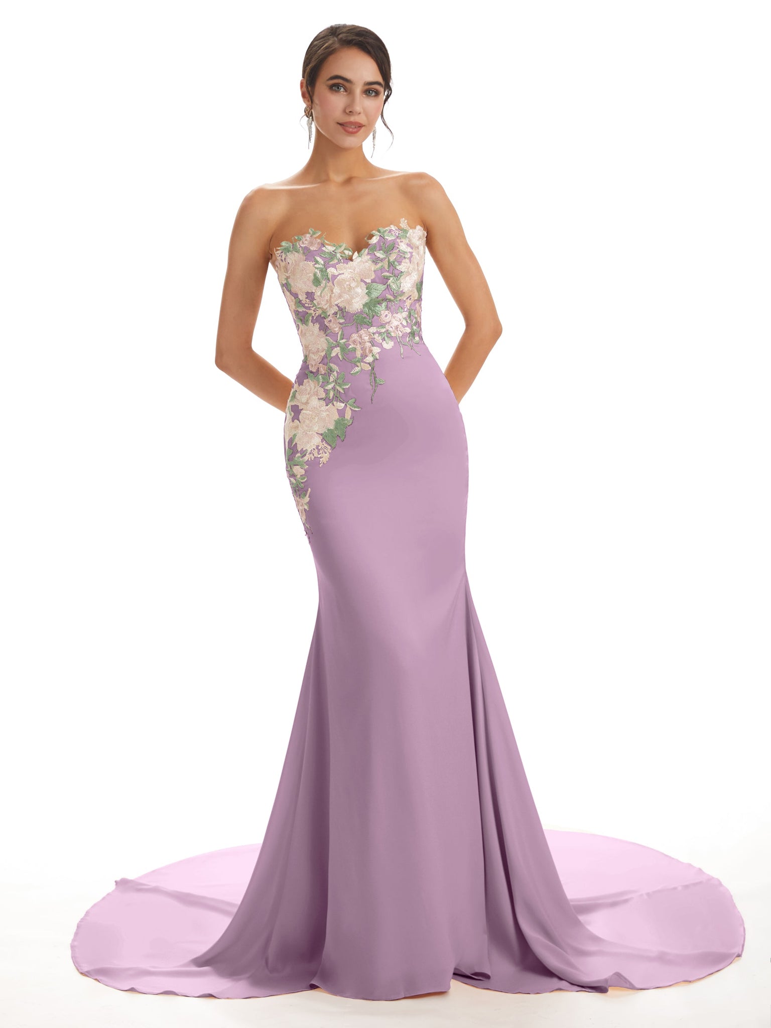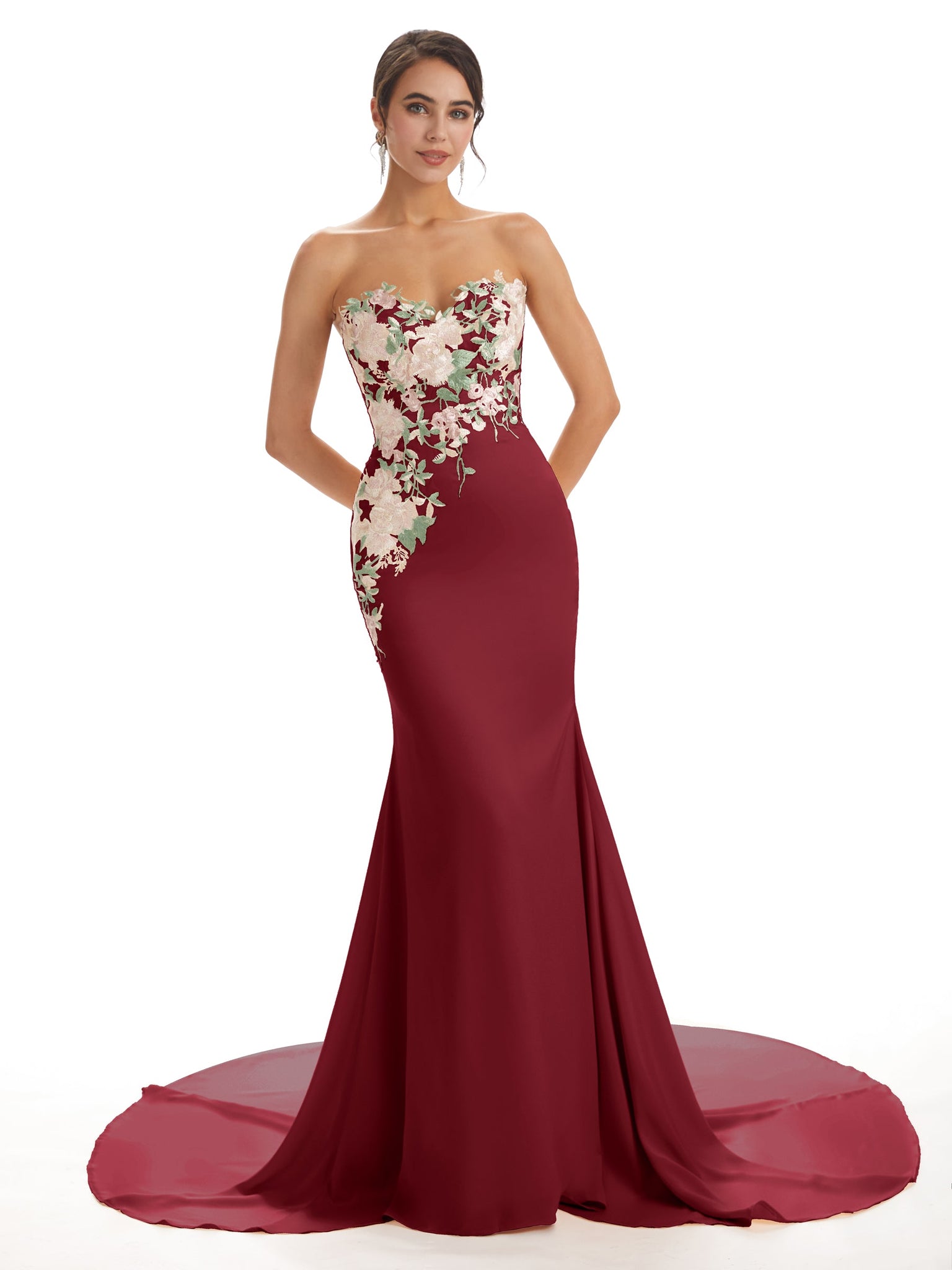 Modern Sweetheart Soft Satin Lace Applique Mermaid Long Wedding Bridesmaid Dresses - ChicSew – ChicSew