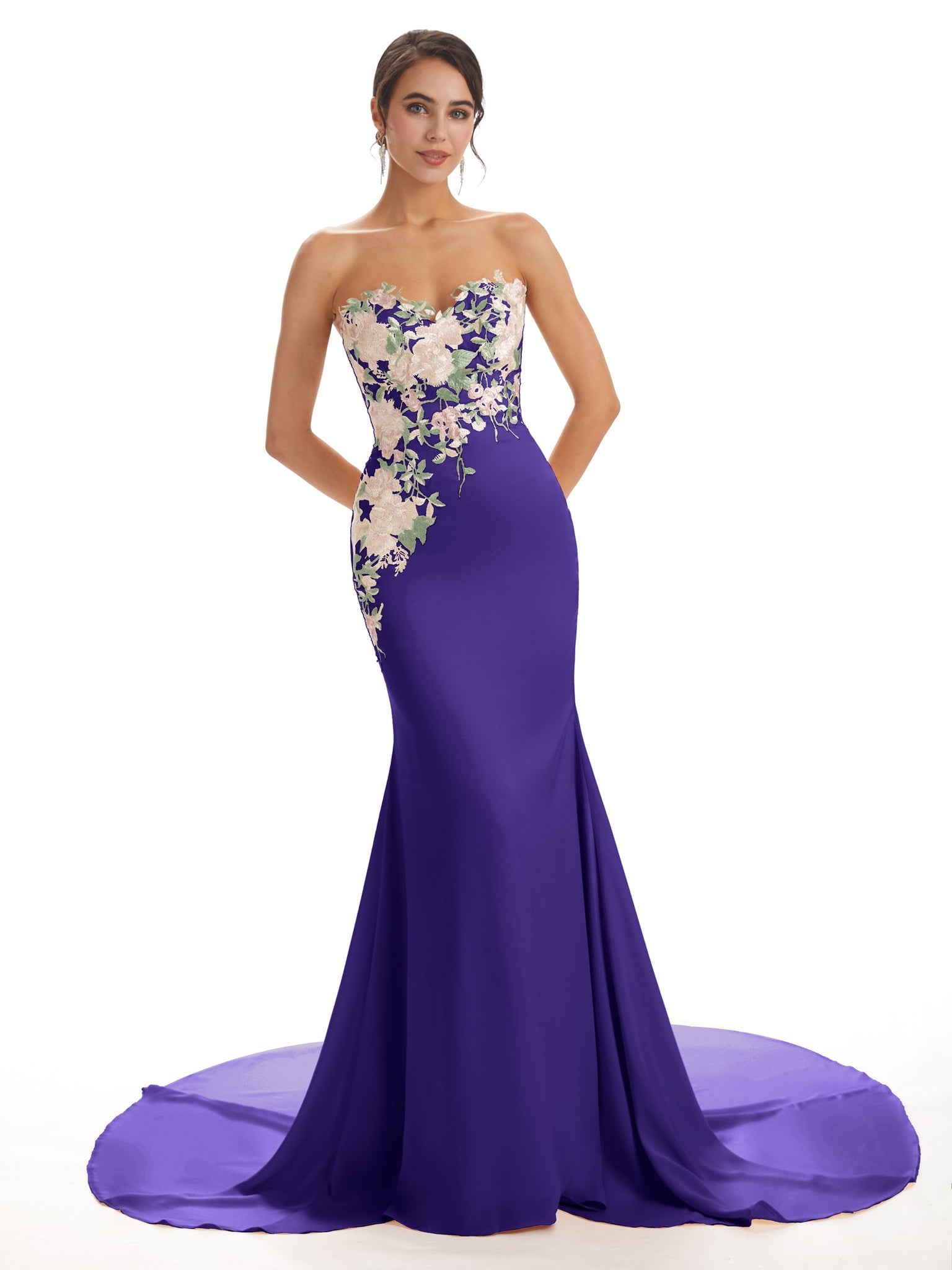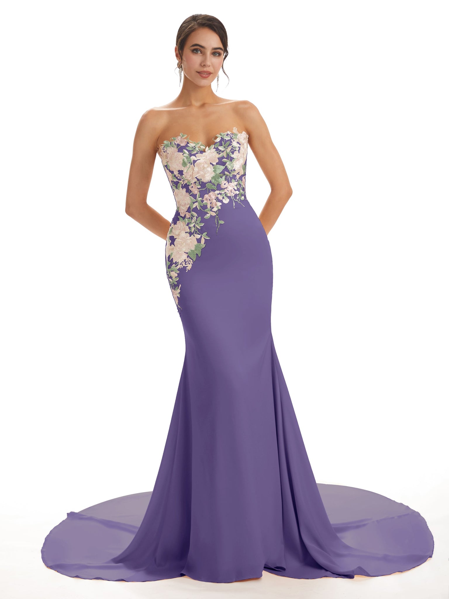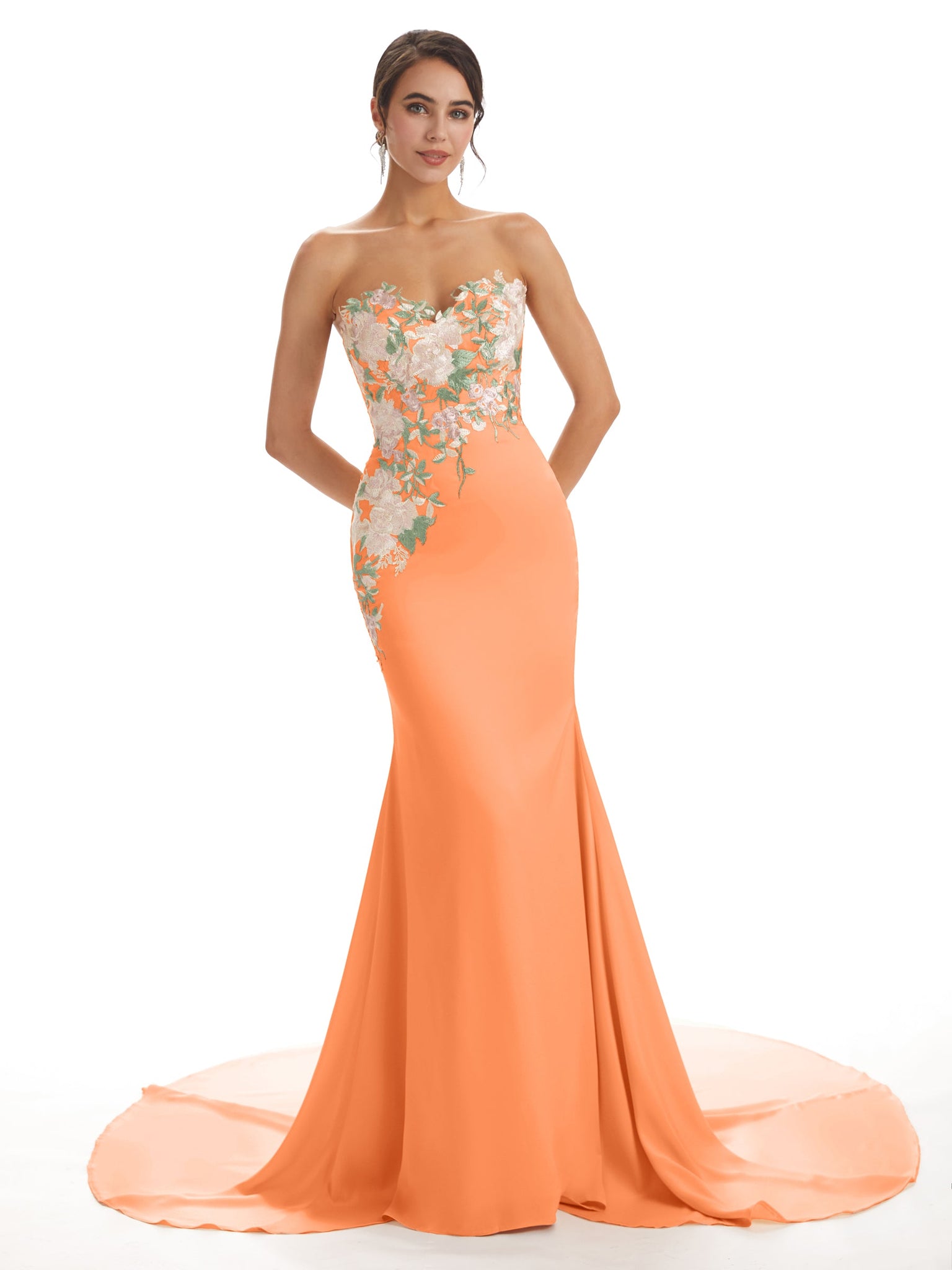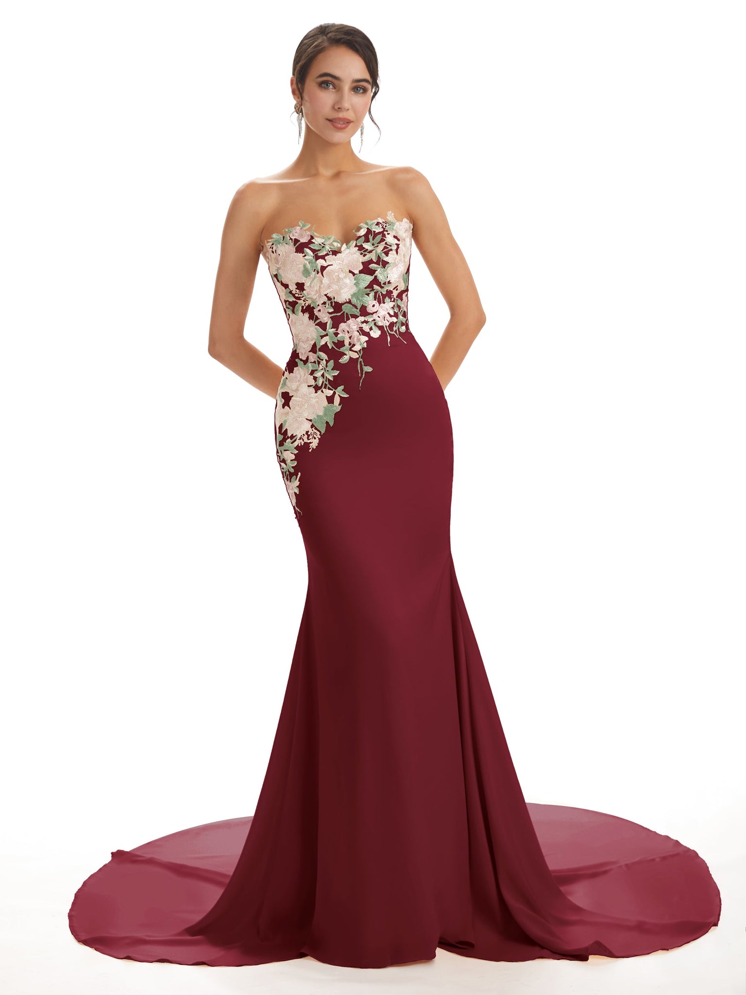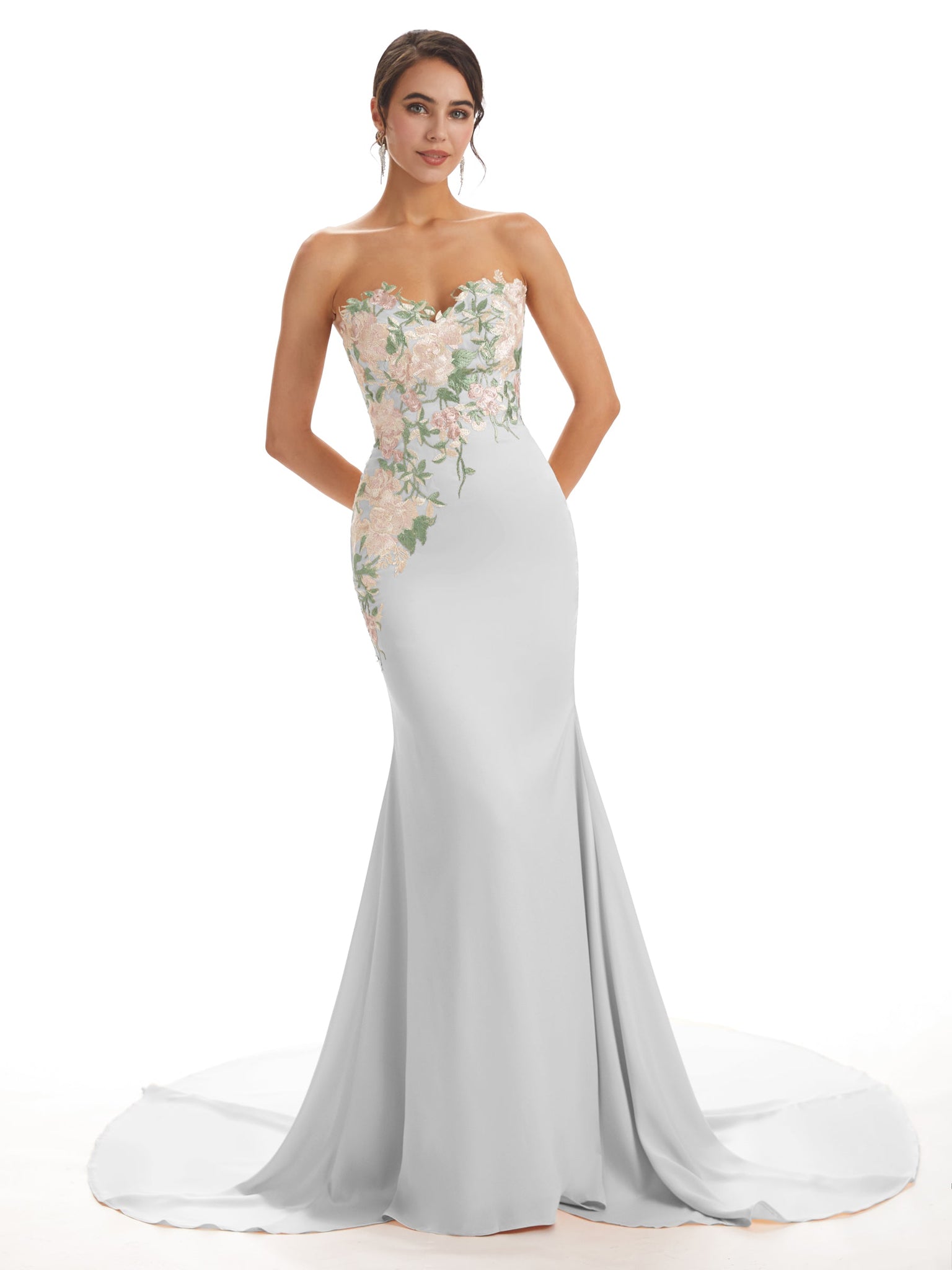 Modern Sweetheart Soft Satin Lace Applique Mermaid Long Wedding Bridesmaid Dresses - ChicSew – ChicSew